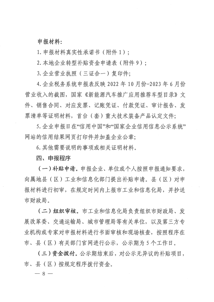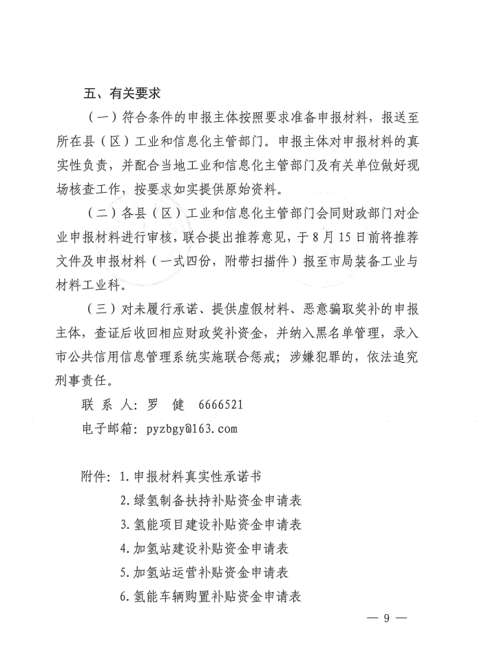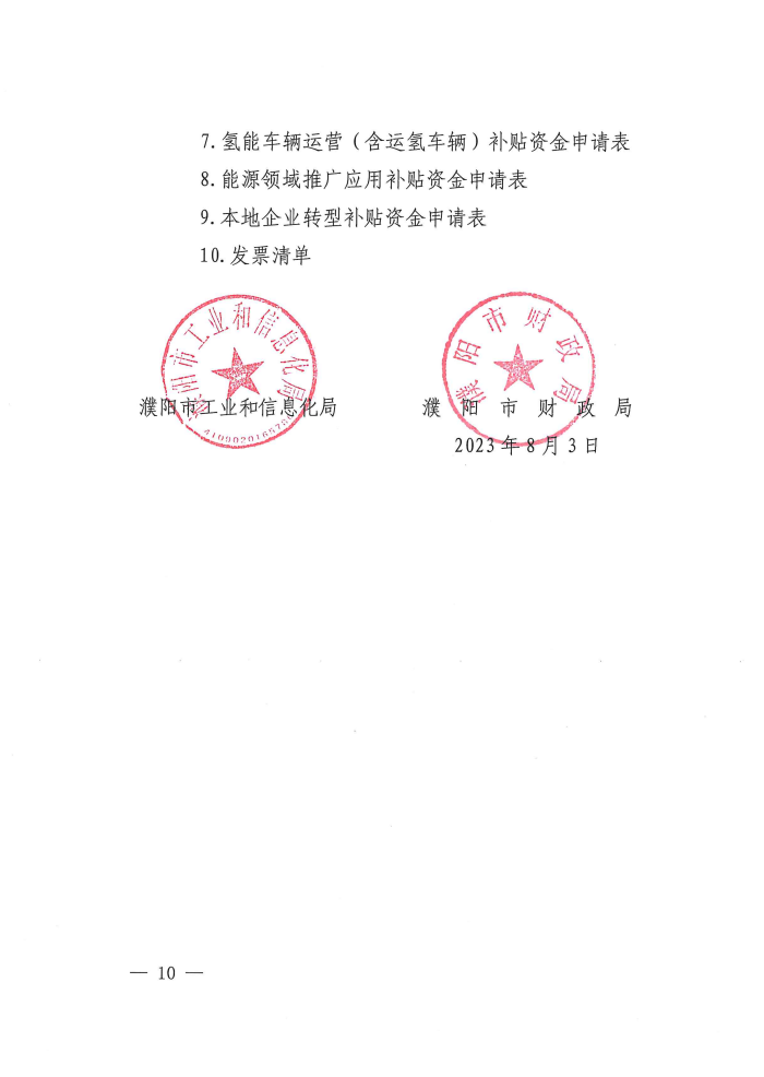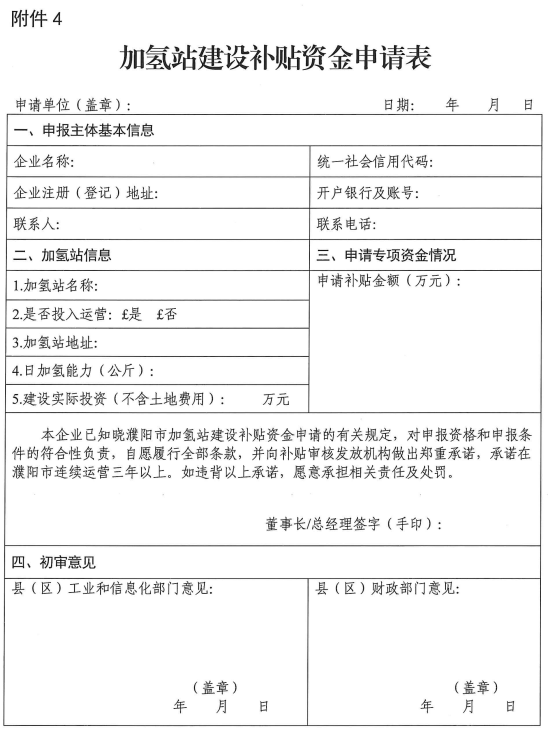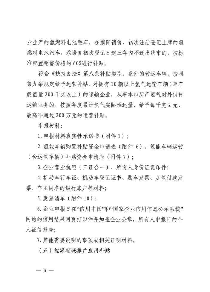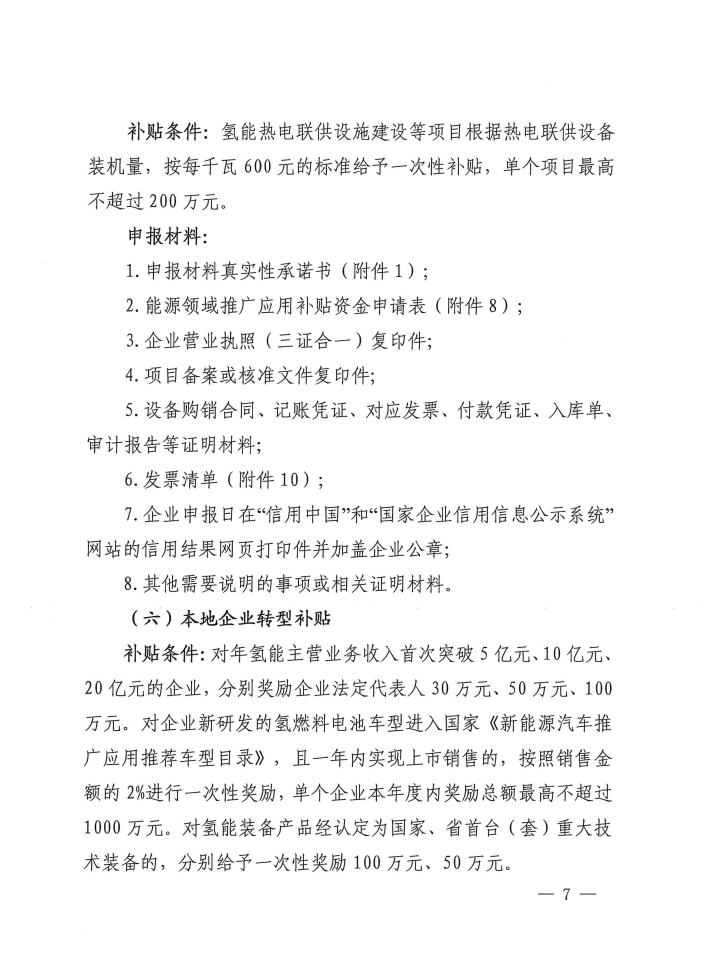 8月3日,河南濮陽(yang)市(shi)工(gong)信局、財政局聯(lian)(lian)合發(fa)布(bu)《關于開展(zhan)2023年(nian)促進氫能產業(ye)發(fa)展(zhan)專項(xiang)資金申(shen)報工(gong)作的通(tong)知》。文件指出(chu),其中(zhong)綠(lv)氫制備方面,對出(chu)廠價(jia)格不(bu)高(gao)于同純度工(gong)業(ye)副產氫平均(jun)出(chu)廠價(jia)格,且用于本(ben)市(shi)加氫站的,2022給(gei)(gei)予(yu)每千(qian)克15元(yuan)補貼,2023給(gei)(gei)予(yu)每千(qian)克12元(yuan)補貼,最高(gao)不(bu)超過(guo)(guo)500萬元(yuan)。氫能熱(re)電聯(lian)(lian)供(gong)設施(shi)建(jian)設等項(xiang)目根據裝機量(liang),按每千(qian)瓦600元(yuan)的標準給(gei)(gei)予(yu)一次性補貼,單個項(xiang)目最高(gao)不(bu)超過(guo)(guo)200萬元(yuan)。 氫(qing)能項(xiang)(xiang)目(mu)(mu)(mu)方面:對新建儲運氫(qing)項(xiang)(xiang)目(mu)(mu)(mu),給予設備(bei)實際投資總額10%補(bu)貼(tie),單個項(xiang)(xiang)目(mu)(mu)(mu)補(bu)貼(tie)最高不(bu)超過(guo)(guo)600萬(wan)元。本地企業轉(zhuan)型制氫(qing)、氫(qing)能裝(zhuang)備(bei)等(deng)產業,設備(bei)投資總額超過(guo)(guo)5000萬(wan)元且于兩年內建成投產的,給予設備(bei)投資額10%補(bu)貼(tie),單個項(xiang)(xiang)目(mu)(mu)(mu)最高補(bu)貼(tie)額不(bu)超過(guo)(guo)1000萬(wan)元。 2022年建成日(ri)加(jia)氫(qing)能(neng)(neng)力500千(qian)(qian)克(ke)以上,1000千(qian)(qian)克(ke)以下的加(jia)氫(qing)站(zhan),單站(zhan)最高(gao)補貼不超過(guo)500萬(wan)元(yuan);2023年建成的加(jia)氫(qing)站(zhan)補貼400萬(wan)元(yuan)。日(ri)加(jia)氫(qing)能(neng)(neng)力1000千(qian)(qian)克(ke)以上的加(jia)氫(qing)站(zhan)(含改(gai)擴建站(zhan)),單站(zhan)最高(gao)補貼不超過(guo)1000萬(wan)元(yuan)。加(jia)氫(qing)站(zhan)氫(qing)氣零售價格(ge)不超過(guo)每千(qian)(qian)克(ke)35元(yuan),每千(qian)(qian)克(ke)補貼15元(yuan)。 濮(pu)陽(yang)市工業和(he)信(xin)息化(hua)局(ju) 濮(pu)陽(yang)市財(cai)政局(ju) 關于(yu)開展2023年(nian)促進氫能產業發(fa)展專項資金 申報工作的通知 各縣(區)工業(ye)和信息(xi)化(hua)主管部門,財政局: 為(wei)切(qie)實(shi)推進我市(shi)(shi)氫能(neng)產(chan)(chan)業加快發(fa)(fa)(fa)展(zhan)(zhan)(zhan),有效發(fa)(fa)(fa)揮財(cai)政專(zhuan)項資(zi)金引導作用,根據《濮陽(yang)市(shi)(shi)人民政府關(guan)于(yu)印發(fa)(fa)(fa)濮陽(yang)市(shi)(shi)促進氫能(neng)產(chan)(chan)業發(fa)(fa)(fa)展(zhan)(zhan)(zhan)扶持(chi)辦(ban)法的通知(zhi)》(濮政〔2022〕15號,以下簡稱《扶持(chi)辦(ban)法》),結合工(gong)作實(shi)際,市(shi)(shi)工(gong)業和信息化局(ju)、市(shi)(shi)財(cai)政局(ju)組織各地開展(zhan)(zhan)(zhan)2023年促進氫能(neng)產(chan)(chan)業發(fa)(fa)(fa)展(zhan)(zhan)(zhan)專(zhuan)項資(zi)金申報工(gong)作。現將有關(guan)事(shi)項通知(zhi)如下: 一、支持方式 2023年市級(ji)支持氫能產業發(fa)展資金(jin)采取后補(bu)(bu)助(zhu)方式,補(bu)(bu)助(zhu)基(ji)數以發(fa)票核算(suan)(suan)為主,發(fa)票計算(suan)(suan)區間為2022年7月15日(ri)至2023年6月30日(ri)。 二、申報條件 (一(yi))注(zhu)冊(ce)登記地、稅(shui)務征管關(guan)系及統計(ji)關(guan)系在本(ben)市(shi)轄區(qu)內的獨立法人(ren)企業、單位(wei),以(yi)及個(ge)人(ren)。 (二)截止(zhi)申報日,企業(ye)未(wei)被“信用中國”列(lie)入(ru)“失信被執(zhi)行人”和“重(zhong)(zhong)大(da)稅收違(wei)法失信主體”,未(wei)被“國家企業(ye)信用信息公(gong)示系統”列(lie)入(ru)“嚴重(zhong)(zhong)違(wei)法失信名單”;個(ge)人申請資金(jin)的,須社會信用良好,未(wei)被列(lie)入(ru)“失信黑名單”。 (三)獲得氫能產業發展資(zi)金(jin)(jin)氫能項(xiang)目建設補(bu)貼(tie)支持的企(qi)業,不影響申(shen)報其他項(xiang)目資(zi)金(jin)(jin)。 (四)使用財政(zheng)資金建設的(de)項目(mu)、購(gou)買(mai)的(de)車輛等不在補貼(tie)范圍。 三、申報類別及材料 申(shen)請主(zhu)體(ti)自行編制(zhi)申(shen)報材料(liao)(liao),紙張(zhang)尺寸為A4,按以下申(shen)報材料(liao)(liao)順序雙面打印,每部分用彩頁隔開(kai)并裝訂(ding)成冊,證明材料(liao)(liao)復印件需(xu)加蓋單位公(gong)章(現場審核時須提(ti)供原件)。主(zhu)要內容如下: (一)綠氫制備(bei)扶持補貼 補貼(tie)條件:對綠氫出廠(chang)價(jia)格不(bu)高于(yu)同(tong)純度工(gong)業(ye)副產(chan)氫平均出廠(chang)價(jia)格,且用(yong)于(yu)本市(shi)加氫站加注的(de),按照年度累計供氫量,2022給予(yu)每(mei)千(qian)克15元(yuan)(yuan)補貼(tie),2023給予(yu)每(mei)千(qian)克12元(yuan)(yuan)補貼(tie),最高不(bu)超(chao)過500萬元(yuan)(yuan)。 申報材料: 1.申報材料真實(shi)性(xing)承(cheng)諾書(附(fu)件1); 2.綠氫(qing)制備扶持(chi)補貼(tie)資金申請表(biao)(附件2); 3.企業(ye)(ye)營業(ye)(ye)執照(三證合一)復印件; 4.銷售合同、記賬憑(ping)證(zheng)、對應發票、付款憑(ping)證(zheng)、出庫單、審計報(bao)告等證(zheng)明材料; 5.發票(piao)清單(附件10); 6.企業申報(bao)日在“信用(yong)(yong)中國”和(he)“國家企業信用(yong)(yong)信息公示系統”網站的信用(yong)(yong)結果(guo)網頁打印件并加蓋(gai)企業公章; 7.其他需要說(shuo)明(ming)的事項或相關證明(ming)材(cai)料。 (二)氫能項(xiang)目(mu)建設補貼 補(bu)(bu)貼(tie)(tie)條件:對新(xin)建高(gao)壓(ya)氣態(tai)、低(di)溫液態(tai)、無毒有機液體及固態(tai)等(deng)(deng)儲(chu)運氫(qing)(qing)項目(mu)的,給予(yu)設(she)(she)備(bei)(bei)(bei)