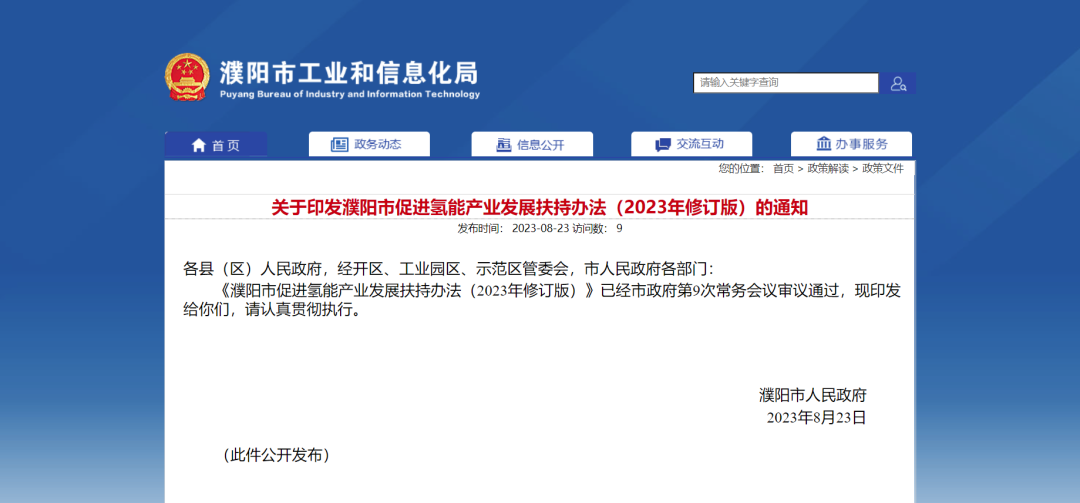 8月23日,河(he)南濮陽市(shi)印發《濮陽市(shi)促進氫能(neng)產業(ye)發展扶持辦法(fa)(2023年(nian)(nian)修(xiu)訂(ding)版(ban)(ban))》。相較于(yu)2022年(nian)(nian)版(ban)(ban),本次(ci)(ci)修(xiu)訂(ding)版(ban)(ban)提(ti)高(gao)了氫能(neng)在能(neng)源領(ling)域(yu)應(ying)用的補(bu)(bu)貼(tie)標(biao)準。此前2022年(nian)(nian)版(ban)(ban)文件提(ti)出,對投資建設企業(ye)按(an)熱(re)電(dian)聯供(gong)裝機600元(yuan)/kW給(gei)予(yu)一次(ci)(ci)性補(bu)(bu)貼(tie),單個項(xiang)目(mu)最(zui)高(gao)不(bu)超過200萬元(yuan)。而(er)2023年(nian)(nian)修(xiu)訂(ding)版(ban)(ban)提(ti)出,按(an)熱(re)電(dian)聯供(gong)裝機800元(yuan)/kW給(gei)予(yu)一次(ci)(ci)性補(bu)(bu)貼(tie),單個項(xiang)目(mu)補(bu)(bu)貼(tie)最(zui)高(gao)300萬元(yuan)。 關于(yu)印發濮陽市促進氫能產業發展(zhan)扶持(chi)辦法(2023年修(xiu)訂(ding)版)的通知 各縣(區)人民政府,經(jing)開區、工業園區、示范區管委會,市人民政府各部門: 《濮陽(yang)市促進氫能產業發展扶持辦法(2023年修訂版)》已(yi)經市政府第9次(ci)常務會(hui)議(yi)審議(yi)通(tong)過,現印發給(gei)你們,請認真貫徹(che)執行。 濮陽市人民政府 2023年8月(yue)23日(ri) (此件公開發布) 濮陽市促(cu)進氫能產(chan)業發展扶持辦(ban)法(2023年修訂(ding)版) 第一章總則 第一條為貫徹落實(shi)國(guo)家《氫能產(chan)業發(fa)(fa)展(zhan)(zhan)(zhan)中長期規劃(hua)(2021—2035年)》和(he)《河南(nan)省人民(min)(min)政(zheng)府辦(ban)(ban)公廳關于(yu)進(jin)一步加快(kuai)新(xin)能源(yuan)汽(qi)(qi)車產(chan)業發(fa)(fa)展(zhan)(zhan)(zhan)的(de)指導意(yi)見》(豫政(zheng)辦(ban)(ban)〔2022〕45號(hao))、《河南(nan)省人民(min)(min)政(zheng)府辦(ban)(ban)公廳關于(yu)印發(fa)(fa)河南(nan)省加快(kuai)傳統產(chan)業提質(zhi)發(fa)(fa)展(zhan)(zhan)(zhan)行動方案等(deng)三個方案的(de)通知(zhi)》(豫政(zheng)辦(ban)(ban)〔2022〕4號(hao))、《河南(nan)省人民(min)(min)政(zheng)府關于(yu)印發(fa)(fa)河南(nan)省“十四五”現代能源(yuan)體系和(he)碳達峰碳中和(he)規劃(hua)的(de)通知(zhi)》(豫政(zheng)〔2021〕58號(hao))等(deng)文件精神,切(qie)實(shi)加快(kuai)我市氫能產(chan)業發(fa)(fa)展(zhan)(zhan)(zhan),推進(jin)鄭(zheng)(zheng)汴(bian)洛(luo)濮氫走廊與鄭(zheng)(zheng)州(zhou)國(guo)家氫燃(ran)料電(dian)池汽(qi)(qi)車示范城市群融合發(fa)(fa)展(zhan)(zhan)(zhan),特制定本辦(ban)(ban)法。 第(di)二條(tiao)本(ben)辦法(fa)適(shi)用于(yu)注(zhu)冊登記地(di)、稅務征管關(guan)系及統計關(guan)系在本(ben)市轄區內的獨立(li)法(fa)人企(qi)業、單位。 第三條本辦法由(you)市工(gong)業(ye)和信(xin)息化局(ju)(ju)、財政局(ju)(ju)組織實(shi)施,市發展改革委、科(ke)技局(ju)(ju)、自然資源和規劃局(ju)(ju)、生態(tai)環境局(ju)(ju)、住房城(cheng)鄉(xiang)建設局(ju)(ju)、應急管理(li)(li)局(ju)(ju)、城(cheng)市管理(li)(li)局(ju)(ju)、公安局(ju)(ju)、交通(tong)運輸局(ju)(ju)、商(shang)務局(ju)(ju)、金融(rong)工(gong)作(zuo)局(ju)(ju)協同實(shi)施。 第二章支持政策 第四條加(jia)(jia)大綠(lv)(lv)氫(qing)(qing)制備(bei)扶持。建立氫(qing)(qing)能(neng)制備(bei)、檢(jian)測服務建設(she)項目審批(pi)“綠(lv)(lv)色(se)通道”,實行“一站式”行政(zheng)(zheng)審批(pi)。鼓勵企業發展(zhan)風電、光伏、生物質等綠(lv)(lv)氫(qing)(qing),對綠(lv)(lv)氫(qing)(qing)出(chu)(chu)廠價格不(bu)高(gao)于(yu)同純(chun)度工(gong)業副產氫(qing)(qing)平均出(chu)(chu)廠價格,且用于(yu)本市加(jia)(jia)氫(qing)(qing)站加(jia)(jia)注的(de),按照年(nian)度累計供(gong)氫(qing)(qing)量(liang)給予補助。首年(nian)給予每千克15元補貼,此后逐年(nian)按20%退(tui)坡,每年(nian)最(zui)高(gao)500萬元,補貼標準根據國家、省相關政(zheng)(zheng)策并(bing)結合我市實際適(shi)時進行調整。對綠(lv)(lv)氫(qing)(qing)制備(bei)企業給予一定風電、光伏等指標配備(bei)支(zhi)持。 第五(wu)條加強氫能儲運支持。對(dui)(dui)新建高壓(ya)氣(qi)(qi)態(tai)、低溫(wen)液態(tai)、無毒(du)有機液體(ti)及固(gu)態(tai)等儲運氫項目,給予(yu)設備(bei)(含軟件)實際投(tou)資總(zong)額10%的(de)補貼,單(dan)個項目補貼最高600萬元。對(dui)(dui)擁有10輛以(yi)上氫氣(qi)(qi)運輸車輛(單(dan)車載(zai)氫量200千克以(yi)上)的(de)運輸企業,從(cong)事本市所產氫氣(qi)(qi)對(dui)(dui)外銷(xiao)售運輸業務(wu)的(de),按(an)照年(nian)度累計氫氣(qi)(qi)實際承運量,給予(yu)每千克2元、每年(nian)最高200萬元的(de)運營補貼。 第六條(tiao)加(jia)(jia)快推(tui)進加(jia)(jia)氫(qing)(qing)站(zhan)(zhan)(zhan)建(jian)(jian)設(she)(she)。優化加(jia)(jia)氫(qing)(qing)站(zhan)(zhan)(zhan)建(jian)(jian)設(she)(she)審批(pi)流(liu)(liu)程(cheng),建(jian)(jian)立審批(pi)“綠色通道”和“一(yi)站(zhan)(zhan)(zhan)式”行(xing)政審批(pi)管理(li)制(zhi)度(du)。鼓勵在(zai)新建(jian)(jian)的(de)(de)加(jia)(jia)油、加(jia)(jia)氣、充電(dian)場站(zhan)(zhan)(zhan)內預(yu)留(liu)加(jia)(jia)氫(qing)(qing)設(she)(she)施(shi)空間;現(xian)有加(jia)(jia)油、加(jia)(jia)氣、充電(dian)場站(zhan)(zhan)(zhan)符(fu)合相關規范(fan)和安(an)全條(tiao)件(jian)的(de)(de),無需(xu)另行(xing)辦理(li)加(jia)(jia)氫(qing)(qing)站(zhan)(zhan)(zhan)規劃選址(zhi)、用(yong)(yong)(yong)(yong)地(di)手續,經(jing)審批(pi)可以(yi)利用(yong)(yong)(yong)(yong)現(xian)有土(tu)地(di)建(jian)(jian)設(she)(she)加(jia)(jia)氫(qing)(qing)站(zhan)