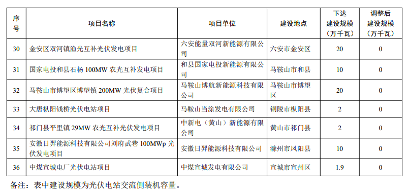 10月13日,安(an)徽(hui)省能(neng)源局發布關(guan)于調整2021年競爭性(xing)配置(zhi)光伏(fu)發電項目建設規(gui)模情況(kuang)的(de)公示(shi)。 公示(shi)顯(xian)示(shi),調整(zheng)(zheng)前下(xia)達光伏建設規(gui)模為331.25萬(wan)千(qian)瓦,共計(ji)(ji)36個(ge)項(xiang)目(mu)(mu);調整(zheng)(zheng)后建設規(gui)模為110.11萬(wan)千(qian)瓦,16個(ge)項(xiang)目(mu)(mu);擬削減(jian)17個(ge)項(xiang)目(mu)(mu),共計(ji)(ji)減(jian)少221.14萬(wan)千(qian)瓦光伏(fu)項目。 原文件下: 安徽省能源局關于調整2021年競爭性配置 光伏發電項目建設規模情況的公示 根據(ju)《安(an)(an)徽省(sheng)能(neng)(neng)(neng)(neng)源(yuan)(yuan)局關于(yu)印(yin)發2021年風電、光伏(fu)發電開發建(jian)設(she)方案的(de)(de)通知(zhi)》(皖能(neng)(neng)(neng)(neng)源(yuan)(yuan)新(xin)能(neng)(neng)(neng)(neng)〔2021〕61號)、《安(an)(an)徽省(sheng)能(neng)(neng)(neng)(neng)源(yuan)(yuan)局關于(yu)對(dui)(dui)納入2021年建(jian)設(she)規模光伏(fu)發電項(xiang)(xiang)目實(shi)施分類處理(li)的(de)(de)通知(zhi)》(皖能(neng)(neng)(neng)(neng)源(yuan)(yuan)新(xin)能(neng)(neng)(neng)(neng)函(han)〔2023〕51號)等文件(jian)要求,結合(he)項(xiang)(xiang)目梳理(li)情況及(ji)市縣發展改革委意見,擬調整受水利、用地政(zheng)策(ce)調整等原因的(de)(de)項(xiang)(xiang)目建(jian)設(she)規模,現(xian)予(yu)公示,公示時間自發布之日起5個(ge)工作日。如(ru)有意見和建(jian)議(yi),請在公示期內以來(lai)人或(huo)署名來(lai)信(xin)(包括(kuo)電子信(xin)函(han))方式(shi)向省(sheng)能(neng)(neng)(neng)(neng)源(yuan)(yuan)局反映,對(dui)(dui)匿名方式(shi)提出異議(yi)的(de)(de)不(bu)予(yu)受理(li)。 附(fu)件:擬調整建(jian)設規模(mo)的光伏發電項目(mu)清單(dan) 主辦處室:新能源和可(ke)再生能源產業發展處 聯系電話;0551-63609410 郵政地址(zhi):合肥市包(bao)河區中山(shan)路(lu)1號省行政中心2號樓3054室 郵政編碼(ma):230091 電子(zi)郵箱:ahsnyj 163.com 上一篇: 特種石墨巨頭進軍鈣鈦礦領域!