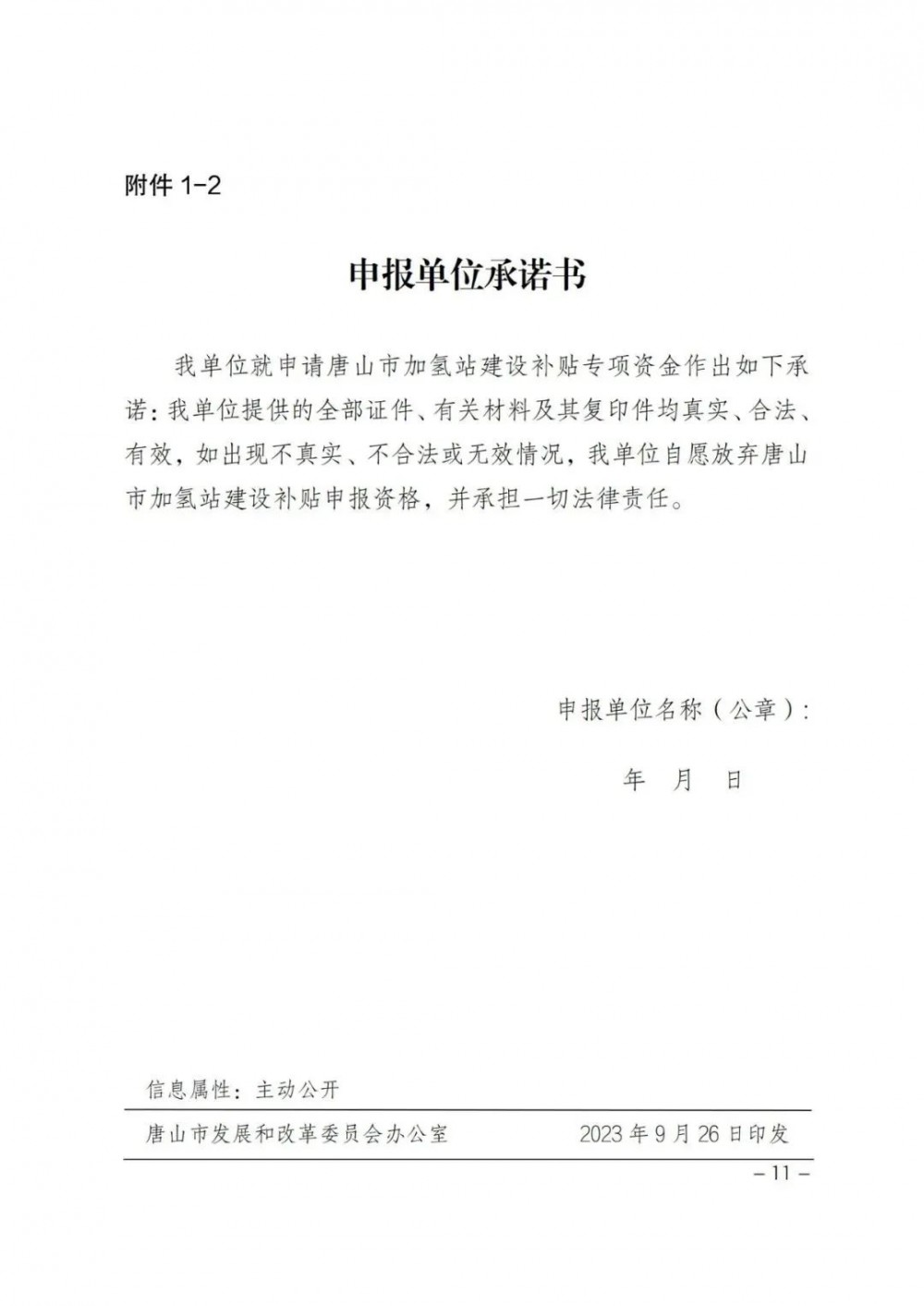 10月17日,唐(tang)山(shan)市發改(gai)委(wei)發布《唐(tang)山(shan)市加氫(qing)站建設補(bu)貼(tie)實施(shi)細則》,提出(chu)由市發改(gai)委(wei)負責(ze)編制年度預算、項(xiang)目申報、出(chu)具(ju)資(zi)金分配方案以及(ji)資(zi)金使用監督和(he)(he)績效管(guan)理(li)(li)工作,市財政局(ju)負責(ze)預算管(guan)理(li)(li)和(he)(he)資(zi)金撥付。 補(bu)貼范(fan)圍:對(dui)在(zai)本市行政區域(yu)范(fan)圍內,列(lie)入全市加(jia)(jia)氫站(zhan)發展建設(she)計劃(hua),在(zai)2023年1月(yue)1日(ri)(ri)至2025年12月(yue)31日(ri)(ri)建成(含改(gai)擴建)投運(yun)的(de)車用(yong)社會(hui)經營性(xing)固(gu)定(ding)式加(jia)(jia)氫站(zhan)和(he)企業(ye)自用(yong)固(gu)定(ding)式加(jia)(jia)氫站(zhan),日(ri)(ri)加(jia)(jia)氫能力(li)均需在(zai)1000公斤及(ji)以上,氫能供應指標通過國家(jia)考(kao)核的(de)加(jia)(jia)氫站(zhan)運(yun)營主(zhu)體給予建設(she)補(bu)貼,其中社會(hui)經營性(xing)加(jia)(jia)氫站(zhan)氫氣銷售價格不超過30元/公斤。以上條(tiao)件(jian)需同時滿(man)足。 補貼標(biao)準:對符(fu)合條件(jian)的車用社會(hui)經營性固定式加(jia)氫站和企業自用固定式加(jia)氫站,按標(biao)準給予一(yi)次性建設補貼,其中(zhong): 1.2023年建(jian)成投(tou)運(yun)的(de)加氫(qing)站補(bu)貼200萬(wan)元。 2.2024年(nian)建成投運(yun)的加氫站補(bu)貼100萬(wan)元。 3.2025年建(jian)成投運(yun)的(de)加氫站補貼(tie)50萬元。 獎勵資金上限不(bu)超過加氫站建設實際(ji)投資額(不(bu)含土地(di))。 原文如下: 關于印發《唐山市加氫站建設補貼實施細則》的通知 為加快我市(shi)(shi)綠(lv)色能源(yuan)體(ti)系建(jian)設,促進氫能產業高質量發展,提速加氫站建(jian)設,根(gen)據市(shi)(shi)發展改(gai)革(ge)委、市(shi)(shi)財政局、市(shi)(shi)工(gong)業和信息化局、市(shi)(shi)科學技術局《關(guan)于支持燃料電池汽車示范城市(shi)(shi)建(jian)設的若干意見》(唐發改(gai)能源(yuan)〔2023〕34號(hao))和中共(gong)第十一屆(jie)(jie)唐山市(shi)(shi)委專題會議紀要(十一屆(jie)(jie)〔2023〕第60號(hao)),特制訂本細則。 一、管理職責 市(shi)發展和(he)改革(ge)委員會負(fu)責(ze)編制年度預(yu)算、項目申報、出具(ju)資(zi)金分配方(fang)案以及資(zi)金使用監督(du)和(he)績效管(guan)理(li)工作(zuo)。市(shi)財政局(ju)負(fu)責(ze)預(yu)算管(guan)理(li)和(he)資(zi)金撥付。 二、補貼對象、范圍與標準 (一)補貼對(dui)象:本市行政(zheng)區域內列入全市加(jia)(jia)氫站發展建設計劃,建成投運的社會經(jing)營性固定式加(jia)(jia)氫站和企業(ye)自(zi)用固定式加(jia)(jia)氫站。 (二)補(bu)貼范圍:對在本市行(xing)政區域范圍內,列入全市加(jia)(jia)(jia)氫(qing)(qing)站發展(zhan)建(jian)(jian)設計劃,在2023年1月1日(ri)至2025年12月31日(ri)建(jian)(jian)成(含改擴建(jian)(jian))投運的車用社(she)會(hui)經(jing)營(ying)(ying)(ying)性(xing)固(gu)定(ding)(ding)式(shi)加(jia)(jia)(jia)氫(qing)(qing)站和企業自(zi)用固(gu)定(ding)(ding)式(shi)加(jia)(jia)(jia)氫(qing)(qing)站,日(ri)加(jia)(jia)(jia)氫(qing)(qing)能力(li)均需(xu)在1000公斤及以上,氫(qing)(qing)能供應指(zhi)標通過國家考核的加(jia)(jia)(jia)氫(qing)(qing)站運營(ying)(ying)(ying)主體(ti)給予建(jian)(jian)設補(bu)貼,其中社(she)會(hui)經(jing)營(ying)(ying)(ying)性(xing)加(jia)(jia)(jia)氫(qing)(qing)站氫(qing)(qing)氣銷售(shou)價格不超(chao)過30元/公斤。以上條件需(xu)同時滿足。 其中“列(lie)入(ru)全市加(jia)氫(qing)站(zhan)發展建設(she)計(ji)劃”以取得審批手續為(wei)準(zhun)(zhun),“建成(cheng)時(shi)(shi)間(jian)”以加(jia)氫(qing)站(zhan)建設(she)驗收(shou)時(shi)(shi)間(jian)為(wei)準(zhun)(zhun),“投運時(shi)(shi)間(jian)”以首(shou)次營業時(shi)(shi)間(jian)為(wei)準(zhun)(zhun),“日加(jia)氫(qing)能力”按壓縮機12小時(shi)(shi)額定(ding)工作能力計(ji)算,“社會經營性加(jia)氫(qing)站(zhan)氫(qing)氣銷(xiao)售(shou)價格”以發票為(wei)準(zhun)(zhun),“氫(qing)能供應指標通過國家考核”以接入(ru)指定(ding)的(de)第(di)三方(fang)大(da)數(shu)據平臺為(wei)準(zhun)(zhun)。已(yi)享受國家或地方(fang)財(cai)政資金支(zhi)持建設(she)的(de)加(jia)氫(qing)站(zhan)及已(yi)享受過本政策(ce)資金支(zhi)持后又(you)改擴建的(de)加(jia)氫(qing)站(zhan),不再給予建設(she)補貼(tie)。 (三)補貼標(biao)準:對符合條件的車用社會(hui)經(jing)營(ying)性固定式加氫(qing)站(zhan)和企(qi)業自用固定式加氫(qing)站(zhan),按標(biao)準給予(yu)一次性建設補貼,其中: 1.2023年建成投運的加氫站補(bu)貼200萬(wan)元。 2.2024年建成投運(yun)的加氫站補貼(tie)100萬元。 3.2025年建成投運的加氫站(zhan)補(bu)貼50萬元。 獎勵資金上限不超過加氫站建設實際投(tou)資額(不含土地)。 三、補貼資金申請與下達 (一)申報條件 申報(bao)建設補貼(tie)資金(jin)必(bi)須同(tong)時具備以下(xia)條(tiao)件: 1.加氫站產權單位為在本市注冊、正(zheng)常運營的(de)(de)合法的(de)(de)獨立法人(ren)企業; 2.審批(pi)手續完備,所建設的加氫站符合本市(shi)相(xiang)關規劃,建設和驗(yan)收符合國(guo)家、省、市(shi)相(xiang)關技術標(biao)準、設計規范、建設標(biao)準和管理要求; 3.加氫站接(jie)入市發展改革委指定的第三(san)方大數據平臺,實現加氫站狀態信息和運營數據互聯(lian)互通。 (二)申報主體 建(jian)(jian)設(she)(she)補貼(tie)資(zi)金由(you)加氫站運(yun)
