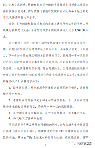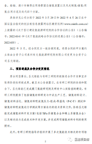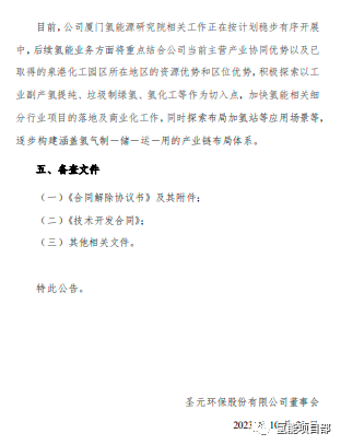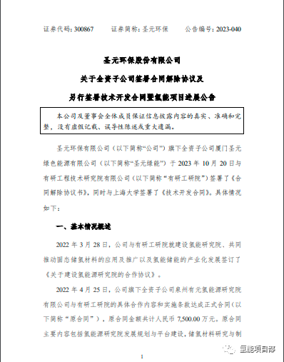 10月23日,圣(sheng)元環保股份有(you)限公(gong)司(si)(si)發(fa)布關(guan)于全資(zi)子公(gong)司(si)(si)簽署合(he)同解(jie)除協(xie)議及另行簽署技(ji)術開發(fa)合(he)同暨氫能項目進展公(gong)告。 圣元綠能(neng)(neng)(neng)(neng)與有研工研院合同解除的(de)同時,亦與上海大學(xue)合作(zuo)并另 行簽署《技術開(kai)發合同》,繼續推進高性(xing)(xing)(xing)能(neng)(neng)(neng)(neng)TiFe系儲氫合金(jin)研發項目的(de)實施。雙方在TiFe系儲氫材料的(de)活(huo)化性(xing)(xing)(xing)能(neng)(neng)(neng)(neng)、吸(xi)放氫性(xing)(xing)(xing)能(neng)(neng)(neng)(neng)、循環(huan)性(xing)(xing)(xing)能(neng)(neng)(neng)(neng)、再生工藝以及其(qi)儲氫罐的(de)吸(xi)放氫性(xing)(xing)(xing)能(neng)(neng)(neng)(neng)的(de)數(shu)值模擬計(ji)算(suan)等方面的(de)應用開(kai)展(zhan)合作(zuo)。 圣(sheng)元綠(lv)能公司廈(sha)門氫(qing)能源(yuan)研究(jiu)院相關(guan)工(gong)(gong)(gong)作正在按計劃穩步有序開展(zhan)中,后續氫(qing)能業務方(fang)面將重點結合公司當前主營(ying)產業協同優(you)勢(shi)以及已 取(qu)得(de)的(de)泉港化(hua)(hua)工(gong)(gong)(gong)園區所在地(di)區的(de)資(zi)源(yuan)優(you)勢(shi)和區位優(you)勢(shi),積極探索(suo)以工(gong)(gong)(gong)業副產氫(qing)提純、垃圾(ji)制綠(lv)氫(qing)、氫(qing)化(hua)(hua)工(gong)(gong)(gong)等(deng)(deng)作為切(qie)入點,加快(kuai)氫(qing)能相關(guan)細分行業項目的(de)落地(di)及商業化(hua)(hua)工(gong)(gong)(gong)作,同時探索(suo)布(bu)局加氫(qing)站(zhan)等(deng)(deng)應用場景等(deng)(deng), 逐(zhu)步構建(jian)涵(han)蓋氫(qing)氣制-儲-運(yun)-用的(de)產業鏈布(bu)局體系。 詳情如下: