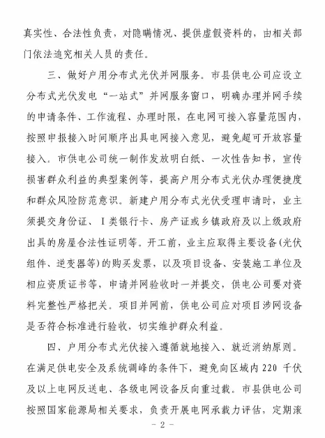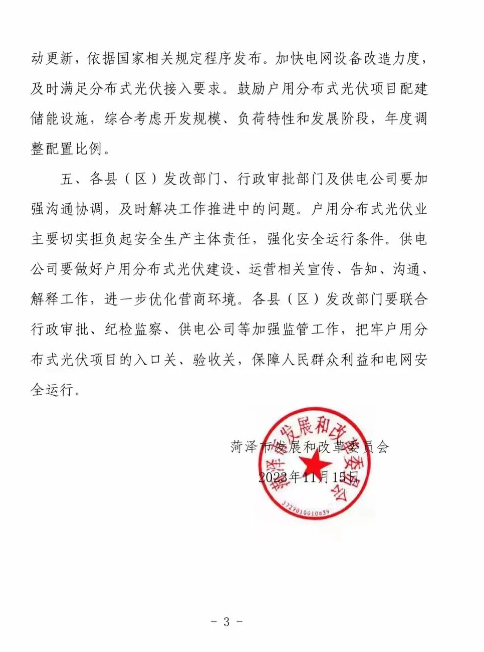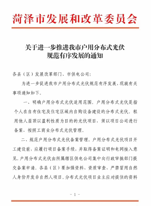 11月15日山東菏澤市(shi)發展(zhan)和(he)改革委員會下(xia)《發關(guan)于進一步推進我(wo)市(shi)戶用分布式(shi)光(guang)伏規范有序發展(zhan)的通(tong)知》 通知(zhi)中提(ti)到,租用他人(ren)屋頂以盈利(li)性質為目(mu)的的光(guang)伏項目(mu),須以項目(mu)公(gong)司進行備案,按照工(gong)商業分(fen)布式光(guang)伏管理。 1)做好戶用分布式光伏并網服務。 市縣(xian)供電公司(si)應設立分布式光伏(fu)發電(dian)(dian)“一站(zhan)式”并網(wang)服務窗(chuang)口(kou),明(ming)確辦理(li)并網(wang)手續(xu)的申請(qing)條(tiao)件、工作流程、辦理(li)時(shi)限,在電(dian)(dian)網(wang)可接入(ru)(ru)容量范圍內,按照申報(bao)接入(ru)(ru)時(shi)間順序出具(ju)電(dian)(dian)網(wang)接入(ru)(ru)意見,避免超可開放(fang)容量接入(ru)(ru)。 2)戶用分布式光伏接入遵循就地接入、就近消納原則。 在(zai)滿足供電安全及系統調(diao)峰(feng)的條件下,避免向區域內 220 千伏及以上電網(wang)反送(song)電、各級電網(wang)設備反向重過載。 鼓勵戶用分(fen)布式(shi)光伏項目(mu)配(pei)建儲能設施(shi),綜(zong)合考慮開發規(gui)模、負荷特性和發展階(jie)段,年度調整配(pei)置比(bi)例。