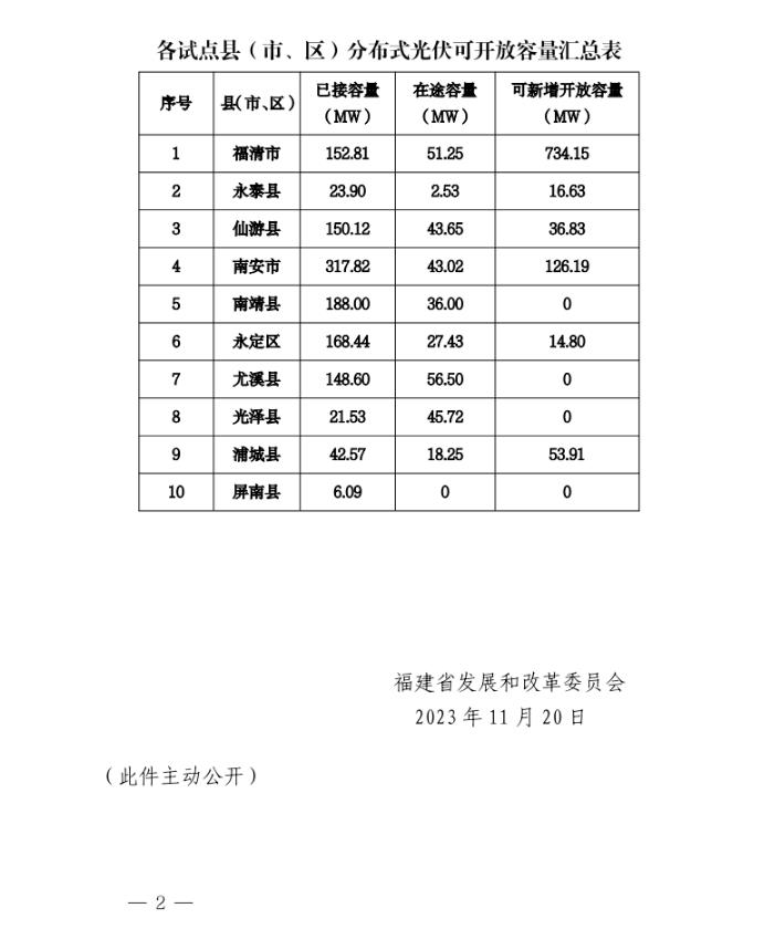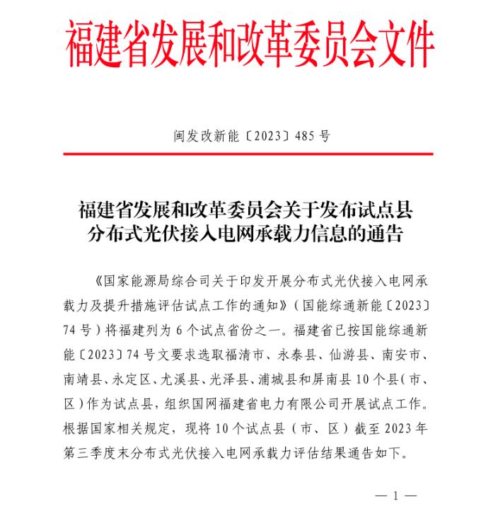 11月20日,福建省發改委發布《關于發布試點縣分布式光伏接入電網承載力信息的通告》,福建省已按國能綜通新能〔2023〕74號文要求選取福清市、永泰縣、仙游縣、南安市、南靖縣、永定區、尤溪縣、光澤縣、浦城縣和屏南縣10個縣(市、區)作為試點縣,組織國網福建省電力有限公司開展試點工作。 截至2023年第三季度末,上述10個試點縣(市、區)分布式光伏接入電網承載力評估結果為:已接入總容量1219.88MW,在途總容量324.35MW,可新增開放總容量982.51MW。 關于可新增開放總量的地區設置,通告的解讀文件表示,10個試點縣(市、區)中,南靖等4個縣的可新增開放容量為0。主要原因是當地的負荷較小,小水電等其它各類電源較多,分布式光伏已無法在配電網消納,再向220kV主網傳輸將違反《分布式電源接入電網承載力評估導則》(DL/T2014-2019)要求。 詳情如下: 《福建省發展和改革委員會關于發布各試點縣分布式光伏接入電網承載力信息的通告》解讀 根據國家能源局工作部署,我委發布了《福建省發展和改革委員會關于發布各試點縣分布式光伏接入電網承載力信息的通告》(以下簡稱《通告》),現就《通告》有關內容解讀如下: 一、《通告》發布的背景 為貫徹落實黨的二十大精神,積極穩妥推進碳達峰碳中和工作,充分發揮分布式光伏在推進我國新型能源體系建設中的積極作用,著力解決分布式光伏接網受限問題,于2023年6月印發的《國家能源局綜合司關于印發開展分布式光伏接入電網承載力及提升措施評估試點工作的通知》(國能綜通新能〔2023〕74號)將山東、黑龍江、河南、浙江、廣東和福建列為試點省,開展分布式光伏接入電網承載力及提升措施評估工作。按照試點工作要求,我委會同國網福建省電力有限公司在全省范圍內選取了福清等10個縣(市、區)作為試點縣,國網福建省電力有限公司已按規定開展相關評估工作。現將10個試點縣截至2023年第三季度末的分布式光伏接入電網承載力評估結果向社會發布。 二、試點縣選取及建設受限的情況說明 2023年以來,福建省分布式光伏開發出現井噴式發展態勢。2023年1月至10月,全省分布式光伏新增投產規模達282萬千瓦,保守預測全年新增投產規模可達300萬千瓦以上,遠超“十四五”頭兩年的合計增長量。隨著分布式光伏規模的快速提升,在部分縣域內已出現調節能力不足、反送功率受阻、電壓偏差過大等制約分布式光伏接入的問題。為順利做好本次評估工作,我委會同國網福建省電力有限公司按國家規定的上限要求在全省范圍內選取了福清等10個縣(市、區)試點縣,試點縣選取的原則是分布式光伏滲透率高、接入容量大、電網承載力不足的縣域,同時充分考慮縣域可再生能源資源條件、發展情況、電網特點、地區負荷特性等因素,并綜合區域經濟現狀以及屋頂分布式光伏建設特點、開發積極性等情況。通過評估,充分體現我省不同區域分布式光伏并網存在的不同“堵點”“難點”和“痛點”。 10個試點縣(市、區)中,南靖等4個縣的可新增開放容量為0。主要原因是當地的負荷較小,小水電等其它各類電源較多,分布式光伏已無法在配電網消納,再向220kV主網傳輸將違反《分布式電源接入電網承載力評估導則》(DL/T2014-2019)要求。 三、《通告》發布的主要目的 根據國能綜通新能〔2023〕74號文要求,通過發布相關試點縣域的階段性可開放容量信息,合理引導企業、居民做好分布式光伏開發建設工作。同時,推動電網企業通過對制約分布式光伏接入的相關問題開展專題分析研究,制定針對性解決措施,滿足分布式光伏接入需求,為我國分布式光伏的可持續康健發展提供借鑒。 聯系處室:新能源和可再生能源處 聯系方式:0951-87063448