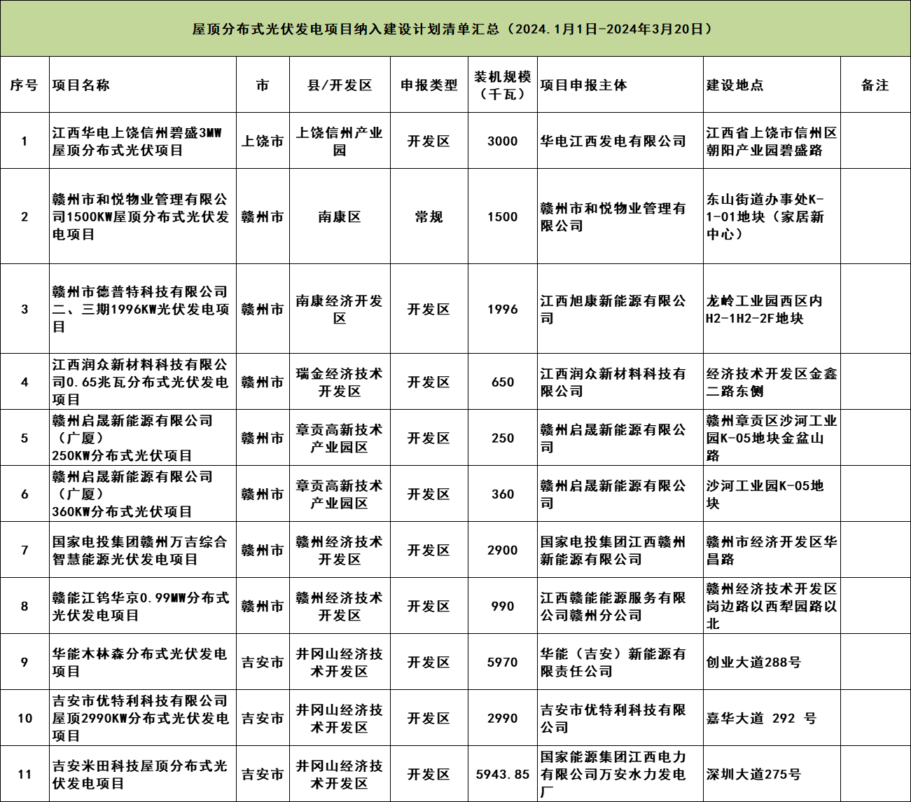 3月21日,江西省屋頂(ding)分布式光(guang)伏發電項(xiang)目(mu)納入建設計劃項(xiang)目(mu)清單發布(2024年1月1日-2024年3月20日),共計94個分布式光(guang)伏項(xiang)目(mu),總(zong)規模(mo)189.8MW。 原文如下: 按照(zhao)《江西(xi)(xi)省(sheng)(sheng)發(fa)展改(gai)革委(wei)江西(xi)(xi)省(sheng)(sheng)能(neng)源局關于補充完善(shan)〈江西(xi)(xi)省(sheng)(sheng)光伏發(fa)電(dian)、風電(dian)項目開發(fa)工作指南〉有關事項的通知》要求(qiu),屋頂(ding)分布式光伏發(fa)電(dian)規(gui)劃管理已下放到設(she)區市能(neng)源主(zhu)管部門。