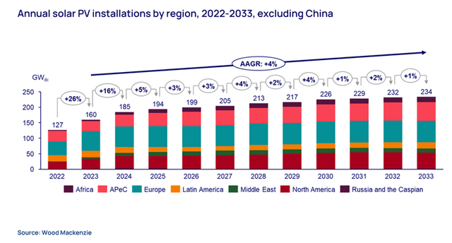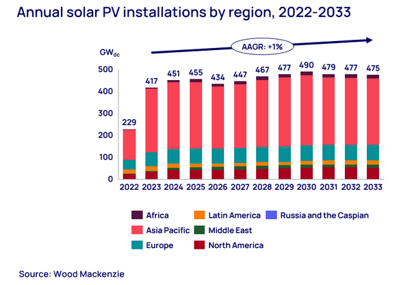 根據調研機構Wood Mackenzie公司日前發布的一份研究報告,全球在2023年安裝的光伏系統裝機容量達到417GW,與2022年相比增長了80%以上。光伏組件目前的超低價格加快了歐洲和中國安裝光伏系統的速度。中國仍然是全球規模最大的光伏市場,去年占全球安裝的光伏系統裝機容量的60%以上。 政府和企業層面的脫碳承諾仍然是推動全球光伏裝機容量增長的關鍵因素。合同拍賣項目嚴格的并網期限以及不斷增長的電力需求,使Wood Mackenzie對馬來西亞、沙特阿拉伯和伊朗等光伏市場的近期預測實現兩位數的增長。能源密集型行業對沖電價波動的需求不斷推動了工業和商業(C&I)光伏系統的開發熱潮,以及歐洲簽署更多的場外和現場電力采購協議。 圖1 全球按地區劃分的2022年~2033年安裝的光伏系統裝機容量(GW) 經濟增長放緩導致Wood Mackenzie公司對未來10年全球光伏市場前景展望持平 Wood Mackenzie公司對預計2024年全球安裝的光伏系統裝機容量達到430GW以上,與2023年相比增長3%。 盡管過去幾年全球光伏市場增長強勁,Wood Mackenzie公司預計未10年的平均年增長率將持平。這是由Wood Mackenzie公司對中國光伏市場的展望所驅動的。該公司預計,隨著中國建設的“可再生能源”基地(政府支持的可再生能源開發專用區域)有望如期實現并網,2024年和2025年安裝的光伏系統裝機容量將適度增長。 然而,Wood Mackenzie公司預計2026年中國安裝光伏系統裝機容量將下降9%,這是因為,隨著上一輪國家計劃中的光伏系統已經安裝,在2028年下一輪計劃采購之前,光伏系統的開發和部署將會放緩。 在實施國家基礎設施發展計劃的最初幾年可能面臨政策調整,并且光伏開發商和投資商對光伏項目的投資采取更為謹慎的態度。長期來看,光伏系統裝機容量的增長將受到輸電基礎設施和電網容量的限制。 Wood Mackenzie公司對中國光伏市場的展望可能有上行空間。在該公司設定的理想案例中,中國在未來10年將新增600GW的光伏系統,與基本案例相比增長24%。其理想案例假設中國光伏組件制造行業的前景更為樂觀。如果光伏組件產能的增長超過目前的預期,光伏組件價格保持在目前的超低水平,可能會推動中國安裝的光伏系統裝機容量的額外增長。 在展望除中國以外的全球光伏市場前景時,Wood Mackenzie公司預計未來10年的平均增長率為4%。雖然中東和非洲等光伏市場的年平均增長率在12%~14%之間,但歐洲和拉丁美洲的增長相對平穩。 圖2 全球按地區劃分(不包括中國)的2022年~2033安裝的光伏系統裝機容量(GW) 電網基礎設施不足、需求低迷和保護主義限制了光伏市場的增長潛力 輸配電電網擴建和升級緩慢仍然是光伏系統裝機容量增長的最大限制因素。與2022年相比,歐洲去年安裝的光伏系統裝機容量增長了40%以上,但電網規模無法跟上光伏系統裝機容量的快速擴張。Wood Mackenzie公司估計歐盟電網每年需要6000億歐元的投資才能實現脫碳目標,并允許大規模可再生能源發電設施和光伏系統的裝機容量在未來十年內保持增長。 但電網基礎設施的建設卻有所滯后。類似的瓶頸在全球大多數國家和地區正在惡化,一些國家等待并網的時間長達10年以上。電網無法擴建和升級的問題在南美洲尤其嚴重,輸電基礎設施匱乏限制了南美洲近期和中期光伏市場的發展前景。 電力需求增長放緩也影響了Wood Mackenzie公司對全球光伏市場的長期展望。交易和供暖電氣化趨勢的進展低于預期,電力需求增長有限,這將在未來十年抑制歐洲安裝光伏系統裝機容量的增長。 過去兩年出現的光伏組件采購熱潮依賴于光伏組件價格再創新低,但日益高漲的保護主義情緒和即將出臺的貿易防御措施,可能會危及光伏經濟在某些市場的競爭力。歐盟委員會推出的《凈零工業法案》致力提高關鍵可再生能源組件的生產。此外,加拿大最近通過了一項法案,要求證明光伏產品供應鏈是可追溯的,沒有強迫勞動。這些政策可能會導致進口光伏組件的限制,從而抑制其未來幾年光伏市場的增長。 上一篇: 贊比亞伊亭皮太陽能項目并網發電