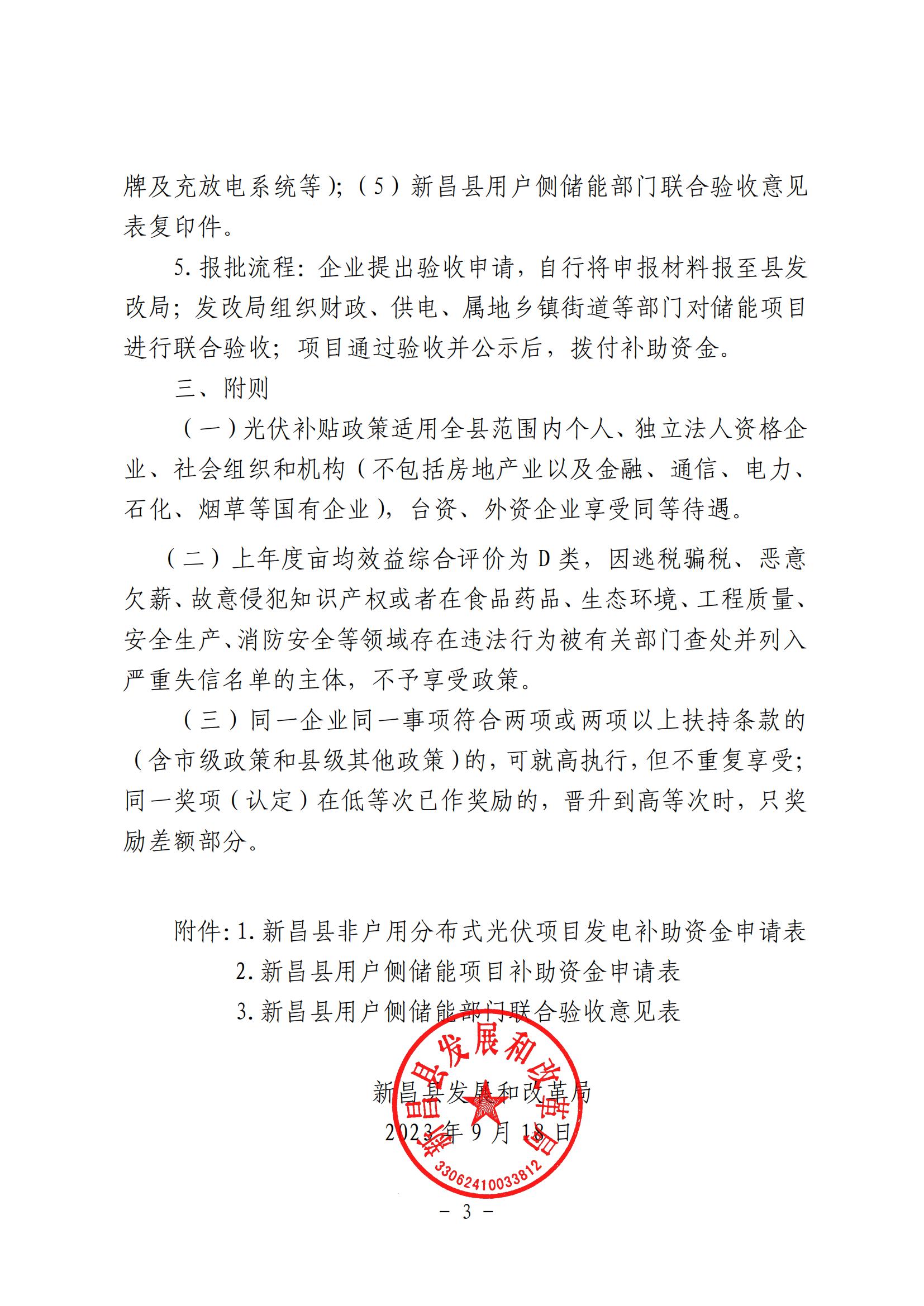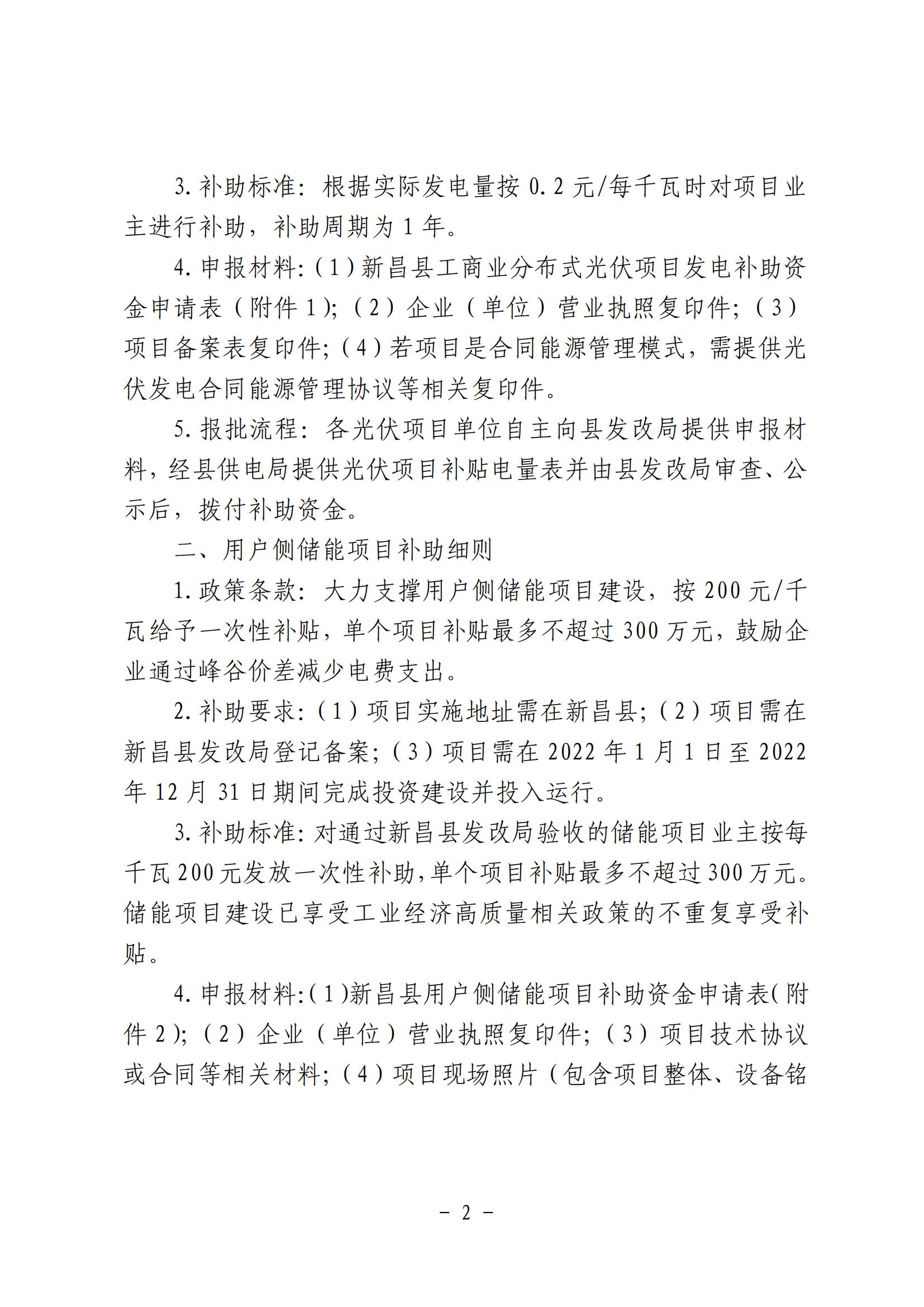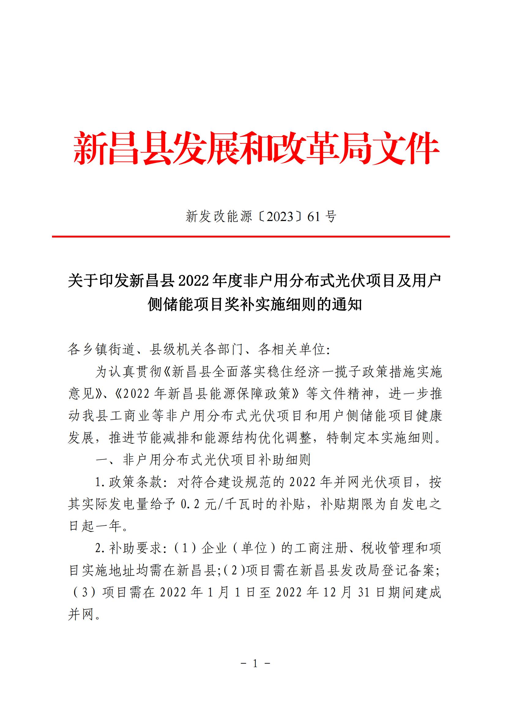 4月24日,新昌縣人民政府發布關于開展第二批2022年度非戶用分布式光伏項目獎補的通知,通知指出,對符合建設規范的2022年并網光伏項目,按其實際發電量給予0.2元/千瓦時的補貼,補貼期限為自發電之日起一年。 補助要求:(1)企業(單位)的工商注冊、稅收管理和項目實施地址均需在新昌縣;(2)項目需在新昌縣發改局登記備案;(3)項目需在2022年1月1日至2022年12月31日期間建成并網。 補助標準:根據實際發電量按0.2元/每千瓦時對項目業主進行補助,補助周期為1年。 原文如下: 關于開展第二批2022年度非戶用分布式 光伏項目獎補的通知 各相關企業(單位): 根據《關于印發新昌縣2022年度非戶用分布式光伏項目及用戶側儲能項目獎補實施細則的通知》(新發改能源〔2023〕61號)文件精神,我局組織申報新昌縣第二批2022年度非戶用分布式光伏項目財政獎補。現將有關信息通知如下。 1.各申報企業按照實施細則通知要求準備相關申報材料,并于5月8日前把相關材料送至發改局能源科。 2.此次光伏發電量補貼期限為自發電之日起一年。 3.申報對象為2022年度內并網發電的光伏項目,去年已領取該財政獎補的光伏項目不再享受。 4.如有其他問題,請聯系發改局能源科,聯系電話:86019958。 附件:關于印發新昌縣2022年度非戶用分布式光伏項目及用戶側儲能項目獎補實施細則的通知 新昌縣發展和改革局 2024年4月24日 新昌縣非戶用分布式光伏項目發電補助資金申請表