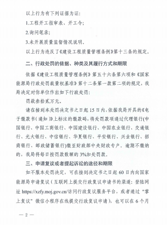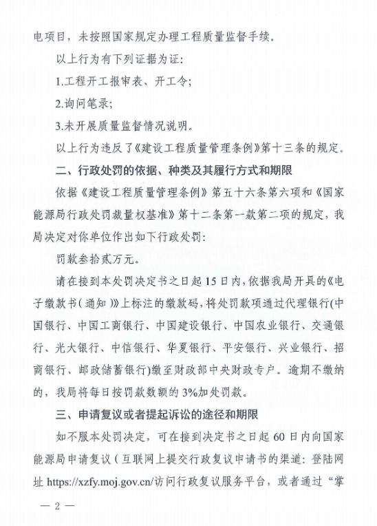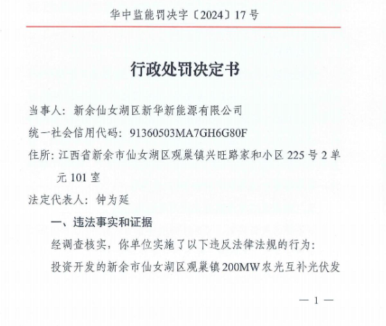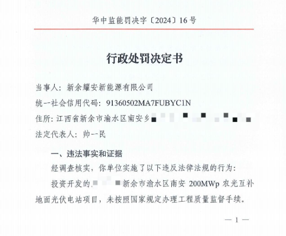 近日,國家能源局華中監管局發布了華中監能罰決字〔2024〕14號、15號、16號、17號行政處罰決定書。 其中,新余市渝水區南安200MWp農光互補地面光伏電站項目和新余市仙女湖區觀巢鎮200MW農光互補光伏發電項目,因未能依照國家相關規定辦理工程質量監督手續,被行政處罰。 新余耀安新能源有限公司 經調查核實,你單位實施了以下違反法律法規的行為:投資開發的新余市渝水區南安200MWp農光互補地面光伏電站項目,未按照國家規定辦理工程質量監督手續。 新余仙女湖區新華新能源有限公司 經調查核實,你單位實施了以下違反法律法規的行為:投資開發的新余市仙女湖區觀巢鎮200MW農光互補光伏發電項目,未按照國家規定辦理工程質量監督手續。 上一篇: 因政策調整,一光伏特許經營項目終止!