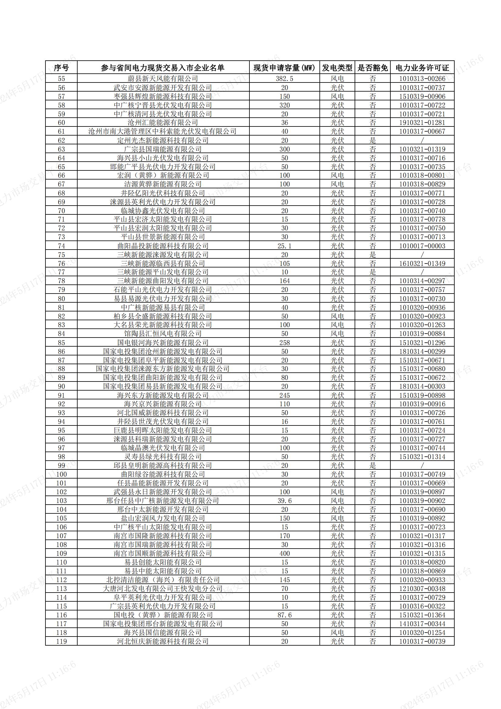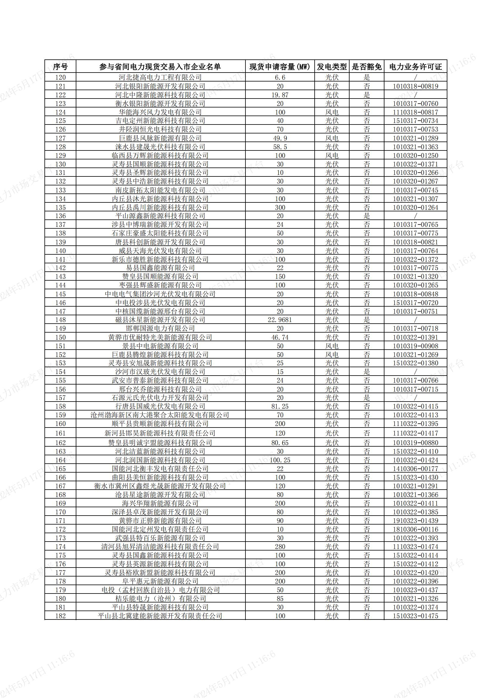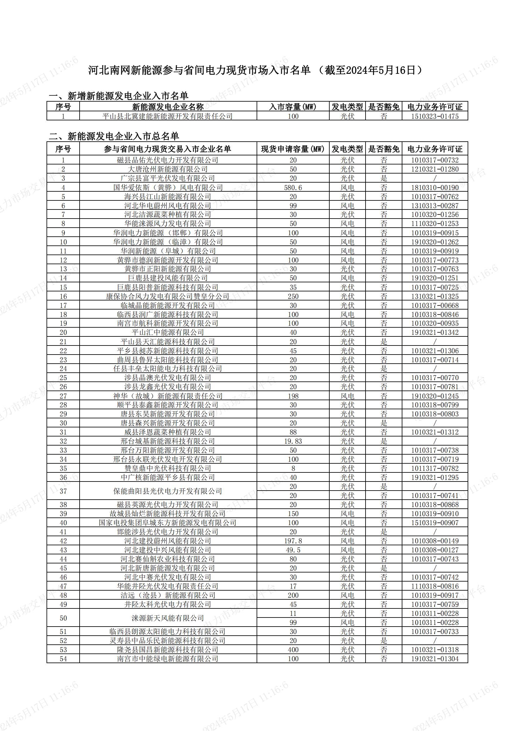 近日,河北電力交(jiao)易中(zhong)心(xin)發布河北南網新能源(yuan)參與省間電(dian)力現貨市(shi)場入市(shi)名單(截至2024年(nian)5月16日),新增1家新能源(yuan)發電企業(ye)入(ru)市,入(ru)市容(rong)量100MW。 詳情如下: