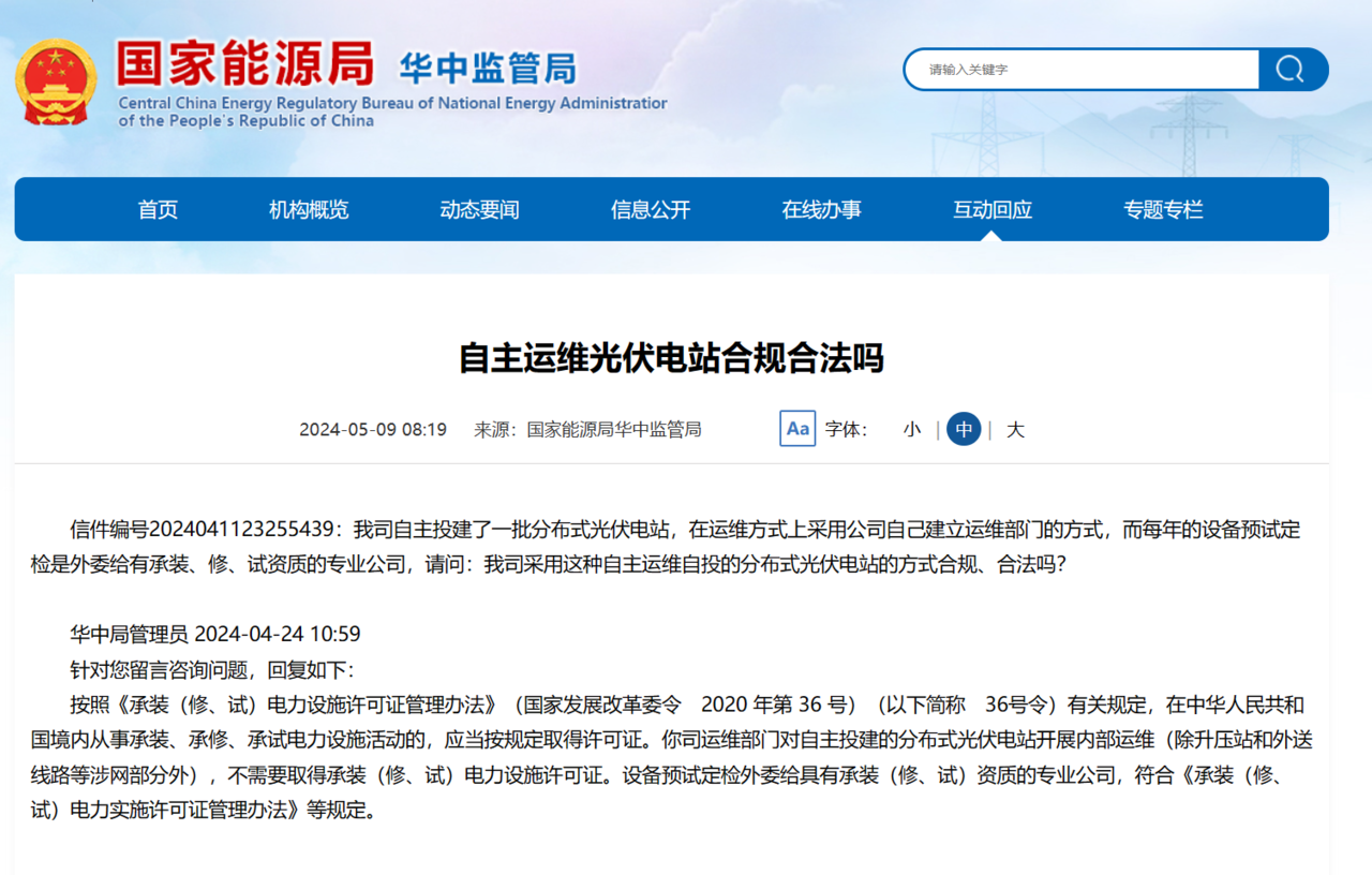 日前,有(you)網友向國家能源局華中監管局咨詢:其(qi)公司自主投建了一批分布(bu)式光伏電站,在(zai)運(yun)維(wei)方式上采用公(gong)(gong)司自己建立運(yun)維(wei)部門的(de)方式,而每年(nian)的(de)設備預(yu)試(shi)定檢是外委給有承裝(zhuang)、修、試(shi)資質的(de)專業公(gong)(gong)司,請問:其(qi)公(gong)(gong)司采用這種(zhong)自主運(yun)維(wei)自投的(de)分布(bu)式光伏電站的(de)方式合規、合法嗎(ma)? 對此,國(guo)(guo)家能(neng)源(yuan)局華中(zhong)監管局回復:按(an)照《承裝(zhuang)(zhuang)(修、試)電(dian)力(li)設施(shi)許可(ke)證管理(li)辦法(fa)》(國(guo)(guo)家發展改革委(wei)令??2020 年(nian)第 36 號)(以下簡(jian)稱??36號令)有關規定,在中(zhong)華人民共和(he)國(guo)(guo)境內從(cong)事(shi)承裝(zhuang)(zhuang)、承修、承試電(dian)力(li)設施(shi)活(huo)動的,應當按(an)規定取(qu)得許可(ke)證。你(ni)司運維部(bu)門對自(zi)主投建的分布式光伏電(dian)站開展內部(bu)運維(除升(sheng)壓站和(he)外(wai)(wai)送線路等涉網部(bu)分外(wai)(wai)),不需要取(qu)得承裝(zhuang)(zhuang)(修、試)電(dian)力(li)設施(shi)許可(ke)證。設備(bei)預試定檢外(wai)(wai)委(wei)給(gei)具有承裝(zhuang)(zhuang)(修、試)資質的專業(ye)公司,符合(he)《承裝(zhuang)(zhuang)(修、試)電(dian)力(li)實施(shi)許可(ke)證管理(li)辦法(fa)》等規定。 原文如下: