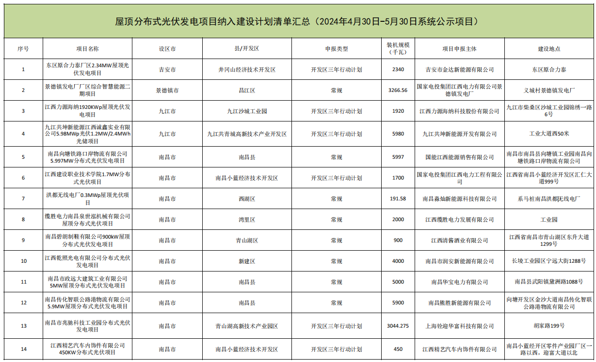 5月(yue)30日,屋頂分(fen)布式(shi)光伏(fu)發電項目(mu)納入(ru)建設(she)計劃清(qing)單匯(hui)總(2024年(nian)4月(yue)30日-5月(yue)30日系統(tong)公示項目(mu))公布。 按照《江西(xi)(xi)省(sheng)發展改革委江西(xi)(xi)省(sheng)能源(yuan)局關于補充完(wan)善〈江西(xi)(xi)省(sheng)光伏(fu)發電、風電項目開發工作(zuo)指南〉有關事項的通知》要求,屋頂分布(bu)式光伏(fu)發電規(gui)劃管理已(yi)下放(fang)到設區市(shi)能(neng)源主管部門。