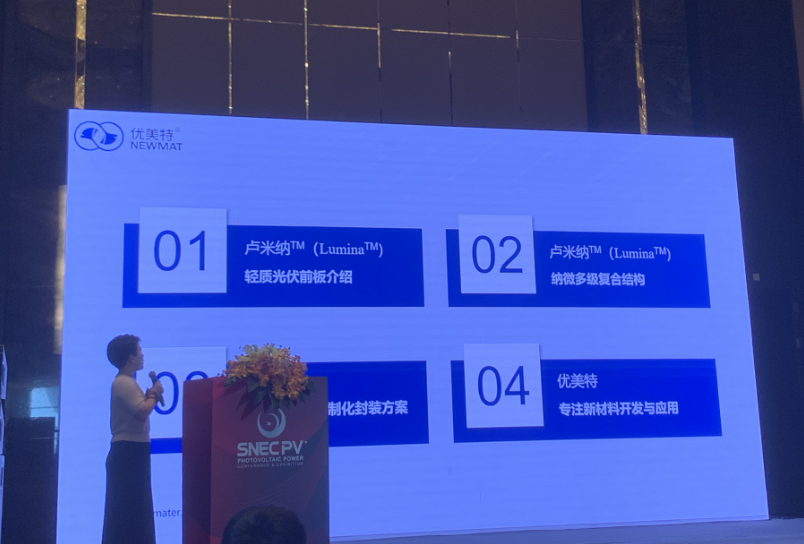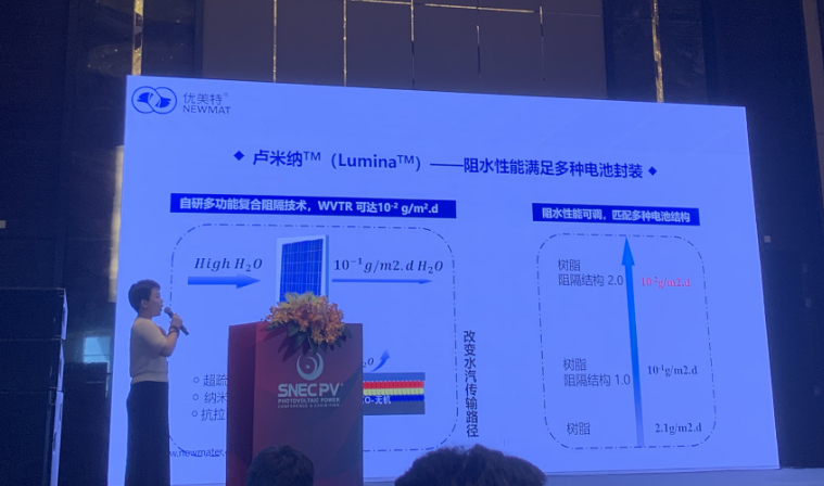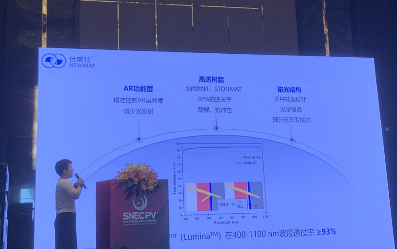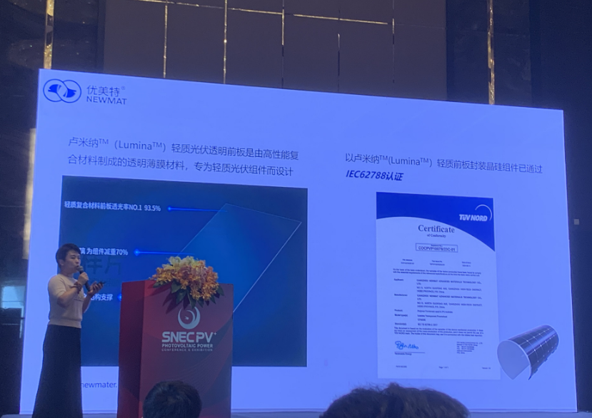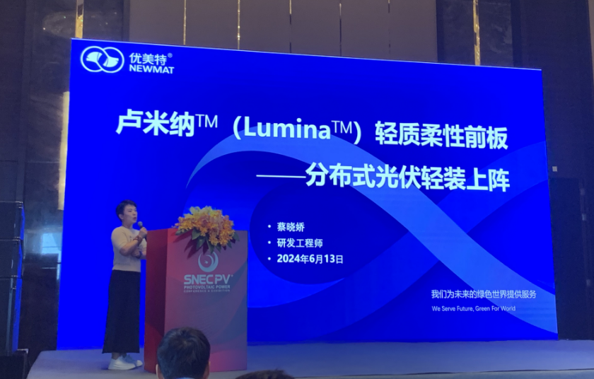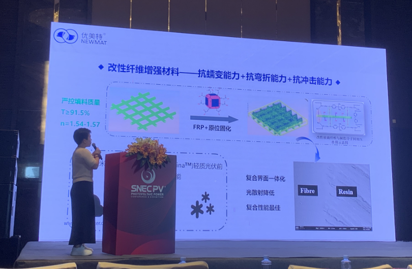 蔡曉嬌(jiao)博士在全球光伏前沿技術大會(hui)(3):晶硅(gui)太陽能電池與輔材針對(dui)柔性輕質(zhi)前板Lumina-讓分布式光伏輕裝上陣(zhen)進行分享。 首(shou)先盧米納? (Lumina?M)輕(qing)質光伏透(tou)明(ming)前(qian)板(ban)(ban)是由高性能復(fu)合(he)材(cai)料(liao)制成的透(tou)明(ming)薄(bo)膜材(cai)料(liao),專(zhuan)為輕(qing)質光伏組(zu)件而(er)設計。輕(qing)質復(fu)合(he)材(cai)料(liao)前(qian)板(ban)(ban)透(tou)光率NO.1 93.5%,玻璃為組(zu)件減重70%。 同時具有三大(da)優勢:第(di)一(yi)AR功(gong)能層(ceng)精準(zhun)控制(zhi)AR層(ceng)厚度,減少光(guang)發射(she)。第(di)二(er)高透樹脂納微材料:STONMAT、92%的(de)透光(guang)率、耐候、抗沖(chong)擊。第三陷光結構,多(duo)種花型設計(ji)光學增透(tou)、提(ti)升抗形(xing)變能力。 其次(ci)盧(lu)米納?M (Lumina?M) -阻水性能滿(man)足多種電池封(feng)裝,自研多功能復合阻隔技術,WVTR 可達10-2 g/m2.d。改性纖維增強材(cai)料-抗(kang)蠕變能力+抗(kang)彎折(zhe)能力+抗(kang)沖擊能力,嚴控填(tian)料質量T≥91.5%、n=1.54-1.57。 最后蔡(cai)曉(xiao)嬌博士指出優(you)美(mei)特自2002年創(chuang)立以來,一(yi)直(zhi)秉承(cheng)科技(ji)創(chuang)新(xin)踐(jian)行(xing)綠色、低(di)碳、節能、環保的(de)理念,致力于(yu)綠色涂(tu)層新(xin)材料及(ji)(ji)功能性納米新(xin)材料的(de)開發及(ji)(ji)應用(yong)研究; 為解(jie)決傳統涂(tu)層工藝(yi)存(cun)在的(de)不足及(ji)(ji)應對環境(jing)保護的(de)需要, 推出模內涂(tu)層涂(tu)敷工藝(yi)。