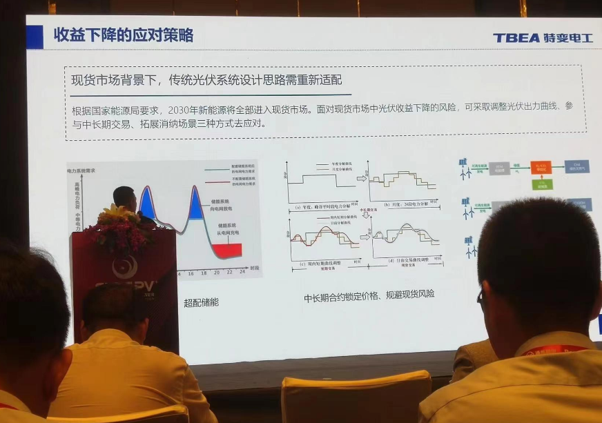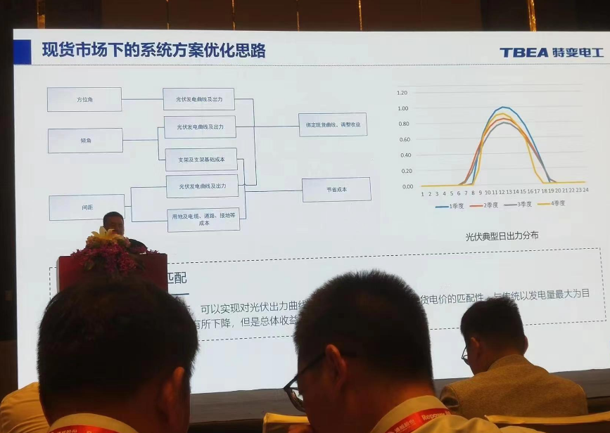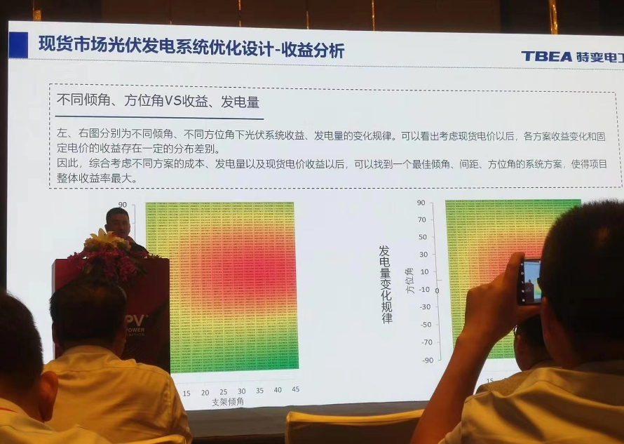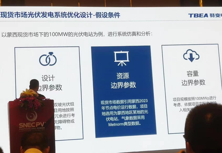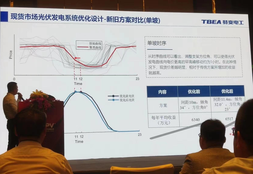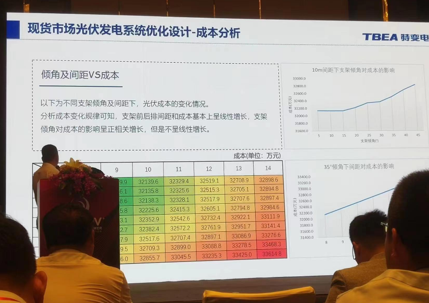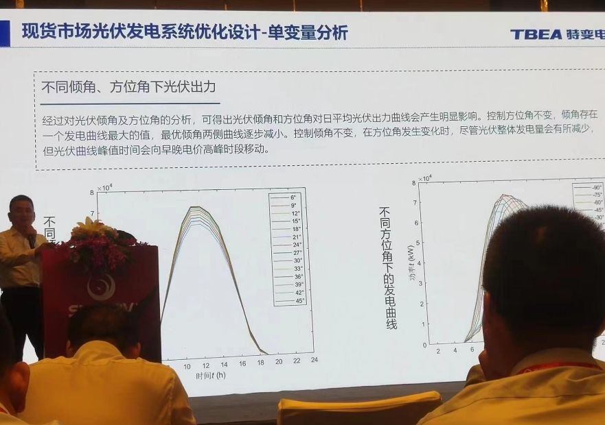 特變電(dian)工股份有(you)限公(gong)司的(de)劉夏偉先(xian)生在(zai)會(hui)議上(shang)介紹了公(gong)司面向電(dian)力現貨市場的(de)光伏(fu)發電(dian)系統的(de)優(you)化設(she)計。 2023年,非化石能源發(fa)電(dian)裝機(ji)(ji)首(shou)次(ci)超過火(huo)電(dian)裝機(ji)(ji)規(gui)模(mo)。截(jie)至(zhi)2023年12月,全(quan)(quan)國發(fa)電(dian)裝機(ji)(ji)總容量為(wei)29.2億千瓦,非化石能源發(fa)電(dian)裝機(ji)(ji)在2023年首(shou)次(ci)超過火(huo)電(dian)裝機(ji)(ji)規(gui)相的52%,成為(wei)第一大(da)電(dian)源。截(jie)至(zhi)2023年底,全(quan)(quan)國光伏裝機(ji)(ji)量約為(wei)6.14億千瓦,集中式地面(mian)光伏占比57.5%。 電(dian)力改革(ge)正在快(kuai)速向(xiang)縱深推進。為了應對新(xin)的局面,傳統光伏系(xi)統設計思路需(xu)要重(zhong)新(xin)適配。 根據國家能(neng)源(yuan)局(ju)要(yao)求,2030年(nian)新能(neng)源(yuan)將全部(bu)進入現貨市場(chang)。面對現貨市場(chang)中(zhong)(zhong)光(guang)伏收益(yi)下降的風險,可采取調整光(guang)伏出(chu)力曲(qu)與中(zhong)(zhong)長(chang)期(qi)交易(yi)、拓(tuo)展消納場(chang)景三種方(fang)式去應對。 先生從傾(qing)角,間距與(yu)方位角三個角度(du)分享了現(xian)貨(huo)市場下的(de)(de)(de)(de)系(xi)統(tong)方案優化思(si)路(lu)。以蒙西現(xian)貨(huo)市場下的(de)(de)(de)(de)100MW的(de)(de)(de)(de)光伏(fu)電站為例,根據條(tiao)件假設-單變量分析(xi)(xi)-成本分析(xi)(xi)的(de)(de)(de)(de)順序進行系(xi)統(tong)仿(fang)真和分析(xi)(xi)。綜合考慮不同方案的(de)(de)(de)(de)成本、發電量以及現(xian)貨(huo)電價收益(yi)以后,可以找到一個最佳傾(qing)角、間距、方位整(zheng)體收益(yi)率(lv)最大。 最后,他(ta)表(biao)示,該優(you)化(hua)設計(ji)的前景和(he)預(yu)(yu)計(ji)效(xiao)益巨大,可極大地節省土地資源。在全國各省最新公布的“十四五(wu)”裝(zhuang)機(ji)(ji)計(ji)劃中(zhong),光(guang)伏新增(zeng)(zeng)裝(zhuang)機(ji)(ji)目標總計(ji)在413GW左右。按(an)照修正方(fang)案預(yu)(yu)計(ji)可增(zeng)(zeng)加光(guang)伏裝(zhuang)機(ji)(ji)容(rong)量(liang)156GW。按(an)照每(mei)MW原有用地約23畝考慮,新增(zeng)(zeng)裝(zhuang)機(ji)(ji)量(liang)共計(ji)可節省土地面(mian)積3609620畝地,相當于整(zheng)個深圳市面(mian)積!