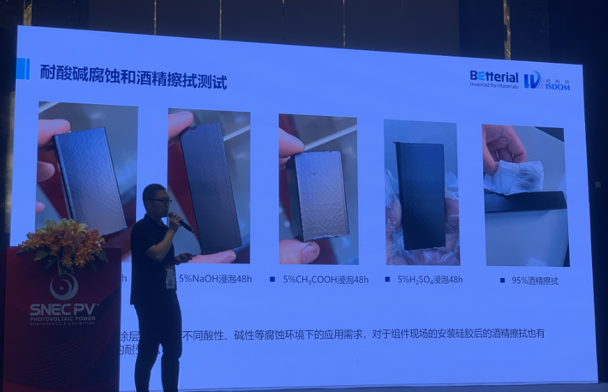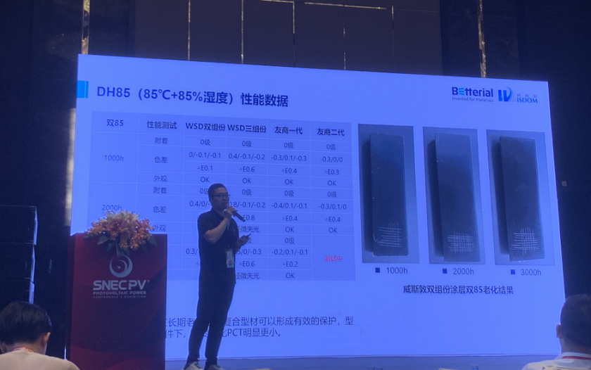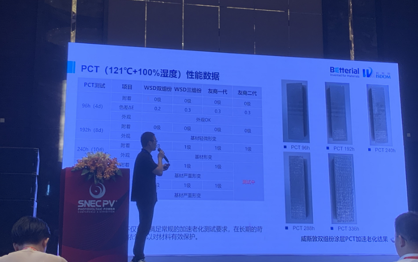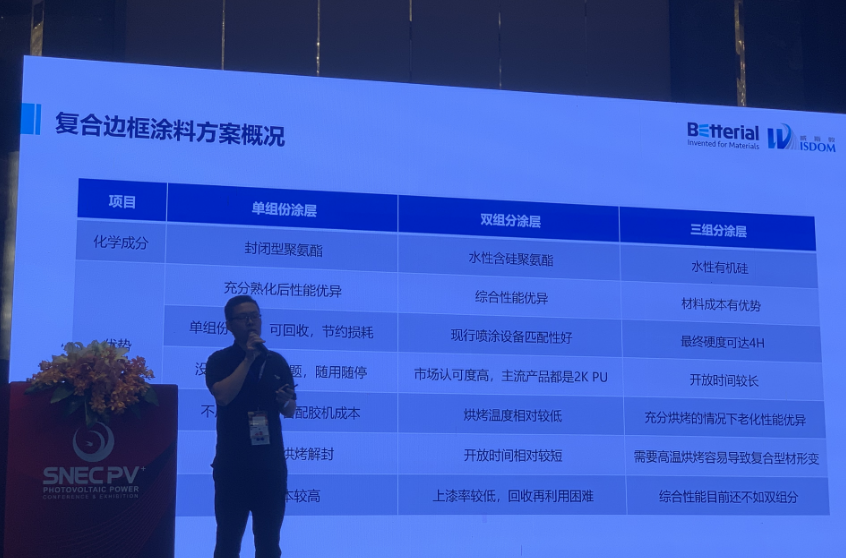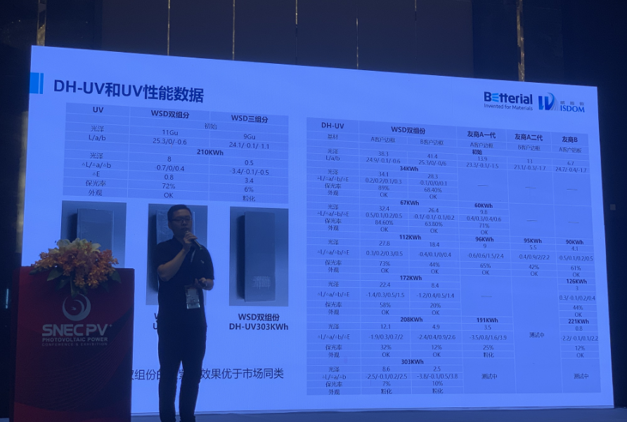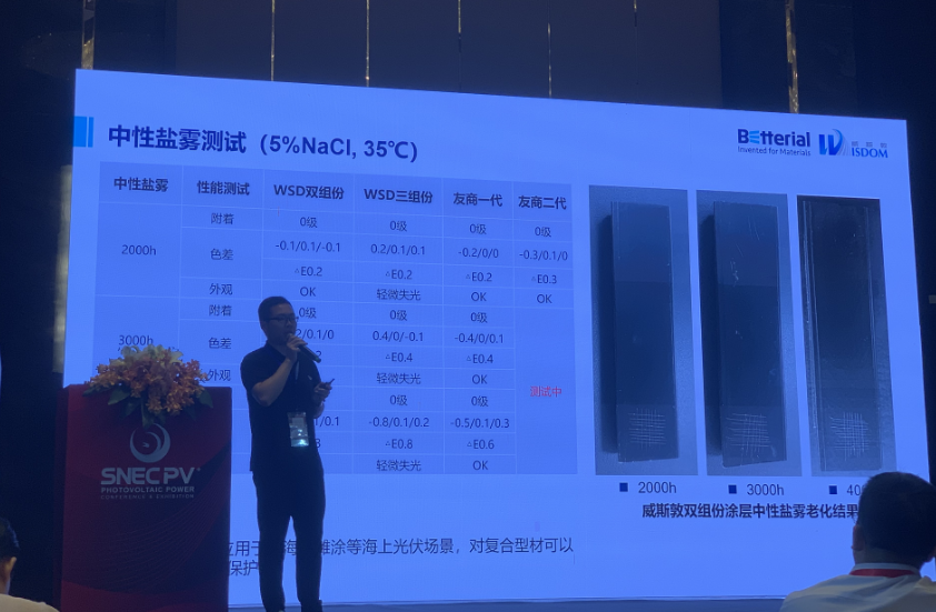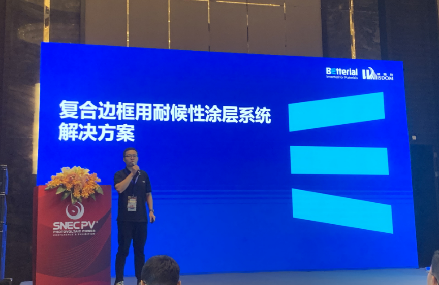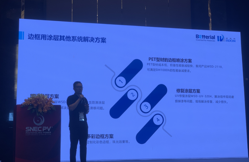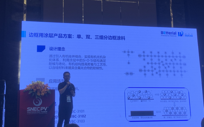 張(zhang)亮(liang)先生(sheng)在全(quan)球(qiu)光伏前沿技術(shu)大會(3):晶硅太陽能電(dian)池(chi)與(yu)輔材針對復合邊框用耐候性涂層解(jie)決(jue)方案進行分享。 張亮先生首先介(jie)紹了邊框用涂層產品方案:單(dan)、雙、三(san)組分(fen)邊框涂料(liao)。通過引l入有(you)機硅并(bing)縮(suo)合,實(shi)現有(you)機無(wu)機雜化體系,利用涂層中的Si-0-Si結構滿足耐候與老(lao)化,有(you)機結構提高附著(zhu)與工藝性,以含硅材料(liao)來媲(pi)美含氟化合物的耐候性。 同時PET型材(cai)成本低,但是性能衰減較快,產品W SD-2118,可(ke)滿足DH1000h的(de)性能衰減要求。UV修復(fu)涂(tu)層WSD-UV-3204,解(jie)決(jue)(jue)組件現場磨損掉(diao)漆(qi)等問(wen)題,現場解(jie)決(jue)(jue)修復(fu),減少損失。 其次,張亮(liang)先生展示(shi)了(le)他們公司所做的一些(xie)測(ce)試(shi)數(shu)據(ju):PCT (121°C+100%濕度性(xing)能數(shu)據(ju)、DH85 (85°C+85%濕度)性(xing)能數(shu)據(ju)、中性(xing)鹽霧測(ce)試(shi) (5%Nac1, 35°C)。 最(zui)后張亮先(xian)生簡單介紹(shao)了威斯敦粘合材(cai)料有限公司,公司產(chan)品(pin)在(zai)光伏(fu)背板領域產(chan)品(pin)幾乎涵蓋所(suo)有的(de)應用需求,是行業內市(shi)售產(chan)品(pin)最(zui)全(quan)面的(de)供應商,且(qie)綜合性能都(dou)通過(guo)國內一線(xian)組件廠的(de)測試,可(ke)以給客戶提供交(jiao)鑰匙服務(wu),快速完成新品(pin)導入(ru)。 復合邊框涂(tu)(tu)層(ceng),輕質組件用(yong)涂(tu)(tu)層(ceng)、光伏玻(bo)璃用(yong)涂(tu)(tu)層(ceng)、焊(han)帶(dai)用(yong)涂(tu)(tu)層(ceng)等,均在配合國(guo)內頭部企業合作(zuo)開(kai)發(fa)導入。鋰(li)電(dian)電(dian)芯(xin)、水(shui)冷板及儲能用(yong)絕緣(yuan)耐壓涂(tu)(tu)層(ceng)產品(pin),目前己(ji)完成(cheng)多種工藝(yi)路線的產品(pin)開(kai)發(fa),對接(jie)頭部企業深入合作(zuo)開(kai)發(fa),己(ji)完成(cheng)中試(shi)。