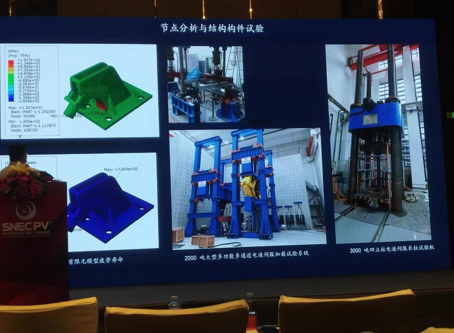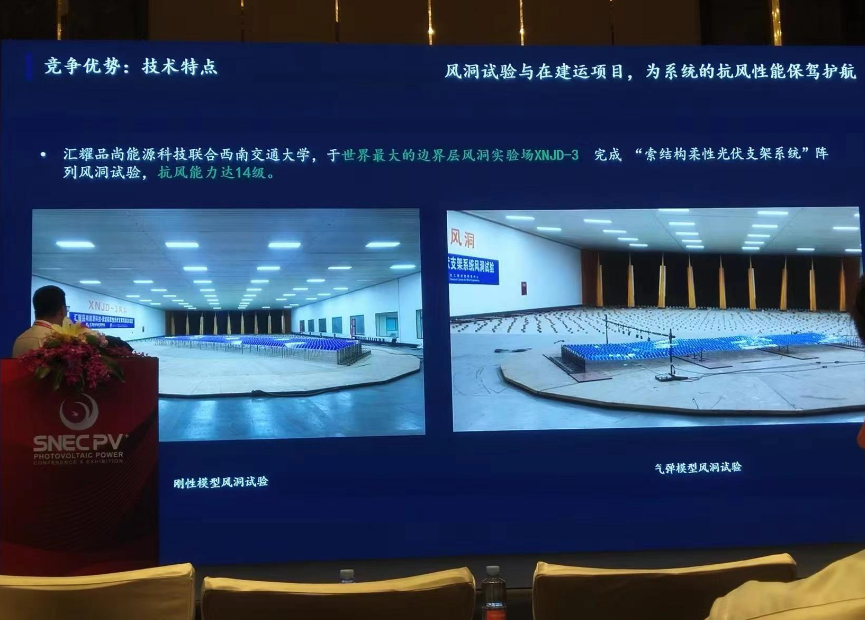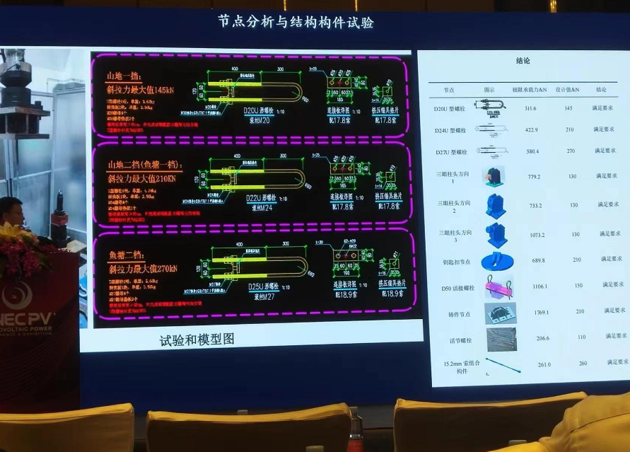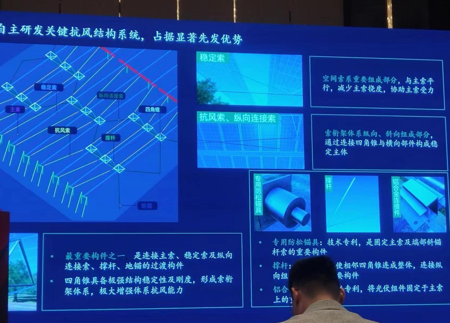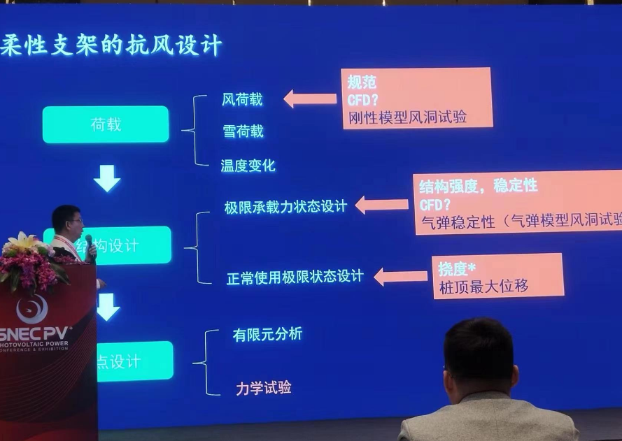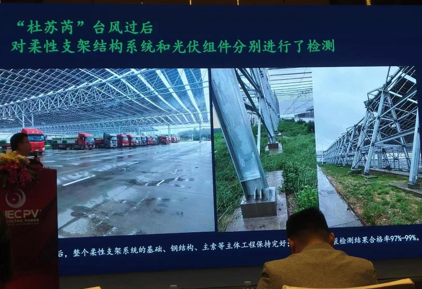在6月(yue)13日上(shang)午全(quan)球(qiu)光(guang)伏前(qian)沿技(ji)術大會(1)系(xi)統(tong)平衡部件上(shang),匯耀品尚能(neng)源(yuan)科(ke)技(ji)的首(shou)席科(ke)學家趙建光(guang)先生與(yu)我們(men)分(fen)享柔性(xing)支架結構系(xi)統(tong)如何(he)抵御超強臺(tai)風。 在(zai)簡要介紹了匯耀(yao)品(pin)尚能源科技公司之后(hou),趙先生表示,柔(rou)(rou)性(xing)支架(jia)多(duo)場景應(ying)用(yong)的(de)(de)優勢在(zai)于,基礎數量僅為(wei)傳統支架(jia)的(de)(de)1/3,樁基間距約(yue)30-60米,釋放(fang)板下空間,為(wei)漁光一(yi)(yi)體給出了更多(duo)可(ke)能性(xing)。從光伏(fu)電站建設(she)的(de)(de)綜合成本(ben)及(ji)效能來看,尤其在(zai)當下光伏(fu)建設(she)用(yong)地矛盾凸顯情況下,柔(rou)(rou)性(xing)支架(jia)的(de)(de)經濟(ji)性(xing)具備一(yi)(yi)定(ding)優勢。 柔(rou)(rou)性支架(jia)(jia)系統在(zai)工況下的(de)抗(kang)風性受到了極大關(guan)注,抗(kang)風系統的(de)重(zhong)要(yao)性由(you)此突顯。根據公(gong)司(si)自主研(yan)發的(de)光伏電(dian)站智慧運維(wei)監測平臺數據,目前柔(rou)(rou)性支架(jia)(jia)的(de)最(zui)高抗(kang)風記錄是(shi)抵御了15級臺風。 公司研發部門進(jin)行了(le)50余次破壞節(jie)點分(fen)析,發現不同(tong)(tong)的(de)風(feng)(feng)向角對柔(rou)性(xing)(xing)支架的(de)作(zuo)用效果(guo)不同(tong)(tong)。客戶也會對工(gong)程質(zhi)量產生質(zhi)疑,但柔(rou)性(xing)(xing)支架經受住(zhu)了(le)考驗。柔(rou)性(xing)(xing)支架系統保持(chi)完好(hao)(hao),因為其(qi)在強臺風(feng)(feng)中低頻震動。“杜蘇芮”臺風(feng)(feng)過后,柔(rou)性(xing)(xing)支架結構系統和光(guang)伏組件分(fen)別進(jin)行了(le)檢(jian)測(ce)整個柔(rou)性(xing)(xing)支架系統的(de)基礎(chu)、鋼結構、主索等主體工(gong)程保持(chi)完好(hao)(hao); 光(guang)伏組件隱裂檢(jian)測(ce)結果(guo)合格率97%-99%。 趙先(xian)生還分享了(le)柔性支架(jia)的抗風(feng)設計,以及在柔性支架(jia)抗風(feng)設計的實踐和思考。該抗風(feng)設計需要克服荷載、結構設計、節點設計三方面的障礙和難(nan)題。 最后,他(ta)表示,柔(rou)(rou)性(xing)(xing)支架在各領域的(de)應(ying)用前景(jing)是廣泛的(de),但仍需要從行業規范(fan)的(de)完善\市場(chang)保(bao)有的(de)提(ti)升\技術形式(shi)的(de)迭代三個點共同奮斗努力(li),一起攜手促進柔(rou)(rou)性(xing)(xing)領域的(de)健(jian)康成長。