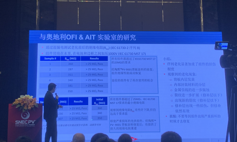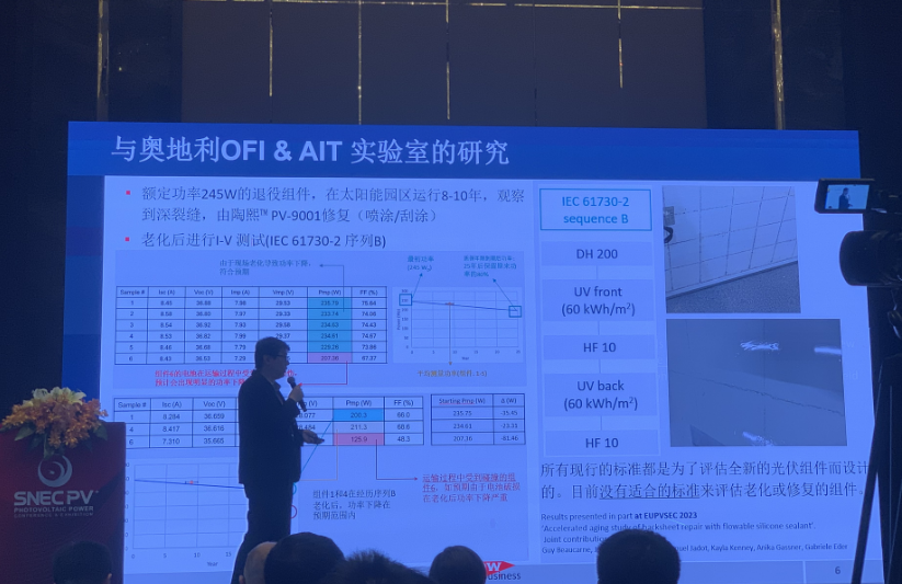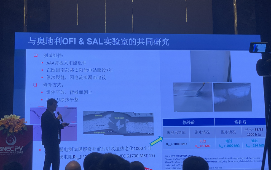 曹諫先生在全(quan)球光伏前沿技(ji)術大(da)會(3):晶(jing)硅光伏組件(jian)及(ji)質(zhi)量保證針對太陽(yang)能組件(jian)背(bei)板修復(fu)方案一陶熙 PV-9001有機硅背(bei)板修復(fu)涂料進行分享。 陶熙? PV-9001 有機硅背板涂料具(ju)有兩大特(te)征(zheng):第一(yi)單組份,濕氣(qi)固化后(hou)形(xing)成彈性體。 第二粘度(du)適中,便于施工。與奧地利(li)OFI &SAL實(shi)驗室的共同研究。測(ce)試組件:AAA背(bei)板太陽(yang)能組件,在歐洲(zhou)南部(bu)某太陽(yang)能電(dian)站服役(yi)7年,縱深裂縫,因(yin)電(dian)流泄漏而退役(yi)。 修補(bu)方式:一組(zu)件平放,背(bei)板面朝上。二利刀涂抹(mo)平整。額定功率245w的(de)退(tui)役(yi)組(zu)件,在太陽能園區(qu)運(yun)行8-10年(nian),觀(guan)察(cha)到深裂(lie)縫(feng),由陶熙? PV-9001修復(噴涂/刮涂)。 所有(you)現行的標準都是為(wei)了評(ping)(ping)估(gu)(gu)全新的光伏組件(jian)而(er)設計的,目(mu)前沒有(you)適合的標準來評(ping)(ping)估(gu)(gu)老(lao)(lao)化(hua)(hua)或修復的組件(jian)。序列(lie)老(lao)(lao)化(hua)(hua)顯著加重了組件(jian)的損傷程度,觀察到的老(lao)(lao)化(hua)(hua)現象: 。背板內層發黃 。內部封裝材料的分(fen)層 。金屬引線的進一步腐蝕 。裂紋進一步擴展(修(xiu)補層以下) 。 出現(xian)新的(de)裂紋(wen) (修補層以下(xia)) 。修(xiu)(xiu)補層出現一些損份,但修(xiu)(xiu)補依然有(you)效。 最后曹先(xian)生表示陶熙(xi)? PV-9001 背(bei)(bei)板涂料能(neng)夠修(xiu)(xiu)(xiu)復(fu)太陽能(neng)背(bei)(bei)板裂紋并重建(jian)絕緣電陽。修(xiu)(xiu)(xiu)復(fu)效果在AAA背(bei)(bei)板的太陽能(neng)組件(jian)上得到驗(yan)證。即使是(shi)背(bei)(bei)板大面積開裂的組件(jian),修(xiu)(xiu)(xiu)復(fu)后絕緣電阻也能(neng)恢(hui)復(fu)。經歷IEC 61730-2:2016的序(xu)列(lie)B后,包(bao)括多種(zhong)環(huan)境應力,修(xiu)(xiu)(xiu)復(fu)后的組件(jian)保持維修(xiu)(xiu)(xiu)效果。