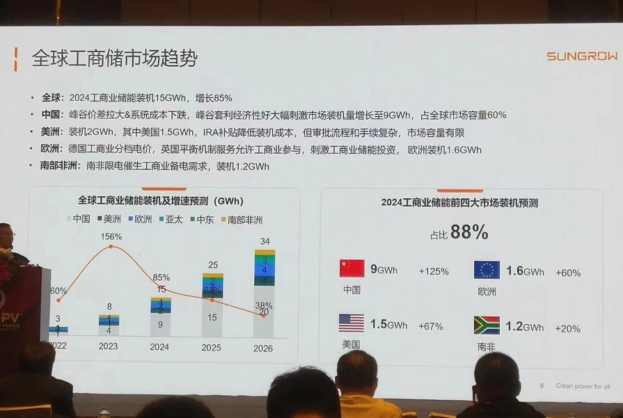 在6月(yue)13日下午全球光(guang)伏前沿(yan)技術大會(2)分(fen)布式光(guang)伏與集成(cheng)光(guang)伏技術(IPV)上,陽光(guang)電源(yuan)(yuan)(yuan)的李燦林(lin)先生就陽光(guang)電源(yuan)(yuan)(yuan)對于工商(shang)業(ye)能源(yuan)(yuan)(yuan)面臨的挑(tiao)戰(zhan)和(he)機(ji)遇、以及(ji)相(xiang)應的解(jie)決方(fang)案進行了分(fen)享。 全球范圍看,2024工(gong)(gong)(gong)商(shang)(shang)業(ye)(ye)儲(chu)(chu)能裝(zhuang)機(ji)15GWh,增長85%。在中(zhong)國(guo)(guo),由于(yu)峰谷(gu)價(jia)差拉大&系統成本下(xia)跌,峰谷(gu)套利經濟性好大幅刺(ci)激(ji)市場裝(zhuang)機(ji)量增長至9GWh,占全球市場容(rong)量60%;在 美洲,裝(zhuang)機(ji)2GWh,其中(zhong)美國(guo)(guo)1.5GWh,IRA補(bu)貼(tie)降低裝(zhuang)機(ji)成本,但審批流(liu)程和手續復(fu)雜,市場容(rong)量有限;歐洲方面,德國(guo)(guo)工(gong)(gong)(gong)商(shang)(shang)業(ye)(ye)分(fen)檔電價(jia),英(ying)國(guo)(guo)平衡機(ji)制(zhi)服務允許(xu)工(gong)(gong)(gong)商(shang)(shang)業(ye)(ye)參與,刺(ci)激(ji)工(gong)(gong)(gong)商(shang)(shang)業(ye)(ye)儲(chu)(chu)能投資(zi), 歐洲裝(zhuang)機(ji)1.6GWh;南部(bu)非洲:南非限電催生工(gong)(gong)(gong)商(shang)(shang)業(ye)(ye)備電需求,裝(zhuang)機(ji)1.2GWh。 簡(jian)要(yao)介紹了陽光(guang)電源公司后,李先生表示,工商業(ye)儲能商業(ye)模式多(duo)樣化,收益(yi)(yi)渠道更(geng)豐富,但面(mian)臨(lin)四大挑戰:人員和財產密集,系統(tong)(tong)安(an)全要(yao)求(qiu)高(gao);產品和系統(tong)(tong)設計不專業(ye),業(ye)主(zhu)收益(yi)(yi)無(wu)保證;標準體系缺(que)失,安(an)全隱患日益(yi)(yi)增(zeng)多(duo);現(xian)場安(an)裝調試耗時長,后期運(yun)維成本高(gao)。 基于此,李(li)先生提出,工商業儲能(neng)可(ke)持續健康發(fa)展的關鍵因素是安全、高效、長期主義。他以陽光(guang)電源(yuan)(yuan)公司的實踐為例(li),分享了解決方案和路徑,深(shen)度融合三電技術、AI技術,打造智(zhi)慧分布式儲能(neng)系(xi)統;多樣(yang)化綠色能(neng)源(yuan)(yuan)組合,加速企業ESG轉(zhuan)型。 最后他呼吁:關注工商業(ye)儲能,多收益、高安全、更省心,實(shi)現全生(sheng)命周期(qi)系統可(ke)持續(xu)健康發展(zhan)5EC! 上一篇: 工信部:1-4月全國光伏制造行業運行情況