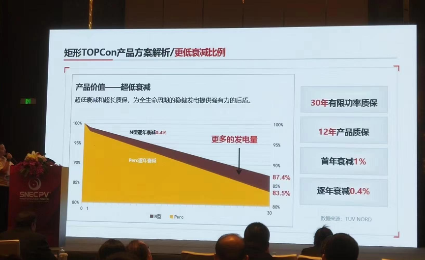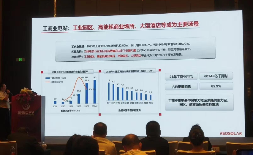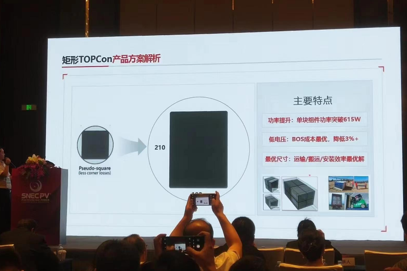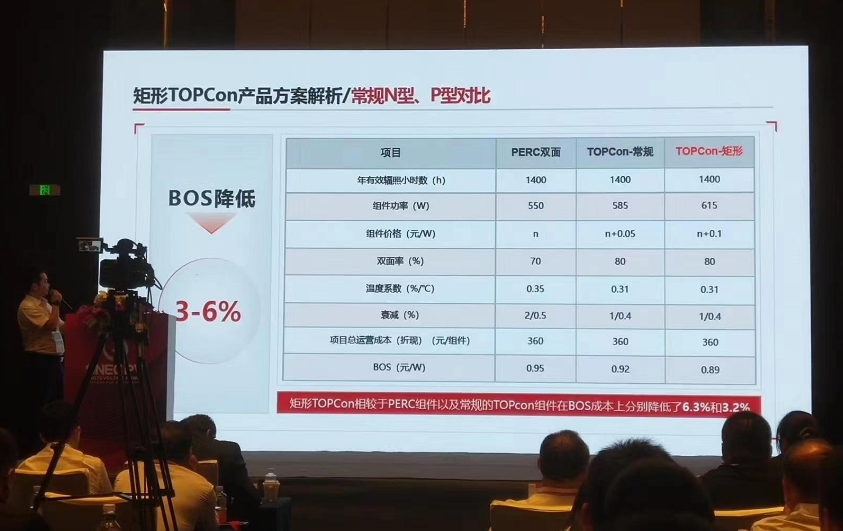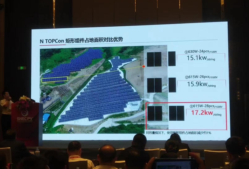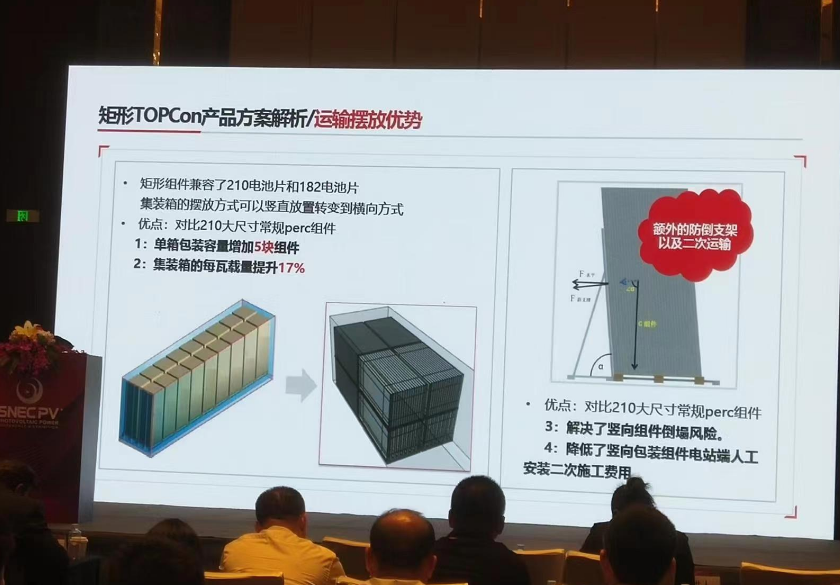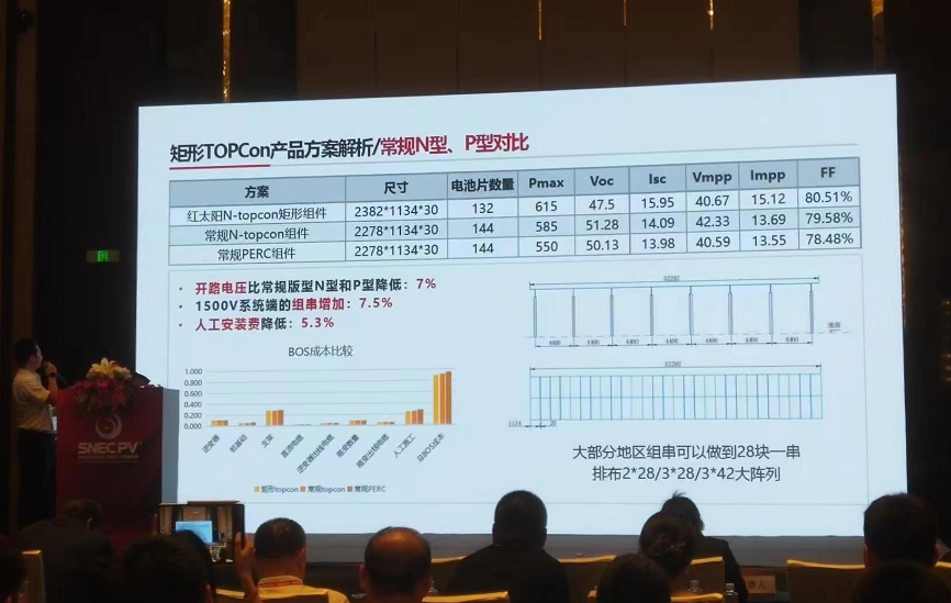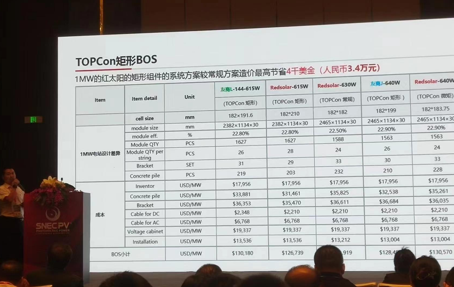 紅(hong)太陽新能源的劉增(zeng)勝先(xian)生跟與會人員(yuan)分(fen)享矩形組件在(zai)分(fen)布式(shi)項目(mu)中的應用價值(zhi)。 首先,劉先生(sheng)帶我們回顧了一下分布式項(xiang)目(mu)的(de)概況(kuang)。分布式項(xiang)目(mu)應(ying)用最廣泛的(de)是建筑(zhu)物屋(wu)頂分布式。工商(shang)(shang)業電站(zhan)則是能(neng)源消耗(hao)的(de)主力(li)軍,其中工業園區、高(gao)能(neng)耗(hao)商(shang)(shang)業場(chang)所、大型酒店(dian)等成為主要場(chang)景。2023年(nian)工商(shang)(shang)業光(guang)伏新增裝機52.8GW,同比增長104.2%,預計2024年(nian)新增裝機量60GW。 接著他陳述了分布式工商(shang)業項目存在的痛點:1、BOS成本較(jiao)高(常規版(ban)型(xing)開路(lu)電壓(ya)高,1500V系統端(duan)的組(zu)串數量有限(xian),安裝(zhuang)費用(yong)較(jiao)高。)2、投資回(hui)收周(zhou)期長(chang)(chang)(部分場景下(xia)組(zu)件(jian)功(gong)率(lv)不(bu)夠,投資回(hui)收期長(chang)(chang))3、超(chao)大(da)組(zu)件(jian)組(zu)件(jian)豎向包裝(zhuang),終(zhong)端(duan)轉(zhuan)運不(bu)夠便捷(jie),安裝(zhuang)效率(lv)低(di)。 針(zhen)對這些痛(tong)點,紅太陽給出了一(yi)種解決方(fang)案——矩形(xing)TOPCon產(chan)品方(fang)案。該(gai)方(fang)案主(zhu)要(yao)特點是1.功率提升:單(dan)塊組(zu)件功率突破615W 2.低(di)電壓:BOS成本最優,降低(di)3%+ 3.最優尺(chi)寸:運(yun)輸/搬(ban)運(yun)/安裝效率最優解 該產品還具有(you)(you)諸多(duo)優(you)勢:第一,超低(di)(di)(di)衰減(jian)和(he)超長質(zhi)保,為全(quan)生(sheng)命周期的(de)(de)(de)穩(wen)健發電提供(gong)強(qiang)有(you)(you)力的(de)(de)(de)后盾。30年(nian)有(you)(you)限功率,12年(nian)產品質(zhi)保,首(shou)年(nian)衰減(jian)1%,逐漸衰減(jian)0.4%。第二,運輸擺放(fang)優(you)勢。矩形(xing)組(zu)(zu)件(jian)(jian)兼容了(le)210電池片和(he)182電池片。對比210大(da)尺寸常(chang)規perc組(zu)(zu)件(jian)(jian),集裝(zhuang)(zhuang)箱(xiang)的(de)(de)(de)擺放(fang)方式可(ke)(ke)以豎直放(fang)置(zhi)轉變到橫向(xiang)(xiang)方式,單箱(xiang)包(bao)裝(zhuang)(zhuang)容量(liang)增加(jia)5塊(kuai)組(zu)(zu)件(jian)(jian),集裝(zhuang)(zhuang)箱(xiang)的(de)(de)(de)每(mei)瓦載(zai)量(liang)提升(sheng)17%,解決了(le)豎向(xiang)(xiang)組(zu)(zu)件(jian)(jian)倒塌風險,降低(di)(di)(di)了(le)豎向(xiang)(xiang)包(bao)裝(zhuang)(zhuang)組(zu)(zu)件(jian)(jian)電站端人(ren)工安裝(zhuang)(zhuang)二次施工費用(yong)(yong)。第三(san),矩形(xing)技(ji)術發展,多(duo)種尺寸可(ke)(ke)選(xuan)擇。第四(si),1MW的(de)(de)(de)紅太陽的(de)(de)(de)矩形(xing)組(zu)(zu)件(jian)(jian)的(de)(de)(de)系統(tong)方案(an)較(jiao)常(chang)規方案(an)造(zao)價(jia)最高節省4千美金(人(ren)民(min)幣3.4萬元)。第五,開路電壓比常(chang)規版型N型和(he)P型降低(di)(di)(di)7%, 1500V系統(tong)端的(de)(de)(de)組(zu)(zu)串增加(jia)7.5%,人(ren)工安裝(zhuang)(zhuang)費降低(di)(di)(di):5.3%。第六,矩形(xing)TOPCon相較(jiao)于PERC組(zu)(zu)件(jian)(jian)及其常(chang)規組(zu)(zu)件(jian)(jian)在(zai)BOS成本上(shang)分別(bie)降低(di)(di)(di)了(le)6.3%和(he)3.2%。第七,N型TOPCon矩形(xing)組(zu)(zu)件(jian)(jian)占(zhan)地面(mian)積對比優(you)勢同容量(liang)情況下,使(shi)用(yong)(yong)短形(xing)組(zu)(zu)件(jian)(jian)占(zhan)地面(mian)積減(jian)少約1%。 最(zui)后劉先生熱情邀請大家來(lai)紅太陽的展會多多交流(liu)!