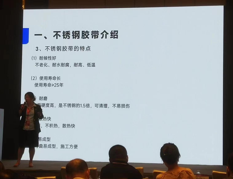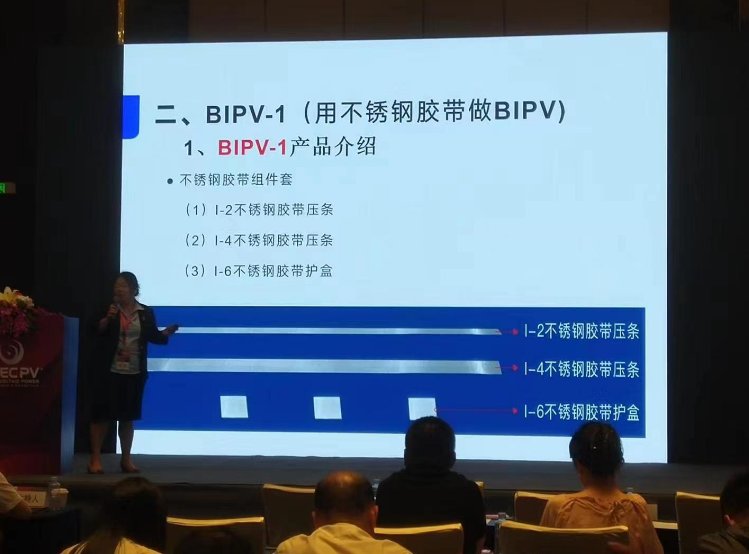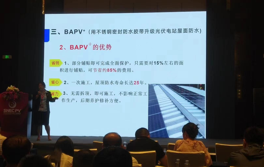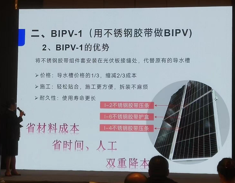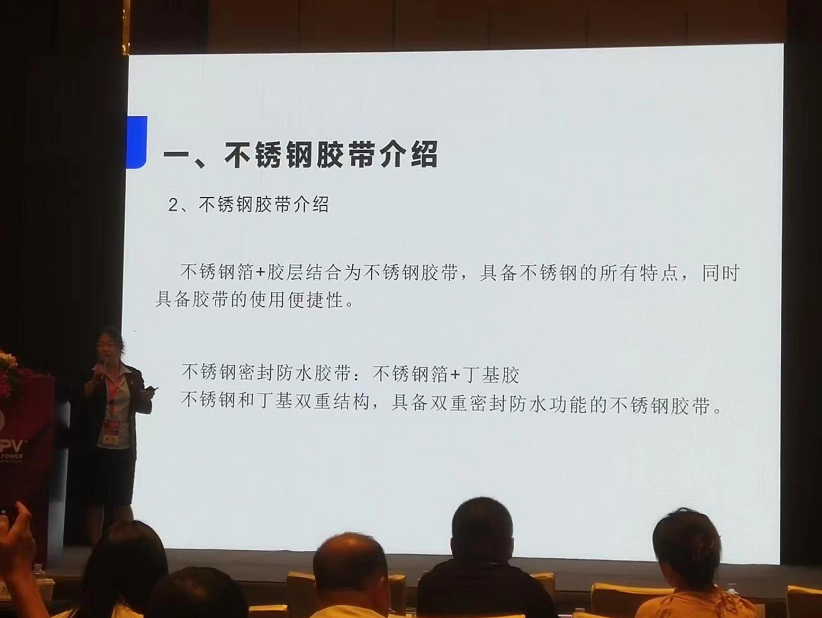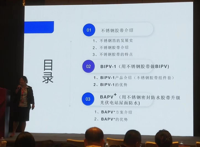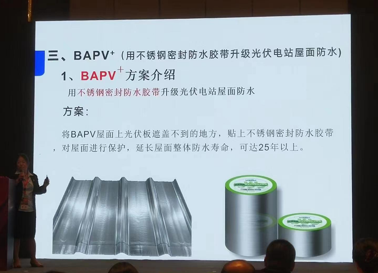 在6月13日下午(wu)全球(qiu)光(guang)(guang)伏前(qian)沿技術大會(2)分布(bu)式光(guang)(guang)伏與(yu)集成光(guang)(guang)伏技術(IPV)上,常州希(xi)瑞思新材料科技有限公司的副總經(jing)理盛涵女士為我們講解(jie)不銹鋼(gang)密(mi)封防水膠(jiao)帶如(ru)何助力分布(bu)式光(guang)(guang)伏、光(guang)(guang)電建(jian)筑(zhu)一體化BIPV。 首先(xian),盛女士為我們講解不銹鋼膠帶的定(ding)義。不銹鋼膠帶源于不銹鋼箔,多應(ying)用于高(gao)精尖(jian)領域。希(xi)瑞思(si)是中國第一個將不銹鋼箔應(ying)用到膠帶領域的企業(ye)。 不銹(xiu)鋼(gang)箔+丁基膠結合為(wei)不銹(xiu)鋼(gang)膠帶(dai)。它具備不銹(xiu)鋼(gang)的(de)所有特點,同時具備膠帶(dai)的(de)使(shi)(shi)用(yong)便捷性(xing)。不銹(xiu)鋼(gang)膠帶(dai)具有如下特點:耐候性(xing)好(不老化、耐水耐腐(fu),耐高、低溫),使(shi)(shi)用(yong)壽命長(≥25年),耐磨(mo),硬度(du)高(不銹(xiu)鋼(gang)的(de)1.5倍),可清理,不易損傷,散熱快,易成型。 接(jie)下來(lai)她介紹了BIPV-1產(chan)品中的(de)(de)應(ying)用——不(bu)銹(xiu)鋼膠(jiao)(jiao)(jiao)(jiao)帶(dai)組件套(tao):1-2不(bu)銹(xiu)鋼膠(jiao)(jiao)(jiao)(jiao)帶(dai)壓條(tiao)、1-4不(bu)銹(xiu)鋼膠(jiao)(jiao)(jiao)(jiao)帶(dai)壓條(tiao)、1-6不(bu)銹(xiu)鋼膠(jiao)(jiao)(jiao)(jiao)帶(dai)護(hu)盒。將不(bu)銹(xiu)鋼膠(jiao)(jiao)(jiao)(jiao)帶(dai)組件套(tao)安(an)裝在(zai)光伏板接(jie)縫處,代替原有的(de)(de)導水槽(cao),在(zai)價格(ge)、施工和耐久(jiu)性方面擁有巨大(da)優勢(shi)。 她還介(jie)紹了BAPV+方(fang)(fang)案,即將BAPV屋面(mian)上光伏板遮蓋不到的地方(fang)(fang),貼上不銹鋼密封防(fang)水(shui)膠帶,對屋面(mian)進行(xing)保護(hu),延長屋面(mian)整體防(fang)水(shui)壽命,可達25年(nian)以上。 盛(sheng)涵(han)女士在(zai)細分行業的新穎報告讓所(suo)有人眼前一亮! 最后她表示大(da)家如(ru)果感興趣可去希瑞思的展臺進(jin)行交流(liu)。
