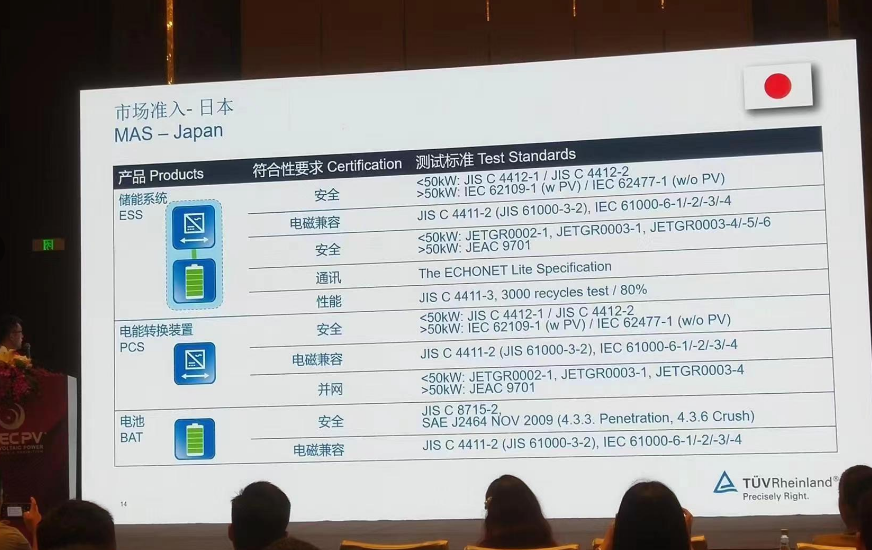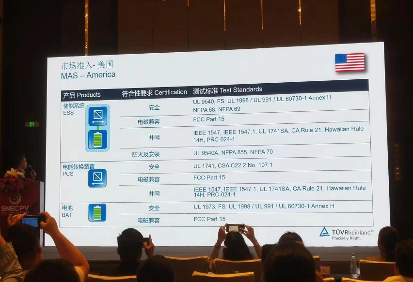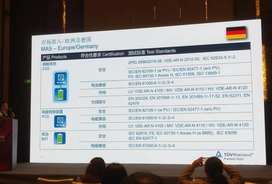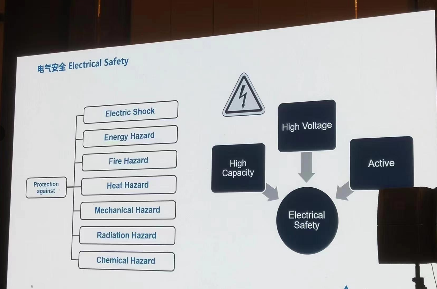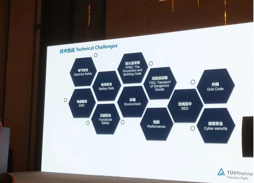 德國萊(lai)茵 TüV 高級項目經理王磊先生以儲能(neng)安全(quan)及(ji)市(shi)場準入技(ji)術解決方案(an)為題(ti)進行(xing)了分(fen)享(xiang)。首先他分(fen)別(bie)介紹了四種(zhong)儲能(neng)應(ying)用場景以及(ji)其相關特性:便攜式儲能(neng)系統(tong)(tong),戶用儲能(neng)系統(tong)(tong),工商業(ye)儲能(neng)系統(tong)(tong),電力(li)儲能(neng)系統(tong)(tong)。 王(wang)先生簡要(yao)談論(lun)了儲能(neng)安(an)(an)全(quan)(quan)(quan)(quan)(quan)面(mian)(mian)臨的技術挑戰,如防(fang)火及安(an)(an)裝、電(dian)(dian)氣(qi)安(an)(an)全(quan)(quan)(quan)(quan)(quan)、危險品運輸(shu)、電(dian)(dian)池(chi)安(an)(an)全(quan)(quan)(quan)(quan)(quan)、并網、環境、電(dian)(dian)磁兼容、無線指(zhi)令、功(gong)(gong)能(neng)安(an)(an)全(quan)(quan)(quan)(quan)(quan)、性(xing)能(neng)、信息安(an)(an)全(quan)(quan)(quan)(quan)(quan)等因素。他還從電(dian)(dian)氣(qi)安(an)(an)全(quan)(quan)(quan)(quan)(quan)、電(dian)(dian)池(chi)安(an)(an)全(quan)(quan)(quan)(quan)(quan)、功(gong)(gong)能(neng)安(an)(an)全(quan)(quan)(quan)(quan)(quan)三個方面(mian)(mian)例舉(ju)了常見的安(an)(an)全(quan)(quan)(quan)(quan)(quan)隱患。 最后王(wang)先(xian)生與(yu)我(wo)們就(jiu)儲能系統(ESS)、電(dian)能轉換(huan)裝置(zhi)(PCS)、電(dian)池(chi)(BAT)分(fen)享了中國(guo)、歐洲(zhou)及德國(guo)、澳洲(zhou)、美國(guo)、日本、韓國(guo)等多(duo)個重要市場(chang)的(de)市場(chang)準入規范,以及儲能一站式解(jie)決(jue)方案(an)。該方案(an)包括咨詢、測(ce)試、檢驗(yan)、認定全環節(jie)。
