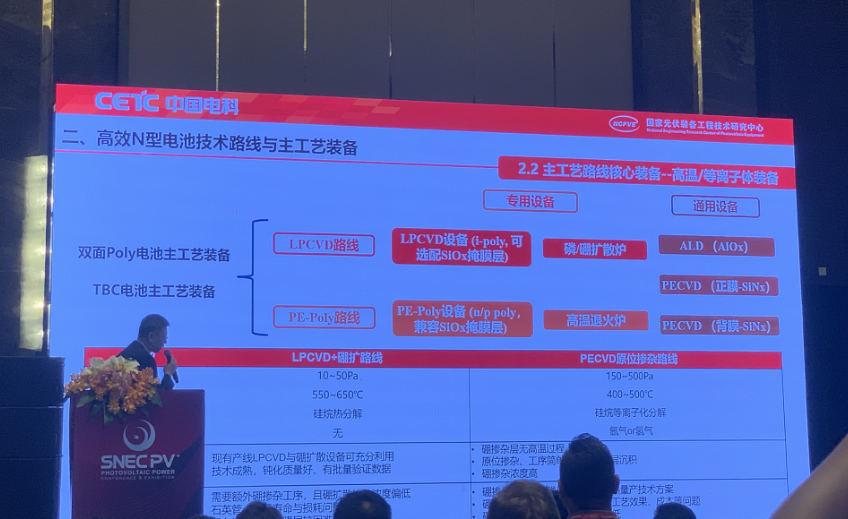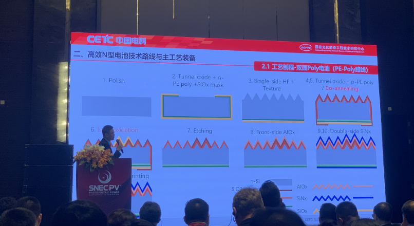 張淳博士在全球光伏前沿技(ji)術大(da)會(6):薄膜與鈣鈦(tai)礦上針對(dui)高效N型太陽(yang)能電池核心工藝裝備技(ji)術路線進行分(fen)享。 張博(bo)士首(shou)先介紹了高(gao)效(xiao)N型(xing)(xing)電池(chi)(chi)技(ji)術進展與趨勢(shi),光伏電池(chi)(chi)片技(ji)術由尸型(xing)(xing)向(xiang)N型(xing)(xing)迭代(dai)。由于轉換效(xiao)率的瓶頸(jing),各電池(chi)(chi)廠商都在(zai)努(nu)力(li)追求技(ji)術上的改進和(he)效(xiao)率上的突(tu)破(po)。N型(xing)(xing)高(gao)效(xiao)電池(chi)(chi)在(zai)目前轉換效(xiao)率和(he)末來增(zeng)長(chang)空間上全面優于PERC,已成為電池技術的(de)主要發展方(fang)向。HJT異(yi)質結電(dian)池在第三代光伏主流電(dian)池中優勢(shi)明顯。新電池技術路(lu)線中,HJT優勢(shi)顯著,產(chan)能增(zeng)長(chang)較快。相(xiang)較其(qi)他幾種技術路線,HJT具有開路電壓高、溫度系數(shu)低、無(wu)LID和PID效應、結構對稱易于薄片化和低溫(wen)工藝能耗低的優點。得益于上述(shu)優勢,N型(xing)技(ji)術(shu)中,HJT的產(chan)能(neng)增(zeng)速最(zui)高。 其次介紹了高(gao)效N型電池技術路線與(yu)主工藝(yi)裝備,向我們展示了各(ge)類(lei)電池的(de)優勢。中(zhong)國(guo)光(guang)伏(fu)行業(ye)在2023年(nian)呈現出顯著的(de)增(zeng)(zeng)長(chang)(chang)和發展,其中(zhong)光(guang)伏(fu)主材的(de)供應量大幅增(zeng)(zeng)長(chang)(chang),技術進(jin)步(bu)和出口業(ye)績突出。根據中(zhong)國(guo)光(guang)伏(fu)行業(ye)協會的(de)統計,2023年(nian)多(duo)晶硅產量達(da)到143萬噸,增(zeng)(zeng)長(chang)(chang)率高(gao)達(da)67%;硅片產量為(wei)622GW同(tong)比增(zeng)(zeng)長(chang)(chang)67.5%;電池片產量達(da)到545GW增(zeng)(zeng)長(chang)(chang)率為(wei)64.9%;組件產量則達(da)到500GW增(zeng)(zeng)長(chang)(chang)率高(gao)達(da)69.3%。 TOPCon為隧(sui)穿氧化層鈍化接(jie)觸(chu)太(tai)陽能電池,具有(you)高極限(xian)效率(lv)。其具有(you)更高的效率(lv)極限(xian) (28.2%~28.7%),接(jie)近晶(jing)體硅太(tai)陽能電池理論極限(xian)效率(lv)(29.43%)。 BF3的(de)摻雜(za)效率(lv)相較(jiao)B2H6低40%以上,B2H6容易(yi)產生粉(fen)塵,當溫(wen)度(du)高于400°C,粉(fen)塵量與舟的(de)使用壽(shou)命(ming)惡化(hua)嚴重;低溫(wen)(<400°C)生長隧(sui)穿層容易(yi)在退火過程中破(po)裂(lie)分解;低溫(wen)沉積非晶硅,膜層內氣(qi)泡較(jiao)嚴重,但通過工藝(yi)調(diao)整(zheng)無法消除。硼摻雜(za)石(shi)墨舟壽(shou)命(ming)較(jiao)低,絕緣(yuan)陶瓷環與氣場(chang)結(jie)構需要優化。
