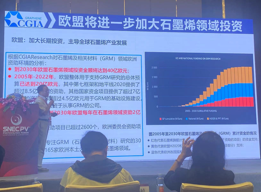 在6.14日(ri)第(di)8屆石墨(mo)烯及(ji)新(xin)材(cai)料前沿應(ying)用(yong)技術高峰討論(lun)上,李義春(chun)先生就全球石墨(mo)烯發展趨勢與(yu)石墨(mo)烯在電光領域的應(ying)用(yong)分享(xiang)。 首先介紹國(guo)內石墨(mo)烯發展趨勢(shi),國(guo)家投(tou)資8個億來發展。 截止(zhi)2024年(nian)05月10日(ri),國內在工商部門注冊(ce)涉及石(shi)(shi)墨(mo)烯(xi)相關(guan)業(ye)務的(de)存續(xu)企業(ye)數(shu)量達到5.8萬家(jia),其中(zhong),擁有專利的(de)企業(ye)數(shu)量11521家(jia),高新技(ji)術企業(ye)5474家(jia),有融資的(de)871家(jia),專精特新企業(ye)30多家(jia)。“石(shi)(shi)墨(mo)烯(xi)熱”仍在持續(xu),全國已成立石(shi)(shi)墨(mo)烯(xi)產(chan)業(ye)園60家(jia),石(shi)(shi)墨(mo)烯(xi)研(yan)究院113家(jia),石(shi)(shi)墨(mo)烯(xi)產(chan)業(ye)創新中(zhong)心17家(jia)。 其次(ci)介紹歐盟加大發展石墨(mo)烯發展,截止(zhi)到2030年(nian)歐盟每年(nian)在(zai)石墨(mo)烯投資(zi)資(zi)助達到2億。項目(mu)超過2600個。 最后介紹了(le)石墨烯是一種新材料,發展前景十分廣闊。一旦實現了(le)成功的(de)顛覆性創(chuang)新,市場就會以波瀾壯闊的(de)交易生成進行回(hui)應。