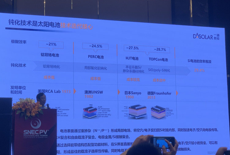 宋登元博士(shi)在全球光伏前沿技(ji)術(shu)(shu)大會(6):異(yi)質(zhi)結與(yu)TOPCon電池上針(zhen)對高效(xiao)N型(xing)26+%TOPCon4.0技(ji)術(shu)(shu)及未來(lai)技(ji)術(shu)(shu)路線進行分享(xiang)。 宋登元(yuan)博士介紹了SFOS超(chao)高效(xiao)太陽電(dian)池理論最高效(xiao)率可以記過(guo)40%,將推動新(xin)一代高效(xiao)電(dian)池的技術革命。至2023年,我國新(xin)增(zeng)裝機(ji)216.88GW,累(lei)計并(bing)網容量達609.5GW。截(jie)至2023年6月(yue)底,光伏發電(dian)累(lei)計裝機(ji)規(gui)模(mo)約470GW,已超(chao)過(guo)水電(dian)415GW,成為我國裝機(ji)規(gui)模(mo)第三大(da)電(dian)源,同時鈍(dun)化技術是太陽電(dian)池技術迭代核心。 目前TOPCon電池(chi)(chi)己經成(cheng)為N型(xing)電池(chi)(chi)的主(zhu)流(liu)(liu),落地產能達到200-240GW,其中份額為:TOPCon23%,HJT為2.6%,PCon2024年超過50%。TOPCon是(shi)到目前為止唯一的一種首(shou)先在中國大規模產業化的技術!TOPCon是(shi)一種校心電池(chi)(chi)結(jie)構(gou)(gou),可以演變為TBC和PBC基(ji)于SiO2/Poly-Si化接觸結(jie)構(gou)(gou)司時具有(you)面鈍化與(yu)載流(liu)(liu)子的選擇(ze)性收集(ji)的作用。 TOPCOn4.0技(ji)(ji)術(shu)(shu)助力開壓超(chao)742mV,效(xiao)(xiao)率(lv)(lv)提升超(chao)26.5%。通過(guo)在勢室(shi)塑(su)形技(ji)(ji)術(shu)(shu),調(diao)控勢壘(lei)形狀,提升隧穿幾(ji)率(lv)(lv)及載流(liu)子選(xuan)擇(ze)性、高的光譜(pu)利用技(ji)(ji)術(shu)(shu)300nm EQE>85%、激光高通量載流(liu)子注入技(ji)(ji)術(shu)(shu)大幅降(jiang)低接觸電(dian)阻,同時技(ji)(ji)術(shu)(shu)全(quan)面(mian)布局,效(xiao)(xiao)率(lv)(lv)超(chao)40%。