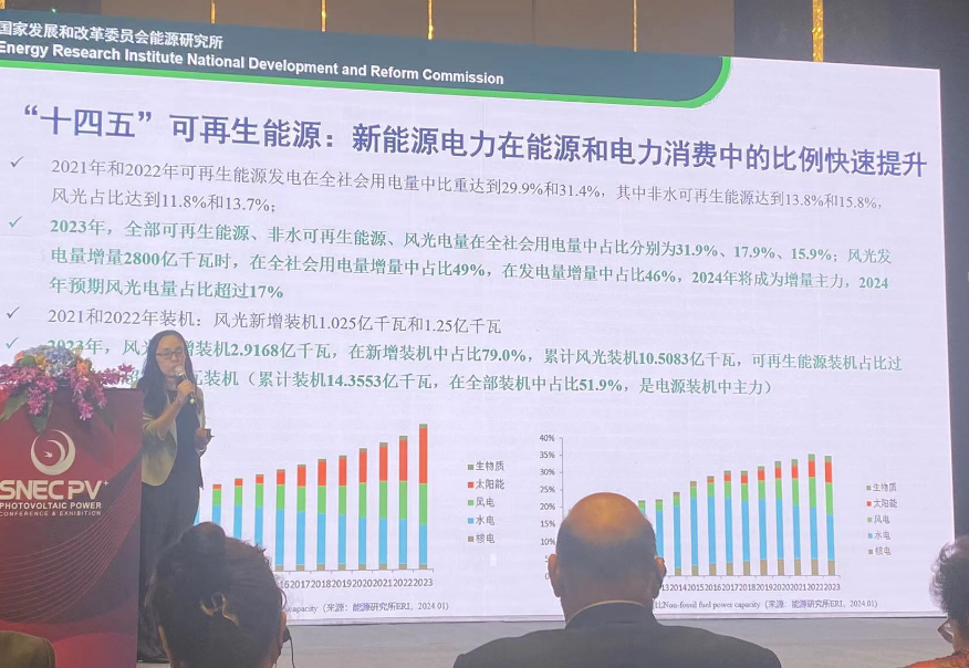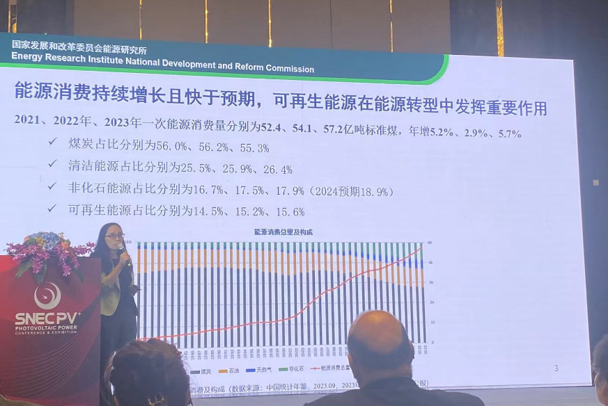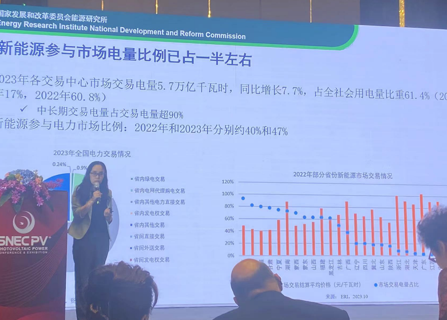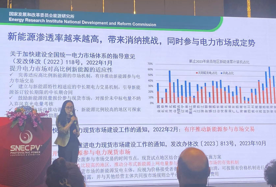 在6.14日第十二屆全球綠色能源與(yu)光伏(fu)金融峰會上時(shi)璟麗女士就光伏(fu)發(fa)電市場(chang)化機制建設進行分享。 首(shou)先進入十四五以來(lai),綠(lv)色能源(yuan)、綠(lv)色金融(rong)得(de)到(dao)(dao)了(le)前(qian)所(suo)未有的(de)(de)重視(shi),今年3月份(fen)七個(ge)部(bu)門聯合發布了(le)文(wen)件。強(qiang)化《金融(rong)支持綠(lv)色發展的(de)(de)指導見》 十四五期間,國家能源(yuan)是持續增長(chang)。 去年能源(yuan)消費(fei)的(de)(de)增速達(da)到(dao)(dao)了(le)5.7% 預期2024年會比去年同比提(ti)高1個(ge)百(bai)分點。主(zhu)要是因為去年光(guang)伏(fu)和風電兩(liang)個(ge)新(xin)能源(yuan)的(de)(de)裝機達(da)到(dao)(dao)了(le)創記錄的(de)(de)29億KW 使去年年底(di)可再生能源(yuan)累(lei)計裝機超14KW。 其(qi)次可再(zai)生能源(yuan)在(zai)全部電型裝(zhuang)機量(liang)中(zhong)的比例超過50%, 已經是電源(yuan)裝(zhuang)機中(zhong)的主大力(li)(li)。同時國(guo)外電力(li)(li)需求(qiu)也占到20%-30%中(zhong)。 同時(shi)新能源(yuan)(yuan)滲透率越來越高,帶(dai)來消納(na)挑戰。去年新能源(yuan)(yuan)參與市場的電量在(zai)全部新能源(yuan)(yuan)發電量的占比達到(dao)了(le)55%且(qie)占主導,在(zai)2023年交易電量仍超90%。 最后就市場發展(zhan)形勢提(ti)出建議(yi),其中浙江:提(ti)出政府(fu)授(shou)權差價合約方式,但是年度的,并不是長期的;山(shan)東(dong)征求意見(jian)稿:新老劃斷(duan),以(yi)2023年12月19日為界限。