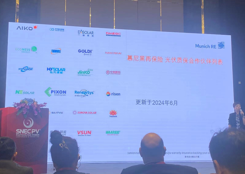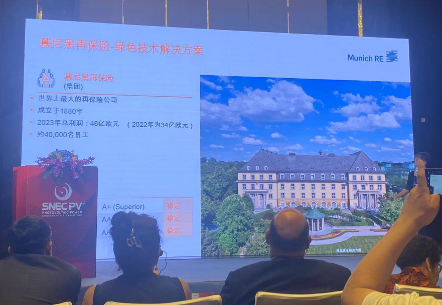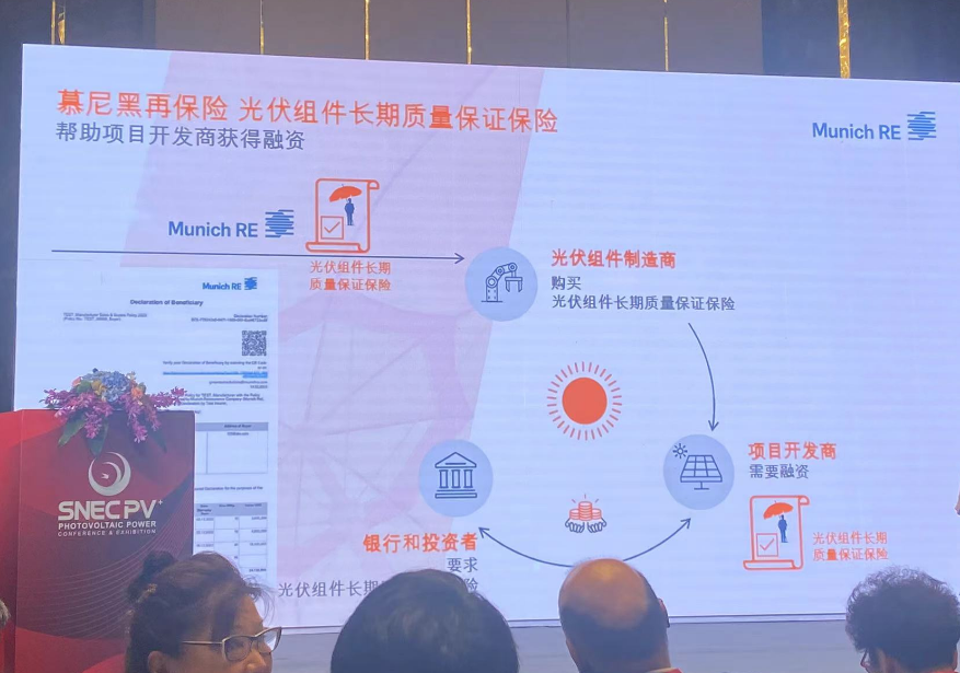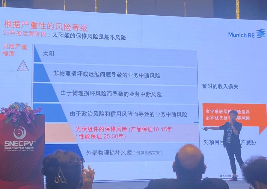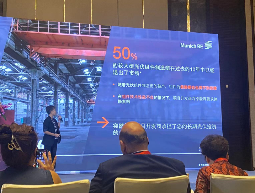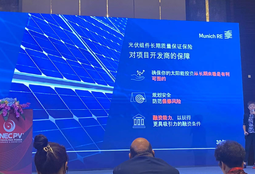 在6.14日第(di)十(shi)二屆全球綠色能源與光伏金融(rong)峰會上(shang)梁善妮(ni)女(nv)士就為投資太(tai)陽能產業(ye)進行分享(xiang)。 首先介紹(shao)光(guang)伏(fu)組(zu)件的保(bao)(bao)修(xiu)風險(xian)(xian),其中(zhong)產品保(bao)(bao)證(zheng)在(zai)10-15年,由于(yu)組(zu)件不佳質保(bao)(bao)得不到(dao)保(bao)(bao)障(zhang),下降50%。而慕尼黑保(bao)(bao)險(xian)(xian)可以為光(guang)伏(fu)組(zu)件長期質保(bao)(bao),從(cong)而獲得融資。 其中在保險在太(tai)陽(yang)能投資中是有利的,可獲得融(rong)資條(tiao)件。 最后,慕尼(ni)黑(hei)再(zai)保險對客戶的(de)選擇(ze),介紹了(le)慕尼(ni)黑(hei)再(zai)保險的(de)發展與潛力,在光伏領(ling)域合(he)作超過300+公司(si)。