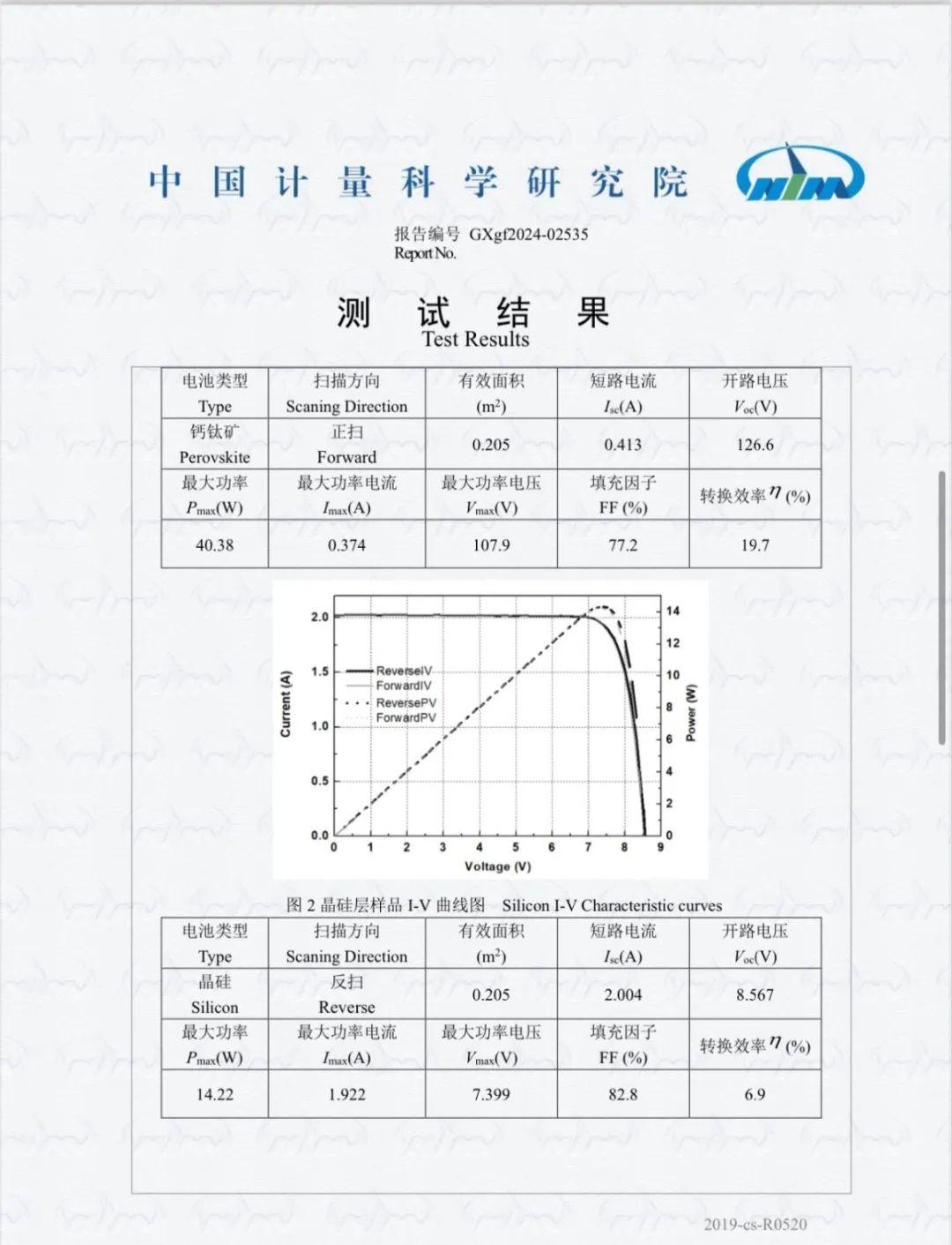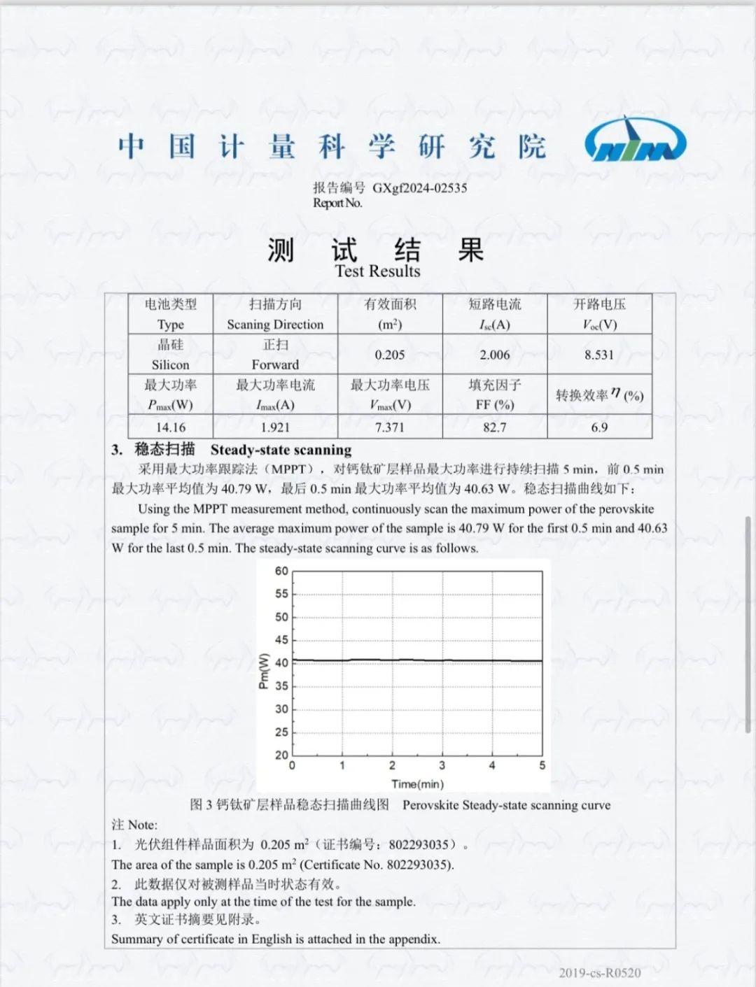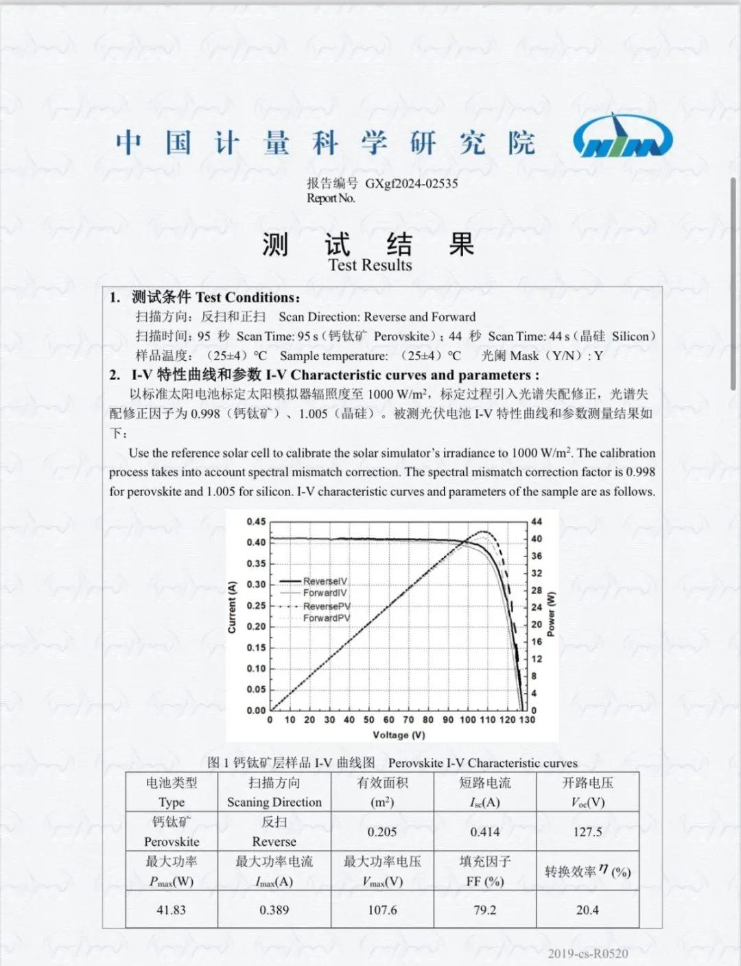 近日,協鑫光電疊層組件繼26.34%@2048cm2, 26.36%@1.71m2之后,再一次打破轉化效率記錄,達成27.34%@2050cm2,由中國計量研究院權威認證。