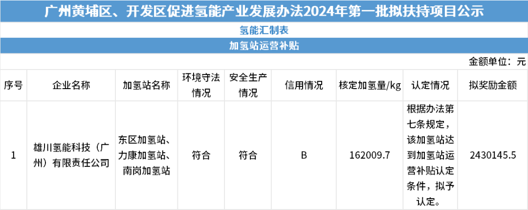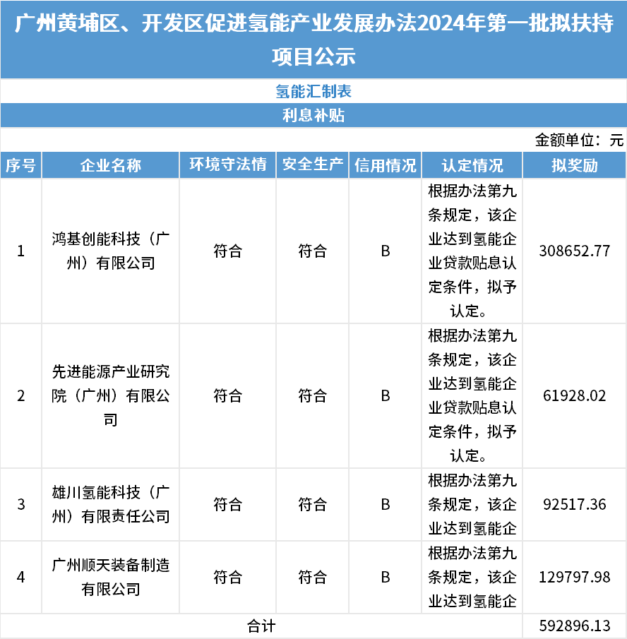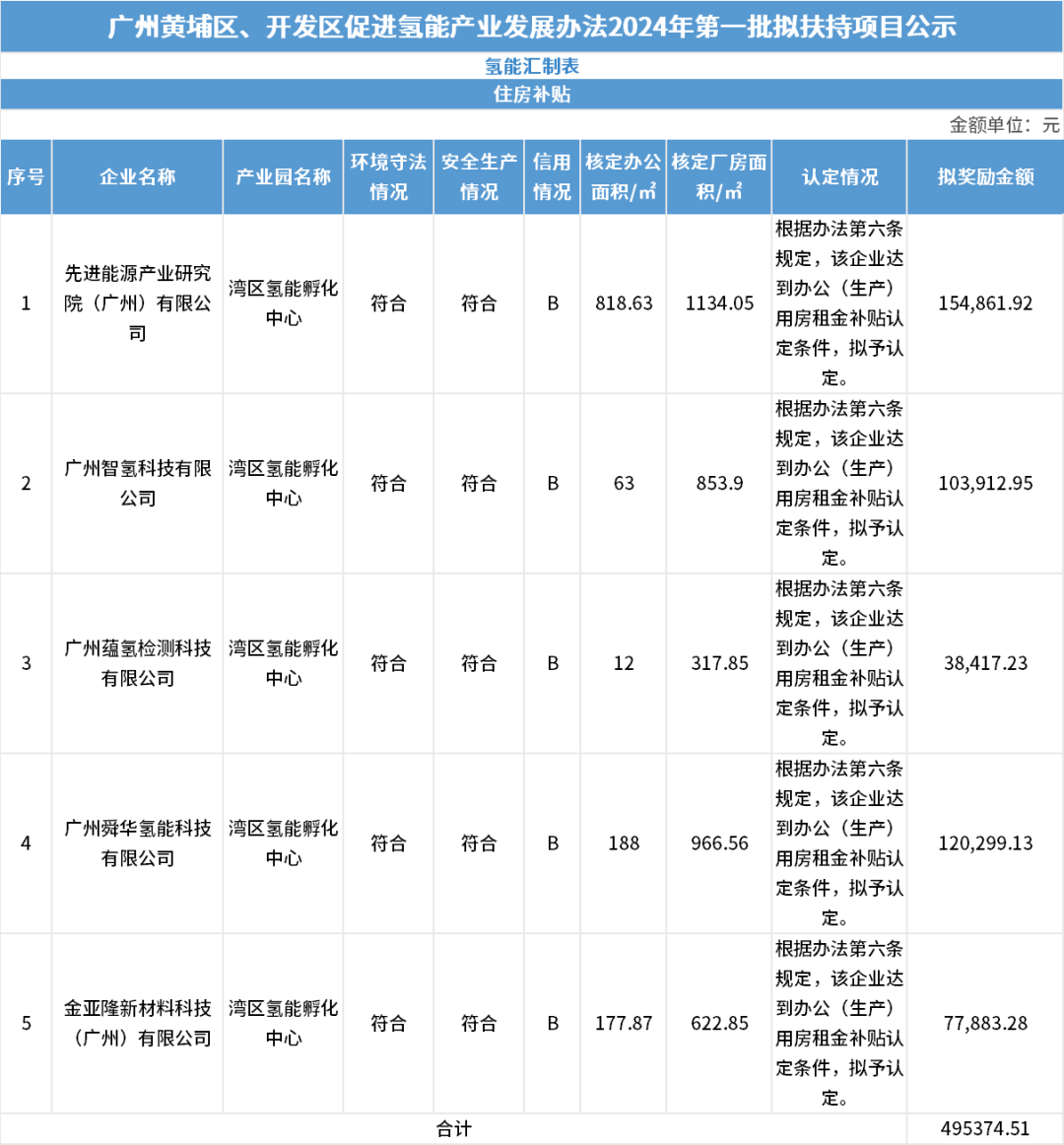 7月16日,廣(guang)州黃(huang)埔(pu)區(qu)人(ren)民(min)政府發(fa)布《黃(huang)埔(pu)區(qu)發(fa)展(zhan)(zhan)改革(ge)局 廣(guang)州開發(fa)區(qu)發(fa)展(zhan)(zhan)改革(ge)局關于區(qu)促進氫(qing)能(neng)產業(ye)發(fa)展(zhan)(zhan)辦法2024年第一(yi)批擬扶持(chi)項(xiang)目公示》,根據公示內容(rong)顯示:先進能源產業研究院(廣州)有限公司、廣州智氫科技有限公司、廣州蘊氫檢測科技有限公司、廣州舜華氫能科技有限公司、金亞隆新材料科技(廣州)有限公司五家公司擬獲得合計495374.51元的住房補貼。其中,先進(jin)能源產業研究院(廣州)有限公司擬獲得的住房(fang)補貼金(jin)額最高,達到(dao)154,861.92元。 住房補貼是根據《廣州市黃埔區 廣州開發區促進氫能能產業發展辦法》規定:符合引進條件的氫能企業或機構入駐經認定的氫能產業園或其他載體,租用辦公、生產用房且自用的,辦公用房按實際租金的50%給予補貼,生產用房按10元/平/月給予補貼,每家企業每年最高補貼100萬元,補貼期限最多3年。本次補貼時間為2023年6月12日至2024年6月11日。 鴻基創能(neng)科技(廣州(zhou))有限(xian)公(gong)司、先進(jin)能(neng)源(yuan)產業(ye)研(yan)究院(yuan)(廣州(zhou))有限(xian)公(gong)司、雄(xiong)川氫能(neng)科技(廣州(zhou))有限(xian)責(ze)任公(gong)司、廣州(zhou)順天裝備制造有限(xian)公(gong)司四(si)家(jia)公(gong)司擬獲得合計592896.13元的利(li)息補貼(tie)。 雄川氫(qing)(qing)能科技(廣州)有限(xian)責任公司擬(ni)獲得2430145.5元(yuan)的加氫(qing)(qing)站運營(ying)補(bu)貼。 此次公示的期間為:2024年7月16日至7月25日 公示期內(nei),提(ti)出異議(yi)或反映(ying)情況的單位(wei)或個(ge)人需(xu)提(ti)供真(zhen)(zhen)實身份證(zheng)(zheng)明及(ji)有效證(zheng)(zheng)明材(cai)料,書面材(cai)料要由單位(wei)法(fa)人或個(ge)人簽(qian)署或自報真(zhen)(zhen)實姓名(ming)并(bing)留聯系電話,否則不予受理。