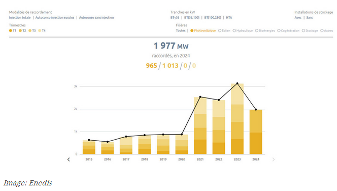 法國電網運營商Enedis公司日前發布了該國在2024年第二季度新增光伏系統的數據。今年4月至6月,光伏開發商安裝了1013MW的光伏系統,高于今年第一季度的965MW。而在創紀錄增長的2023年第一季度和第二季度,光伏開發商分別安裝了691MW和747MW光伏系統。 圖1 法國2015年~2024年安裝的光伏系統(MW) 法國在今年上半年新增的能源設施還包括18MW的儲能系統和710MW的自用能源設施,其中第一季度為336MW,第二季度為373MW。大多數自用能源設施(650MW)向電網出售多余的電力。 法國生態轉型部表示,法國在今年第一季度新增的光伏系統約為1GW。相比之下,該國在2023年第四季度新增了984MW光伏系統,在2023年第一季度新增了639MW光伏系統。 2023年,法國新增的光伏系統裝機容量為3.2GW,而2022年為2.68GW,2021年為2.57GW。截止到2024年3月,法國累計安裝的光伏系統裝機容量達到21.1GW,其中法國本土約20.3GW,科西嘉島和海外領土合計為0.8GW。 上一篇: 挪威建筑光伏裝機潛力達31GW