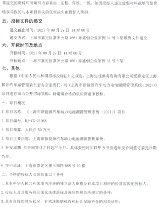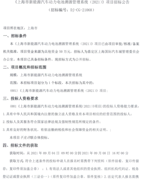 上(shang)海(hai)嘉定區上(shang)海(hai)國際(ji)汽車(che)(che)城管理委員會辦公(gong)室(shi)發布《上(shang)海(hai)市新(xin)能源汽車(che)(che)動力電池(chi)溯源管理系統(2021)》項目招標(biao),項目預算50萬元,不接受(shou)聯(lian)合(he)體投標(biao)。詳情如下(xia):