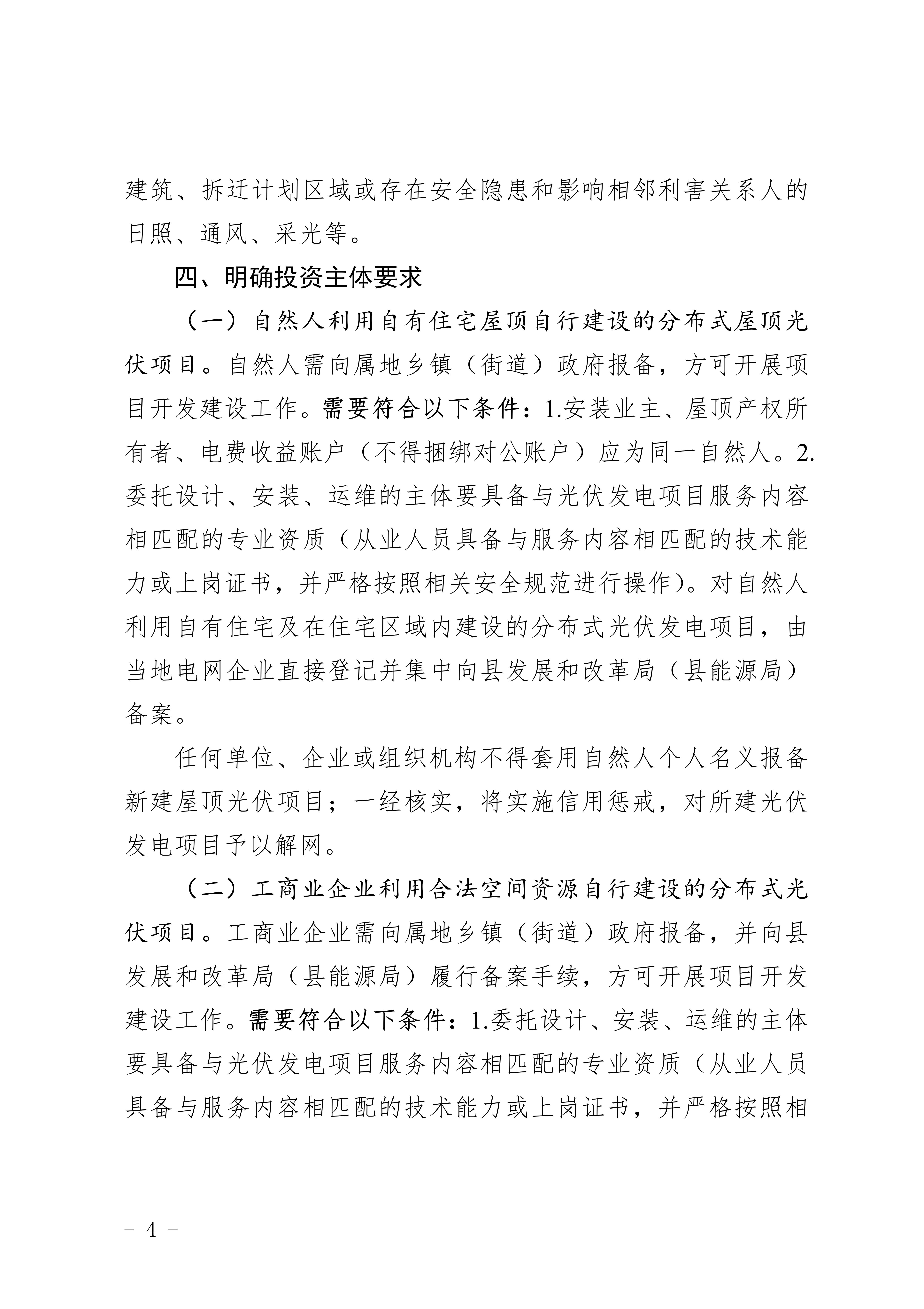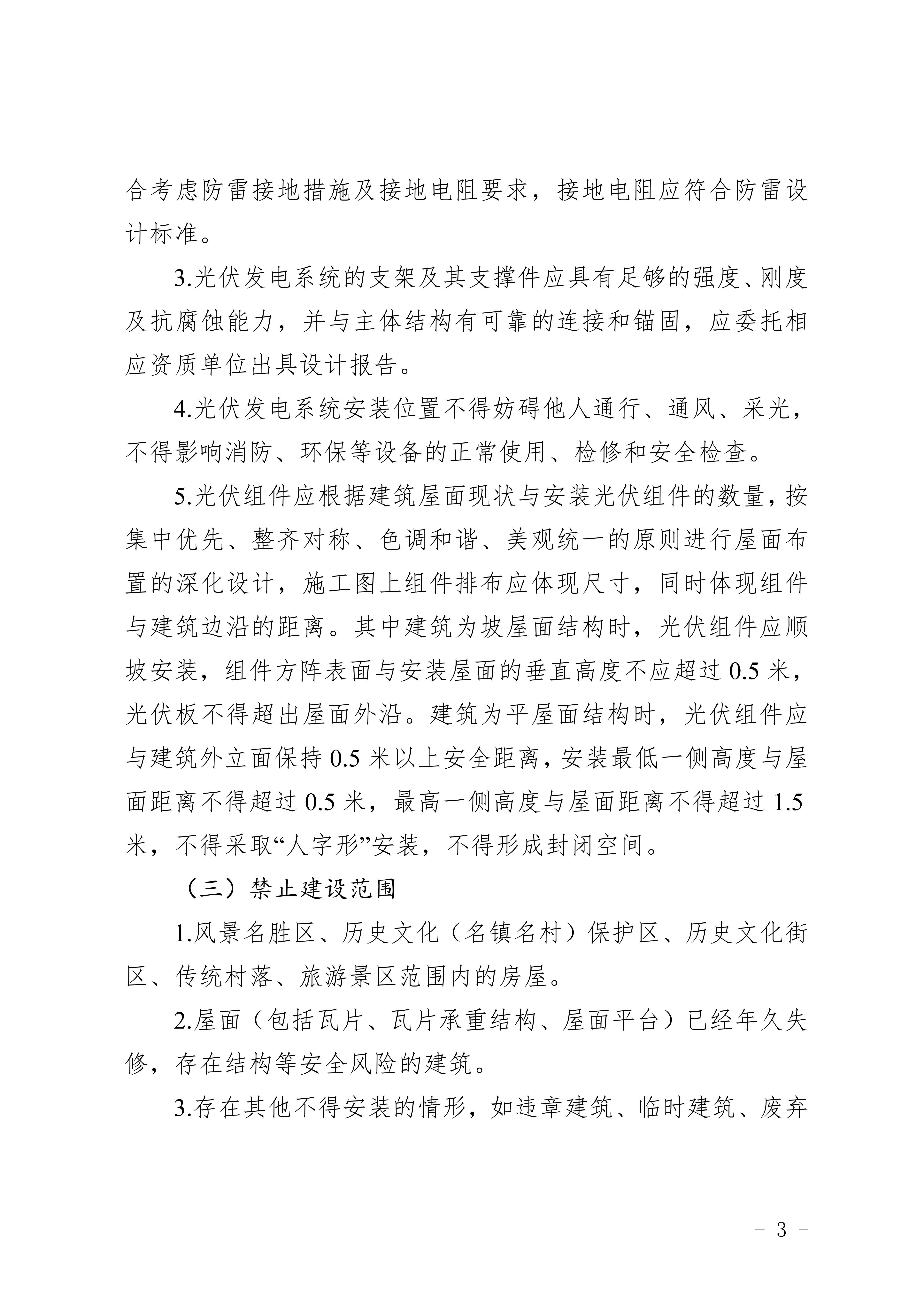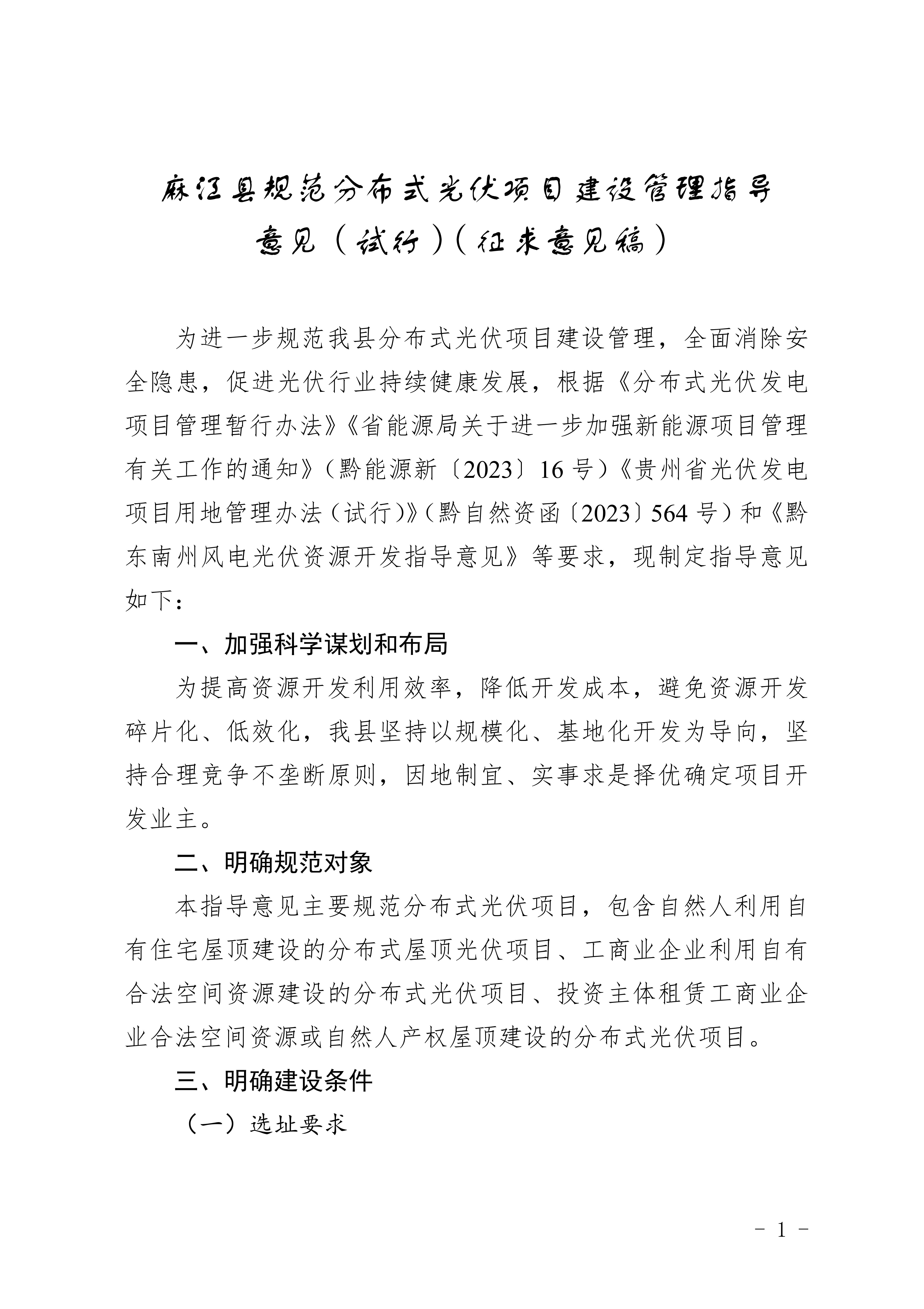 9月4日,麻江縣發展和改革局關于發布公開征求《麻江縣規范分布式光伏項目建設管理指導意見 (試行)》(征求意見稿) 意見的公告,公告顯示,以220伏、380伏低壓接入的分布式屋頂(ding)光(guang)伏項目(mu)裝機(ji)規(gui)模不應(ying)超過現有(you)配變容量(liang)和低壓(ya)線路承載能力的80%。 建筑為坡(po)(po)屋(wu)面(mian)結(jie)構(gou)時(shi),光伏(fu)組件(jian)應(ying)(ying)順坡(po)(po)安(an)裝(zhuang),組件(jian)方陣表面(mian)與安(an)裝(zhuang)屋(wu)面(mian)的垂(chui)直高(gao)度不應(ying)(ying)超(chao)過0.5米(mi),光伏(fu)板不得(de)超(chao)出(chu)屋(wu)面(mian)外沿。建筑為平屋(wu)面(mian)結(jie)構(gou)時(shi),光伏(fu)組件(jian)應(ying)(ying)與建筑外立面(mian)保持0.5米(mi)以上安(an)全距離,安(an)裝(zhuang)最(zui)低一側(ce)高(gao)度與屋(wu)面(mian)距離不得(de)超(chao)過0.5米(mi),最(zui)高(gao)一側(ce)高(gao)度與屋(wu)面(mian)距離不得(de)超(chao)過1.5米(mi),不得(de)采(cai)取“人字(zi)形”安(an)裝(zhuang),不得(de)形成封閉(bi)空間。 禁止建設范圍: 1.風景(jing)名(ming)(ming)(ming)勝區、歷史(shi)文化(hua)(名(ming)(ming)(ming)鎮名(ming)(ming)(ming)村(cun)(cun))保護區、歷史(shi)文化(hua)街區、傳統村(cun)(cun)落、旅游景(jing)區范(fan)圍內的房屋(wu)。 2.屋面(包括瓦(wa)片、瓦(wa)片承重結構(gou)、屋面平臺)已經年久失修,存在結構(gou)等安全(quan)風險的建筑。 3.存在(zai)其他不得(de)安(an)裝的情形,如違(wei)章建筑(zhu)、臨(lin)時建筑(zhu)、廢(fei)棄建筑(zhu)、拆遷計劃區域或存在(zai)安(an)全隱(yin)患和(he)影響相鄰利害關系(xi)人的日(ri)照、通風、采光等。 原文如下: 麻江縣發展和改革局關于公開征求《麻江縣規范分布式 光伏項目建設管理指導意見(試行)》 (征求意見稿)意見的公告 為進(jin)一步(bu)規范(fan)(fan)我縣(xian)分(fen)布式光伏項目(mu)(mu)(mu)建(jian)設管(guan)理,全面消除安全隱患,促進(jin)光伏行(xing)業(ye)持續健康發(fa)展(zhan),根(gen)據《分(fen)布式光伏發(fa)電(dian)(dian)項目(mu)(mu)(mu)管(guan)理暫行(xing)辦法(fa)(fa)》《省能源(yuan)局關(guan)于進(jin)一步(bu)加強新(xin)能源(yuan)項目(mu)(mu)(mu)管(guan)理有(you)關(guan)工作的(de)通知(zhi)》(黔能源(yuan)新(xin)〔2023〕16號)《貴州省光伏發(fa)電(dian)(dian)項目(mu)(mu)(mu)地(di)管(guan)理辦法(fa)(fa)(試行(xing))》(黔自然資(zi)函〔2023〕564號)和《黔東南州風(feng)電(dian)(dian)光伏資(zi)源(yuan)開(kai)發(fa)指(zhi)導意見(jian)》等(deng)要求(qiu),結(jie)合我縣(xian)實際,研究形成了《麻(ma)江(jiang)縣(xian)規范(fan)(fan)分(fen)布式光伏項目(mu)(mu)(mu)建(jian)設管(guan)理指(zhi)導意見(jian)(試行(xing))》(征求(qiu)意見(jian)稿),現面向社會(hui)公(gong)開(kai)征求(qiu)意見(jian),公(gong)開(kai)征求(qiu)意見(jian)時間為2024年(nian)9月4日(ri)至(zhi)(zhi)2024年(nian)10月4日(ri)。如有(you)修(xiu)改意見(jian)或(huo)建(jian)議,可通過(guo)撥(bo)打電(dian)(dian)話(hua)或(huo)是電(dian)(dian)子郵件方式反饋至(zhi)(zhi)麻(ma)江(jiang)縣(xian)發(fa)展(zhan)和改革(ge)局。 聯系人:凌忠權 聯系電話:0855-2623220 郵 箱:mjfgj2622438@163.com 麻江(jiang)縣規范分布式光伏項目(mu)建設管理指導意見(jian)(試行(xing))(征求意見(jian)稿).doc 《麻江縣(xian)規范分(fen)布式光伏項(xiang)目建設(she)管理指導意(yi)(yi)見(試行)》(征求(qiu)意(yi)(yi)見稿)政策解讀.docx 麻江縣發展和改革局 2024年9月4日 上一篇: 江蘇連云港擬出臺海上光伏海事監管暫行辦法