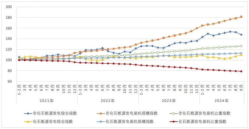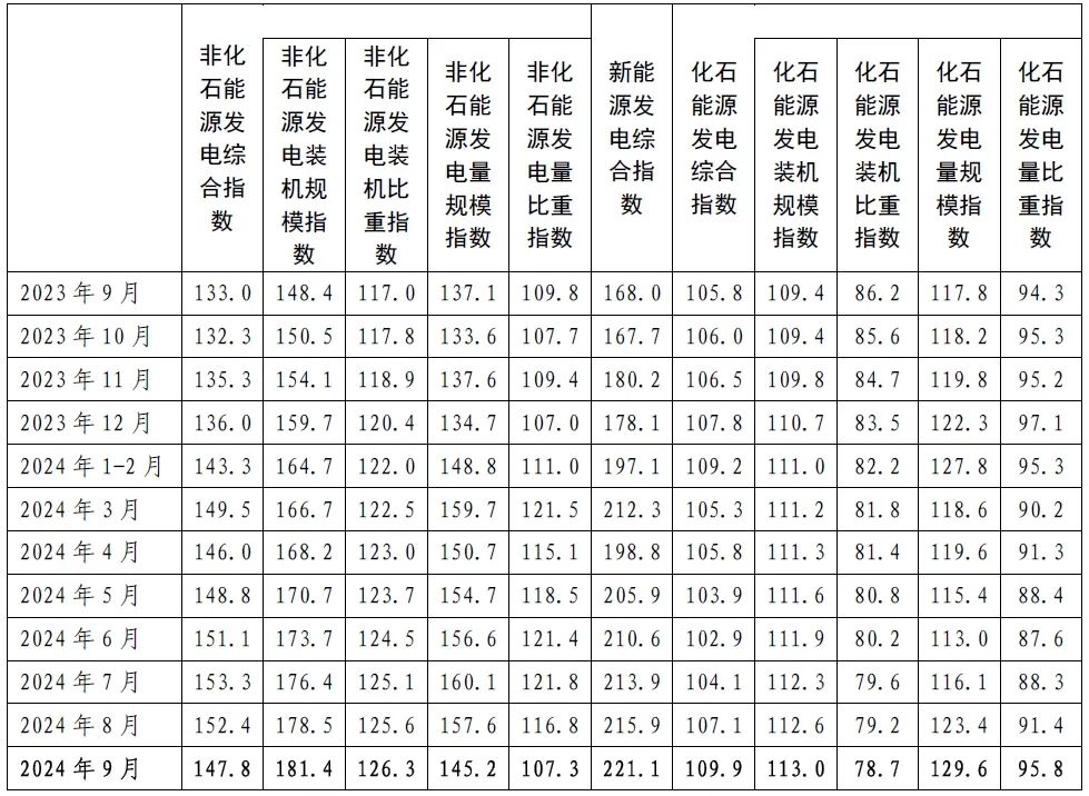 2024年9月,非化(hua)石能(neng)源發(fa)(fa)電(dian)綜(zong)合指(zhi)數(shu)為147.8,比(bi)2020年基(ji)期增(zeng)(zeng)長了(le)47.8%,同(tong)比(bi)增(zeng)(zeng)長11.1%;其中,新(xin)能(neng)源發(fa)(fa)電(dian)綜(zong)合指(zhi)數(shu)為221.1,比(bi)2020年基(ji)期增(zeng)(zeng)長了(le)121.1%,同(tong)比(bi)增(zeng)(zeng)長31.6%。在“雙碳”目標引領下,非化(hua)石能(neng)源發(fa)(fa)電(dian)綜(zong)合指(zhi)數(shu)快(kuai)速增(zeng)(zeng)長。其中: 9月,非化石能(neng)源(yuan)發電裝(zhuang)(zhuang)(zhuang)機(ji)規(gui)(gui)模指(zhi)數(shu)為(wei)181.4,“十(shi)四五(wu)”以來非化石能(neng)源(yuan)發電裝(zhuang)(zhuang)(zhuang)機(ji)規(gui)(gui)模累計增長(chang)了(le)81.4%,同比(bi)(bi)(bi)增長(chang)22.2%。非化石能(neng)源(yuan)發電裝(zhuang)(zhuang)(zhuang)機(ji)比(bi)(bi)(bi)重指(zhi)數(shu)為(wei)126.3,“十(shi)四五(wu)”以來非化石能(neng)源(yuan)發電裝(zhuang)(zhuang)(zhuang)機(ji)比(bi)(bi)(bi)重累計提升了(le)26.3%(比(bi)(bi)(bi)重從2020年底(di)的44.8%提高至2024年9月底(di)的56.5%)。 非(fei)化石能源發(fa)電(dian)量(liang)(liang)規模指(zhi)(zhi)數為145.2,比(bi)2020年基(ji)期增(zeng)長(chang)了(le)45.2%,年均增(zeng)長(chang)9.8%,同比(bi)增(zeng)長(chang)5.9%,同比(bi)增(zeng)速(su)比(bi)上月(yue)回落10.2個百(bai)分點(dian),主要(yao)是受水(shui)電(dian)發(fa)電(dian)量(liang)(liang)增(zeng)速(su)大幅(fu)回落影響。9月(yue),非(fei)化石能源發(fa)電(dian)量(liang)(liang)比(bi)重指(zhi)(zhi)數為107.3,比(bi)2020年基(ji)期比(bi)重提升了(le)7.3%。 9月,化石(shi)能源發電綜合指數(shu)為(wei)109.9,比2020年(nian)基期增長了9.9%,同比增長3.9%。其中: 化(hua)(hua)石(shi)能源(yuan)發電裝(zhuang)機(ji)(ji)規模(mo)(mo)指數為113.0,“十四五”以(yi)來(lai)化(hua)(hua)石(shi)能源(yuan)發電裝(zhuang)機(ji)(ji)規模(mo)(mo)累(lei)計(ji)增(zeng)長了13.0%,同比(bi)增(zeng)長3.3%。化(hua)(hua)石(shi)能源(yuan)發電裝(zhuang)機(ji)(ji)比(bi)重(zhong)指數為78.7,“十四五”以(yi)來(lai)化(hua)(hua)石(shi)能源(yuan)發電裝(zhuang)機(ji)(ji)比(bi)重(zhong)累(lei)計(ji)下降了21.3%(比(bi)重(zhong)從(cong)2020年(nian)底(di)的55.2%降至(zhi)2024年(nian)9月底(di)的43.5%),隨著新能源(yuan)裝(zhuang)機(ji)(ji)的快速增(zeng)長,化(hua)(hua)石(shi)能源(yuan)裝(zhuang)機(ji)(ji)比(bi)重(zhong)持(chi)續下降。 化石能(neng)源發電(dian)量規模指數(shu)為129.6,比(bi)2020年基期增(zeng)(zeng)長(chang)(chang)29.6%,年均增(zeng)(zeng)長(chang)(chang)6.7%,同比(bi)增(zeng)(zeng)長(chang)(chang)10.0%,同比(bi)增(zeng)(zeng)速(su)比(bi)上(shang)月提高(gao)5.3個百分點。當(dang)月電(dian)力消費較快增(zeng)(zeng)長(chang)(chang),而非(fei)化石能(neng)源發電(dian)量增(zeng)(zeng)速(su)比(bi)上(shang)月明顯回落,化石能(neng)源發揮(hui)兜底保供作(zuo)用,發電(dian)量增(zeng)(zeng)速(su)比(bi)上(shang)月回升較多。化石能(neng)源發電(dian)量比(bi)重指數(shu)為95.8,化石能(neng)源發電(dian)量比(bi)重與基期相比(bi)累計下降4.2%。 表(biao)1 全國電力供(gong)應系列指(zhi)數表(biao)(以2020年基期(qi)為100) 圖1 全國電力供(gong)應系(xi)列指數圖(以(yi)2020年基(ji)期為100) 附注 一、全國電力供應系列指數所包含的指標 電(dian)(dian)力供(gong)應系(xi)(xi)列(lie)指(zhi)(zhi)(zhi)數(shu)(shu)(shu)所(suo)包(bao)含的(de)(de)指(zhi)(zhi)(zhi)標(biao)有:非化(hua)(hua)(hua)石能(neng)源(yuan)發(fa)(fa)(fa)(fa)電(dian)(dian)綜合(he)(he)指(zhi)(zhi)(zhi)數(shu)(shu)(shu)、化(hua)(hua)(hua)石能(neng)源(yuan)發(fa)(fa)(fa)(fa)電(dian)(dian)綜合(he)(he)指(zhi)(zhi)(zhi)數(shu)(shu)(shu),其中,非化(hua)(hua)(hua)石能(neng)源(yuan)發(fa)(fa)(fa)(fa)電(dian)(dian)綜合(he)(he)指(zhi)(zhi)(zhi)數(shu)(shu)(shu)下面包(bao)含新(xin)能(neng)源(yuan)發(fa)(fa)(fa)(fa)電(dian)(dian)綜合(he)(he)指(zhi)(zhi)(zhi)數(shu)(shu)(shu)。每個(ge)發(fa)(fa)(fa)(fa)電(dian)(dian)綜合(he)(he)指(zhi)(zhi)(zhi)數(shu)(shu)(shu)選取的(de)(de)指(zhi)(zhi)(zhi)標(biao)均(jun)(jun)包(bao)括(kuo)發(fa)(fa)(fa)(fa)電(dian)(dian)裝機(ji)(ji)規模及比(bi)重(zhong)、發(fa)(fa)(fa)(fa)電(dian)(dian)量規模及比(bi)重(zhong)四個(ge)指(zhi)(zhi)(zhi)標(biao)。以這四個(ge)指(zhi)(zhi)(zhi)標(biao)為基(ji)礎,各賦予(yu)一定的(de)(de)權(quan)(quan)重(zhong)(產能(neng)、產量、結構(gou)三(san)個(ge)維度按均(jun)(jun)等權(quan)(quan)重(zhong)考慮,即裝機(ji)(ji)規模、發(fa)(fa)(fa)(fa)電(dian)(dian)量規模權(quan)(quan)重(zhong)均(jun)(jun)為三(san)分(fen)之一,裝機(ji)(ji)比(bi)重(zhong)、發(fa)(fa)(fa)(fa)電(dian)(dian)量比(bi)重(zhong)權(quan)(quan)重(zhong)分(fen)別(bie)為六分(fen)之一,合(he)(he)計三(san)分(fen)之一),采(cai)用指(zhi)(zhi)(zhi)數(shu)(shu)(shu)加權(quan)(quan)法合(he)(he)成(cheng)出發(fa)(fa)(fa)(fa)電(dian)(dian)綜合(he)(he)指(zhi)(zhi)(zhi)數(shu)(shu)(shu)(非化(hua)(hua)(hua)石能(neng)源(yuan)發(fa)(fa)(fa)(fa)電(dian)(dian)綜合(he)(he)指(zhi)(zhi)(zhi)數(shu)(shu)(shu)下面的(de)(de)新(xin)能(neng)源(yuan)發(fa)(fa)(fa)(fa)電(dian)(dian)綜合(he)(he)指(zhi)(zhi)(zhi)數(shu)(shu)(shu)也是根據(ju)新(xin)能(neng)源(yuan)發(fa)(fa)(fa)(fa)電(dian)(dian)產能(neng)、產量、結構(gou)三(san)個(ge)維度采(cai)用指(zhi)(zhi)(zhi)數(shu)(shu)(shu)加權(quan)(quan)法合(he)(he)成(cheng))。通過電(dian)(dian)力供(gong)應系(xi)(xi)列(lie)指(zhi)(zhi)(zhi)數(shu)(shu)(shu)可以反映自固定基(ji)期以來(lai)的(de)(de)非化(hua)(hua)(hua)石能(neng)源(yuan)(包(bao)括(kuo)新(xin)能(neng)源(yuan))/化(hua)(hua)(hua)石能(neng)源(