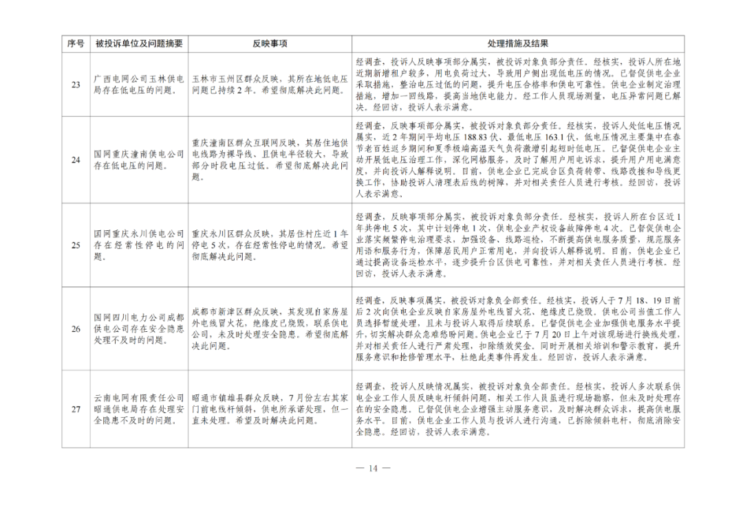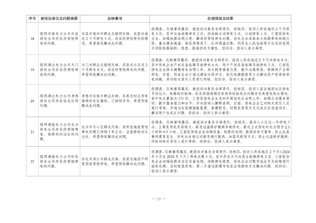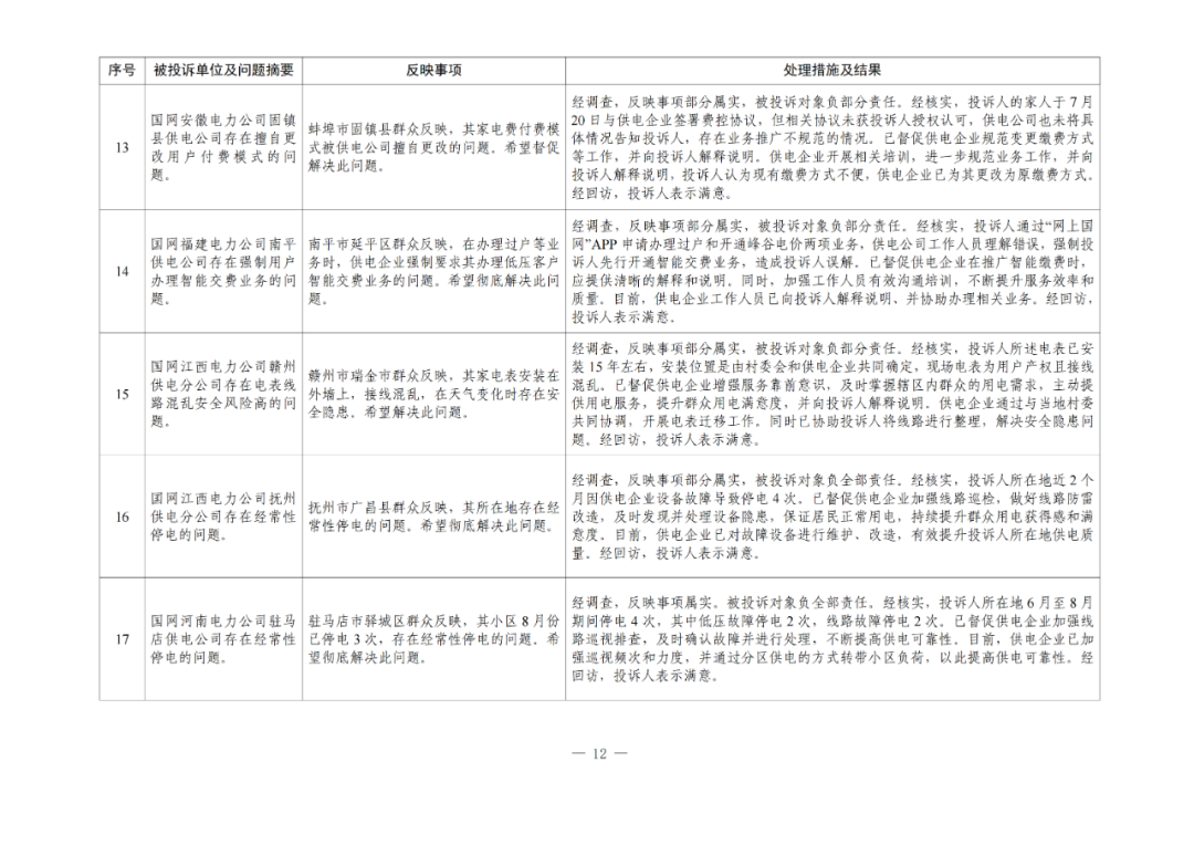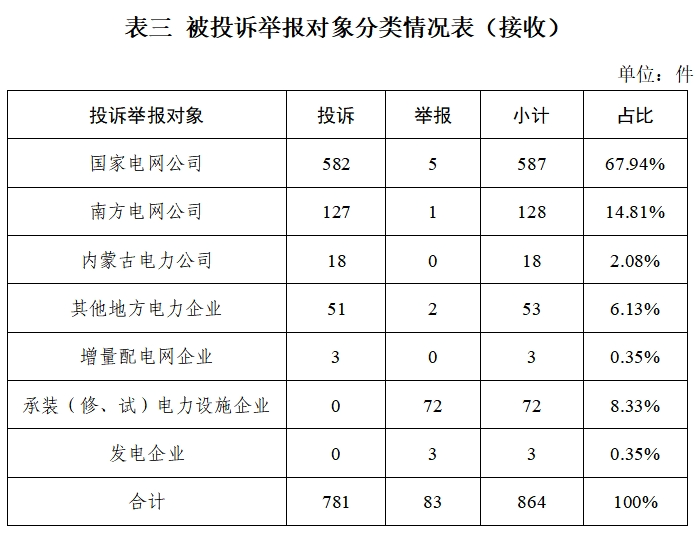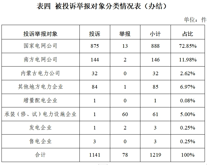 2024年9月,國家能源局12398能源監管熱線(以下簡稱12398熱線)共接收投訴舉報864件,辦結投訴舉報1219件(含往期結轉)。現將有關情況通報如下: 一、當月接收情況 2024年9月,12398熱線共接收投訴舉報864件,同比增長0.12%、環比下降18.57%。其中:投訴781件,同比增長4.13%、環比下降20.71%;舉報83件,同比下降26.55%、環比增長9.21%。 (一)分類情況 1.按被投訴舉報行業分類 電力行業排在首位,數量為827件、占投訴舉報總數的95.72%,主要集中在供電服務、市場準入、電力安全等方面。 新能源和可再生能源行業排在第二位,數量為37件、占投訴舉報總數的4.28%,主要集中在并網發電方面。 2.按被投訴舉報對象分類 供電企業789件、占投訴舉報總數的91.32%,其中國家電網公司587件、占投訴舉報總數的67.94%,南方電網公司128件、占投訴舉報總數的14.81%,內蒙古電力公司18件、占投訴舉報總數的2.08%,其他地方電力企業53件、占投訴舉報總數的6.13%,增量配電網企業3件、占投訴舉報總數的0.35%;承裝(修、試)電力設施企業72件、占投訴舉報總數的8.33%;發電企業3件,占投訴舉報總數的0.35%。 (二)地區分布情況 各省(自治區、直轄市)按照接收投訴舉報數量排序,四川、黑龍江、江蘇、安徽、廣東排在全國前5位。按百萬人均投訴舉報數量排序,西藏、吉林、四川、天津、黑龍江排在全國前5位。(2024年9月全國接收投訴舉報地區分布情況見附件1) (三)主要問題 2024年9月,接收的投訴舉報主要反映了4個方面的問題。 1.電能質量問題。供電設施損毀或用電負荷激增,導致經常停電和低電壓問題較多。相關投訴舉報數量靠前的2個省份為四川(57件)、陜西(20件)。 2.停電搶修問題。部分地區受高溫、暴雨影響,供電設備故障搶修時間較長,引發群眾投訴。相關投訴舉報數量靠前的2個省份為四川(14件)、遼寧(11件)。 3.用電報裝問題。部分供電企業在收到群眾充電樁、三相電、電采暖等用電報裝申請后,未按規定時限完成裝表接電。投訴舉報數量靠前的2個省份為江蘇(14件)、黑龍江(13件)。 4.新能源和可再生能源行業相關問題。部分地區分布式光伏發電項目因當地臺區容量不足導致并網困難。相關投訴舉報數量靠前的2個省份為廣西(4件)、江蘇(4件)。 二、當月處理情況 (一)受理情況 2024年9月,根據國家有關法規政策規定,國家能源局派出機構對屬于監管職責范圍的813件投訴舉報進行了受理,占接收數量的94.1%;其他不予受理的,已按照國家有關法規政策規定及時轉辦。 (二)辦結情況 2024年9月,國家能源局派出機構辦結投訴舉報1219件(含往期結轉),同比增長1.58%、環比增長61.24%,累計辦結率97.89%。其中:投訴1140件,同比增長8.26%、環比增長60.34%;舉報79件,同比下降46.26%、環比下降增長75.56%。 從被投訴舉報對象看,供電企業1154件、占投訴舉報總數的94.67%,其中國家電網公司888件、占比72.85%,南方電網公司146件、占比11.98%,內蒙古電力公司32件、占比2.63%,其他地方電力企業85件、占比6.97%,增量配電企業3件、占比0.25%;承裝(修、試)電力設施企業61件、占比5.0%;發電企業3件、占比0.25%;售電企業3件、占比0.25%。 (三)問題處置情況 針對群眾反映的投訴舉報,國家能源局派出機構嚴格按照有關法規政策規定進行處理。一是督促供電企業加大電力設施建設、維護等資源投入,采取有效措施解決經常性停電、低電壓等電能質量問題,進一步提升供電可靠性;二是要求供電企業加強設備隱患排查整治,加強停電搶修管理,加大線路巡視頻次,增加搶修資源投入,提升設備管控和停電搶修能力,切實提高供電可靠性;三是通過行政處罰、監管約談、責令整改等方式,糾正有關企業違法違規行為,維護公平公正的市場秩序和群眾合法權益;四是通過解釋說明、澄清事實,消除群眾誤解。(2024年9月12398熱線典型投訴舉報事項具體處理情況見附件2) 附件:1.2024年9月全國接收投訴舉報地區分布情況 2.2024年9月12398熱線典型投訴舉報事項具體處理情況