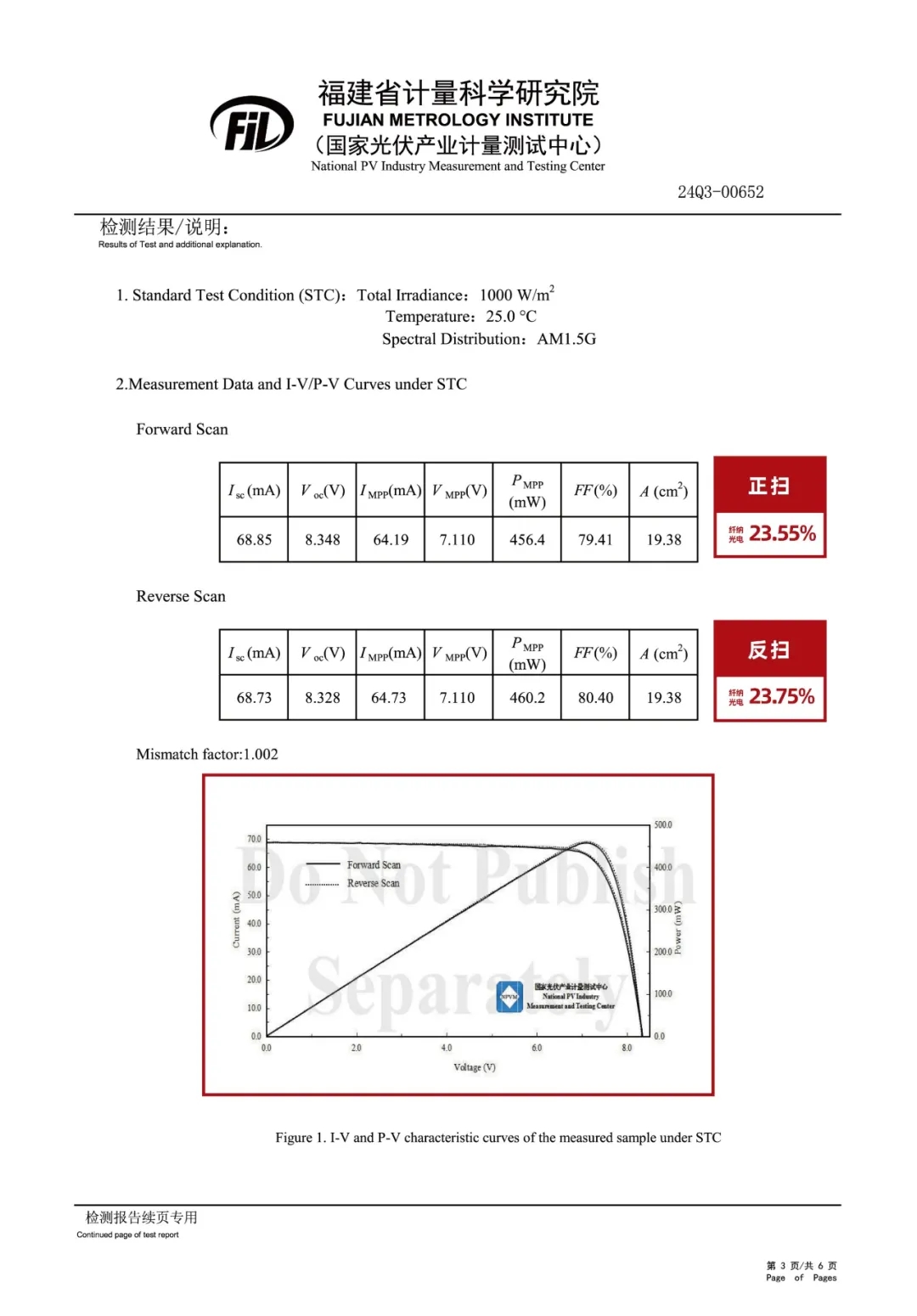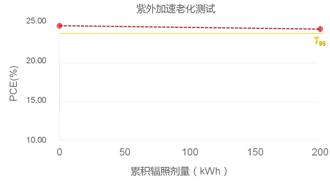 纖納光電以其獨樹(shu)一幟的(de)技術(shu)創新(xin),不斷推(tui)動鈣鈦礦產(chan)業(ye)化向前突破(po)。2024年10月,公司(si)自主研發的(de)冷凍激(ji)光修復技術(shu)成功助力(li)鈣鈦礦小組件實現(xian)了(le)23.65%(正反掃平均值)的(de)效率并取得(de)福建省計量科學研究院認證(zheng)證(zheng)書。 同時,該高效(xiao)(xiao)電池展現出(chu)超(chao)強(qiang)的光熱耐(nai)老(lao)化性能(neng),即便在經(jing)歷了遠(yuan)超(chao)IEC61215標(biao)準的紫(zi)外老(lao)化劑(ji)量(累計200kWh)后,組(zu)件(jian)效(xiao)(xiao)率衰減(jian)百分比(bi)仍小于(yu)5%,為鈣鈦礦技(ji)術實現更高水平的“穩效(xiao)(xiao)協同”做好了技(ji)術準備。 福建省計量科學(xue)研究院認(ren)證報告(gao) (紅色字體為纖(xian)納批(pi)注) 紫外加速老化(hua)測(ce)試圖 隨著鈣(gai)鈦(tai)礦技(ji)術(shu)(shu)(shu)發展逐(zhu)步深入(ru),目前(qian)鈣(gai)鈦(tai)礦實驗室小(xiao)面積(ji)(ji)器件(jian)效率紀錄已達(da)到26.7%,然而受(shou)限于較(jiao)為(wei)單一的(de)(de)主流技(ji)術(shu)(shu)(shu)路線,面積(ji)(ji)放大后的(de)(de)鈣(gai)鈦(tai)礦小(xiao)組件(jian)效率徘(pai)徊在(zai)22.5%左右,平米(mi)級組件(jian)效率徘(pai)徊在(zai)18%左右。面積(ji)(ji)放大時的(de)(de)結晶不均(jun)等缺(que)陷(xian)是困擾行業的(de)(de)主要痛(tong)(tong)點(dian)(dian)。纖納光(guang)電以行業痛(tong)(tong)點(dian)(dian)為(wei)導向(xiang),創造性地提(ti)(ti)出(chu)冷凍修復大面積(ji)(ji)結晶的(de)(de)技(ji)術(shu)(shu)(shu)解決(jue)方(fang)案(an),成果突破(po)了(le)過去幾年單一技(ji)術(shu)(shu)(shu)路線下的(de)(de)效率放大瓶頸,實現(xian)了(le)鈣(gai)鈦(tai)礦小(xiao)組件(jian)效率的(de)(de)再次跨越式(shi)提(ti)(ti)升。 在此基礎之上,纖納光電(dian)繼續堅持以穩(wen)(wen)效(xiao)(xiao)(xiao)協同(tong)為技(ji)術(shu)(shu)提升(sheng)的核心指引,堅持效(xiao)(xiao)(xiao)率創紀(ji)錄,穩(wen)(wen)定(ding)性也要突破,通過更加精準的結晶缺陷修(xiu)復和(he)界面(mian)鈍化,消(xiao)除了鈣(gai)鈦礦薄膜中(zhong)潛在的快速退化點,進一步提升(sheng)了電(dian)池整(zheng)體穩(wen)(wen)定(ding)性,在更高(gao)效(xiao)(xiao)(xiao)率的技(ji)術(shu)(shu)路(lu)線下,實現了比肩傳統多晶硅技(ji)術(shu)(shu)的紫外熱老(lao)化穩(wen)(wen)定(ding)性。 這(zhe)一(yi)新(xin)技(ji)(ji)術(shu)路線(xian)的(de)誕生(sheng),為纖(xian)納(na)單結鈣(gai)鈦礦(kuang)電(dian)池技(ji)(ji)術(shu)的(de)下一(yi)階段(duan)發展指明了(le)方向(xiang),是GW級產線(xian)產品(pin)在行業(ye)內卷形勢下突破性價比和可靠(kao)性壁(bi)壘的(de)新(xin)的(de)保障(zhang)。通過(guo)冷凍激光修復技(ji)(ji)術(shu)的(de)應用,纖(xian)納(na)光電(dian)有信心在提升生(sheng)產效率(lv)、降低成本(ben)的(de)同時,進(jin)一(yi)步推動鈣(gai)鈦礦(kuang)技(ji)(ji)術(shu)向(xiang)大規模商業(ye)化應用邁進(jin),真(zhen)正實現效率(lv)與穩定性并肩晶硅,開啟光伏領域的(de)新(xin)技(ji)(ji)術(shu)浪(lang)潮。
