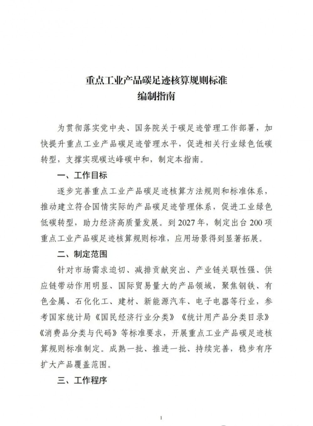 工信部(bu)11日發布關于印發《重(zhong)(zhong)點(dian)工業產品碳足(zu)跡(ji)核(he)算規則(ze)標準編制指南》的通知,明確提出,優先聚焦電(dian)(dian)力、煤炭(tan)、天然氣、燃油、鋼(gang)鐵、電(dian)(dian)解鋁(lv)、水泥(ni)、化肥、氫、石灰、玻璃、乙烯、合成氨、電(dian)(dian)石、甲醇(chun)、鋰電(dian)(dian)池、新能源汽車、光伏和(he)電(dian)(dian)子電(dian)(dian)器等重(zhong)(zhong)點(dian)產品,到2027年,制定出臺100個左(zuo)右(you)重(zhong)(zhong)點(dian)產品碳足(zu)跡(ji)核(he)算規則(ze)標準。 原文如下: 工業和信息化部辦公廳關于印發《重點工業產品碳足跡核算規則標準編制指南》的通知 工信廳節函(han)﹝2024﹞411號 有關行業協會(聯(lian)合(he)會)、標準(zhun)化技術組(zu)織、標準(zhun)化專(zhuan)業機構: 為貫徹(che)落實黨中央、國(guo)務院關于碳(tan)(tan)(tan)足(zu)跡(ji)管理工作(zuo)部署,加快提(ti)升重點(dian)(dian)工業(ye)(ye)產品(pin)碳(tan)(tan)(tan)足(zu)跡(ji)管理水(shui)平,促進相關行業(ye)(ye)綠色低碳(tan)(tan)(tan)轉型,支撐實現碳(tan)(tan)(tan)達峰(feng)碳(tan)(tan)(tan)中和,特制定《重點(dian)(dian)工業(ye)(ye)產品(pin)碳(tan)(tan)(tan)足(zu)跡(ji)核算(suan)規(gui)則標準編制指南》,請遵照(zhao)執行。 工業(ye)和信息化部辦公廳 2024年11月6日