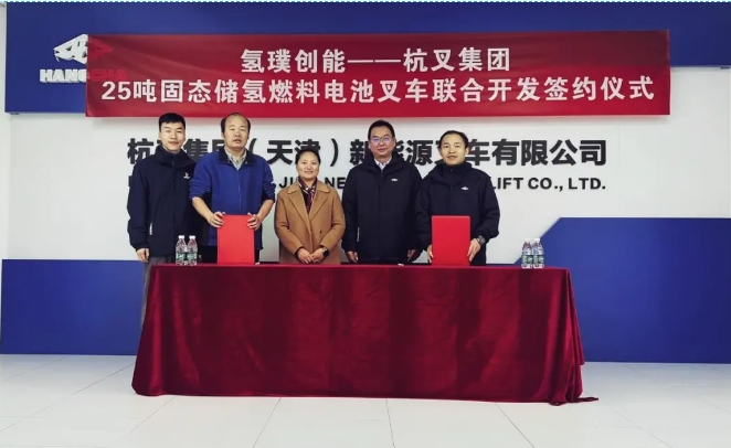 11月13日,北(bei)京氫(qing)(qing)璞創(chuang)能科(ke)技有(you)限公(gong)司(以下簡稱“氫(qing)(qing)璞創(chuang)能”)與杭(hang)叉(cha)(cha)集團(天津)新(xin)能源叉(cha)(cha)車有(you)限公(gong)司(以下簡稱“杭(hang)叉(cha)(cha)新(xin)能源”)在(zai)天津港保稅區成(cheng)功(gong)簽署重裝固態儲(chu)氫(qing)(qing)叉(cha)(cha)車聯合開發(fa)協議,此次協議聚焦于(yu)25噸固態儲(chu)氫(qing)(qing)燃料電池叉(cha)(cha)車開發(fa)項目(mu),標志著雙方(fang)在(zai)重載(zai)叉(cha)(cha)車領域的創(chuang)新(xin)合作邁出重要(yao)一步。 氫璞創能副總(zong)經理朱俊娥、杭(hang)叉(cha)新能源副總(zong)經理劉江出席簽(qian)約儀式(shi),氫璞創能項目(mu)負責人付云鵬、杭(hang)叉(cha)新能源公(gong)司總(zong)經理助理劉明(ming)清代表雙方(fang)簽(qian)署聯合開發協議(yi)。 固態(tai)儲氫(qing)(qing)技術具有(you)體(ti)積儲氫(qing)(qing)密度大、安全性(xing)能(neng)高等(deng)優勢,具有(you)廣闊的(de)(de)商業(ye)化前景。按照協議(yi),雙方(fang)將整合(he)各自優勢資源,在(zai)技術研發、應用創(chuang)新等(deng)方(fang)面深(shen)度協作。杭叉(cha)(cha)集團在(zai)叉(cha)(cha)車研發、制造和市場方(fang)面的(de)(de)豐富(fu)經(jing)驗,與氫(qing)(qing)璞(pu)創(chuang)能(neng)在(zai)燃(ran)料(liao)電池領域的(de)(de)專業(ye)技術相(xiang)結合(he),有(you)望(wang)為(wei)重載叉(cha)(cha)車領域帶來(lai)全新的(de)(de)變革,推動行業(ye)朝著更(geng)綠色、更(geng)高效的(de)(de)方(fang)向邁進(jin),也將為(wei)港口、物流等(deng)重載場景的(de)(de)低碳轉型(xing)提(ti)供新的(de)(de)解決(jue)方(fang)案。