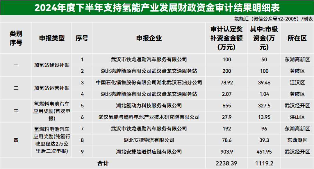 近日,武漢市(shi)經濟和(he)信(xin)息化局發布《關于2024年(nian)度下半年(nian)支(zhi)持(chi)氫(qing)能(neng)產業(ye)發展財政資(zi)金審計(ji)結果(guo)的公示》,認定7家(jia)企業(ye)獲批支(zhi)持(chi)氫(qing)能(neng)產業(ye)發展財政資(zi)金共計(ji)2238.39萬元,其(qi)中市(shi)級資(zi)金1119.2萬元。