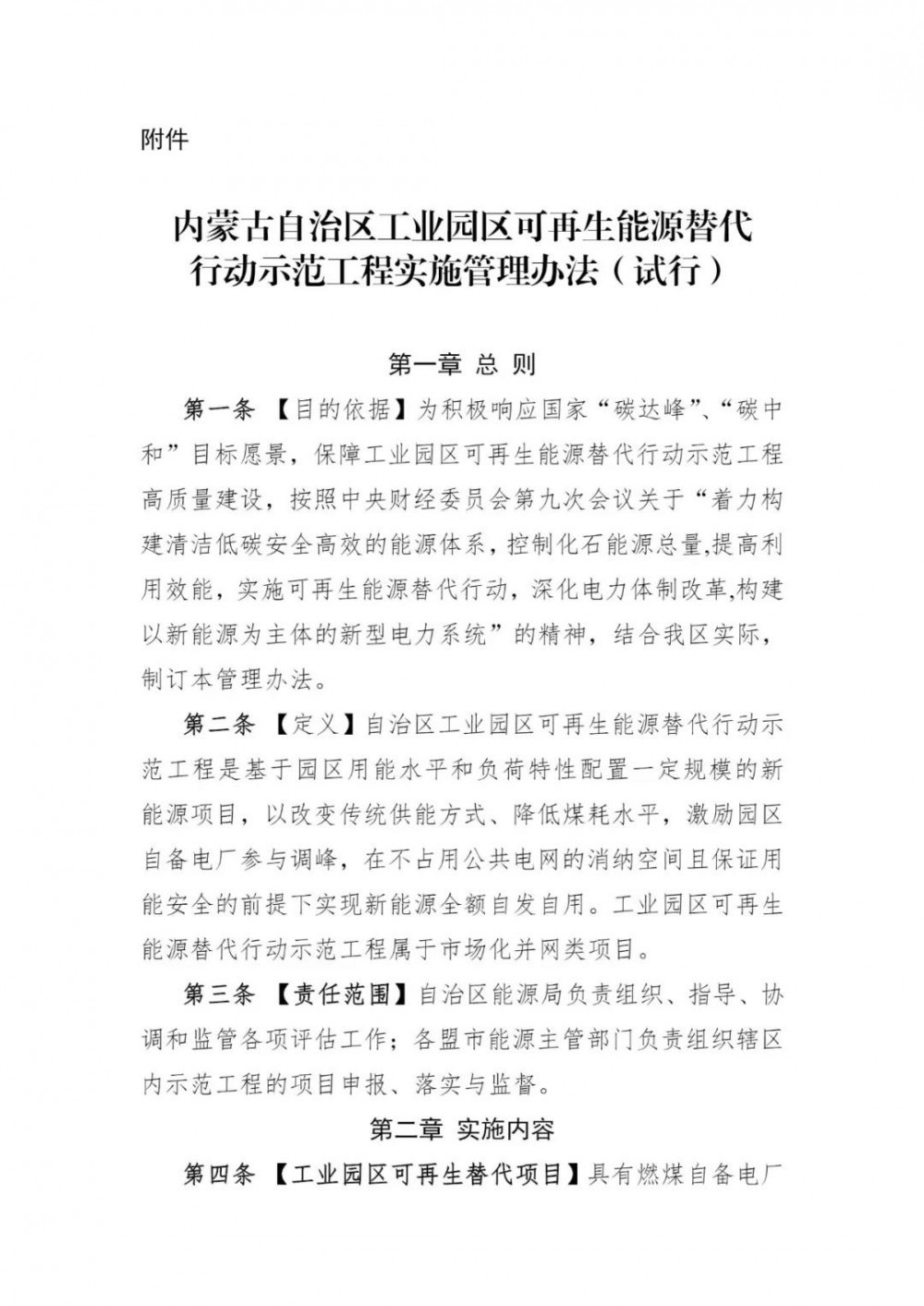 日前,內蒙(meng)古(gu)自(zi)(zi)治(zhi)區(qu)(qu)能(neng)(neng)(neng)源(yuan)局印發《內蒙(meng)古(gu)自(zi)(zi)治(zhi)區(qu)(qu)工(gong)業(ye)園(yuan)(yuan)(yuan)區(qu)(qu)可再生能(neng)(neng)(neng)源(yuan)替(ti)代(dai)行動(dong)示范(fan)(fan)工(gong)程實施管(guan)理(li)辦法(試行)》,實施內容(rong)為:【工(gong)業(ye)園(yuan)(yuan)(yuan)區(qu)(qu)可再生替(ti)代(dai)項(xiang)目(mu)】具(ju)有燃(ran)煤(mei)自(zi)(zi)備(bei)電(dian)廠的園(yuan)(yuan)(yuan)區(qu)(qu),充(chong)分挖掘園(yuan)(yuan)(yuan)區(qu)(qu)自(zi)(zi)備(bei)電(dian)廠靈活性調(diao)節(jie)能(neng)(neng)(neng)力和(he)負荷(he)(he)側響應(ying)能(neng)(neng)(neng)力,因地制宜推動(dong)風電(dian)、光(guang)伏項(xiang)目(mu)建(jian)設,鼓(gu)勵集中式(shi)(shi)與分布式(shi)(shi)并(bing)舉(ju),逐步實現園(yuan)(yuan)(yuan)區(qu)(qu)用(yong)能(neng)(neng)(neng)清潔(jie)化。 【零碳(tan)工(gong)業(ye)園(yuan)(yuan)(yuan)區(qu)(qu)示范(fan)(fan)項(xiang)目(mu)】鼓(gu)勵具(ju)備(bei)新(xin)增負荷(he)(he)的園(yuan)(yuan)(yuan)區(qu)(qu)開(kai)展零碳(tan)工(gong)業(ye)園(yuan)(yuan)(yuan)示范(fan)(fan)項(xiang)目(mu),以零碳(tan)用(yong)能(neng)(neng)(neng)為發展目(mu)標(biao),率先開(kai)展全清潔(jie)能(neng)(neng)(neng)源(yuan)供電(dian),提升園(yuan)(yuan)(yuan)區(qu)(qu)整體能(neng)(neng)(neng)效。園(yuan)(yuan)(yuan)區(qu)(qu)新(xin)增負荷(he)(he)供電(dian) 100%由新(xin)能(neng)(neng)(neng)源(yuan)電(dian)量(liang)構成,對于配套新(xin)能(neng)(neng)(neng)源(yuan)所(suo)(suo)發電(dian)量(liang)不能(neng)(neng)(neng)滿足園(yuan)(yuan)(yuan)區(qu)(qu)供電(dian)時,所(suo)(suo)購(gou)買電(dian)量(liang)需為可再生能(neng)(neng)(neng)源(yuan)綠電(dian),園(yuan)(yuan)(yuan)區(qu)(qu)應(ying)通(tong)過配置(zhi)儲能(neng)(neng)(neng)等措施,保(bao)證(zheng)與園(yuan)(yuan)(yuan)區(qu)(qu)負荷(he)(he)的匹配響應(ying)和(he)高比 例自(zi)(zi)平衡。 項目要(yao)求(qiu)為:主要(yao)按照新能(neng)(neng)(neng)(neng)(neng)(neng)源(yuan)配(pei)置規模(mo)、接(jie)入(ru)及消納(na)(na)方(fang)案(an)、調(diao)(diao)(diao)(diao)峰(feng)(feng)(feng)(feng)措施(shi)、前期(qi)工(gong)作、技術方(fang)案(an)等(deng)要(yao)素考(kao)慮。 (一)具(ju)(ju)(ju)有燃煤(mei)(mei)自(zi)(zi)備電(dian)(dian)廠(chang)的園(yuan)(yuan)(yuan)(yuan)區(qu)(qu)(qu),充分(fen)(fen)發揮調(diao)(diao)(diao)(diao)節作用(yong)(yong)(yong), 進行(xing)高比(bi)例可再生能(neng)(neng)(neng)(neng)(neng)(neng)源(yuan)用(yong)(yong)(yong)能(neng)(neng)(neng)(neng)(neng)(neng)替代,要(yao)求(qiu)配(pei)套新能(neng)(neng)(neng)(neng)(neng)(neng)源(yuan)裝(zhuang)(zhuang)機規模(mo)不高于(yu)園(yuan)(yuan)(yuan)(yuan)區(qu)(qu)(qu)內(nei)自(zi)(zi)備電(dian)(dian)廠(chang)調(diao)(diao)(diao)(diao)峰(feng)(feng)(feng)(feng)電(dian)(dian)量(liang)折算出的新能(neng)(neng)(neng)(neng)(neng)(neng)源(yuan)裝(zhuang)(zhuang)機(自(zi)(zi)備 電(dian)(dian)廠(chang)近(jin) 3 年平均利(li)用(yong)(yong)(yong)小時數(shu)×調(diao)(diao)(diao)(diao)峰(feng)(feng)(feng)(feng)容量(liang)÷新能(neng)(neng)(neng)(neng)(neng)(neng)源(yuan)平均發電(dian)(dian)小時數(shu)(按照自(zi)(zi)治區(qu)(qu)(qu)東部(bu)(bu)、西部(bu)(bu)地(di)(di)區(qu)(qu)(qu)上一年的風電(dian)(dian)、光伏發電(dian)(dian)平均利(li)用(yong)(yong)(yong)小時數(shu)分(fen)(fen)別(bie)計(ji)(ji)算),且與(yu)自(zi)(zi)備燃煤(mei)(mei)火電(dian)(dian)廠(chang)調(diao)(diao)(diao)(diao)節后(hou)的最(zui)大(da) 出力(li)不得(de)(de)超出原自(zi)(zi)備燃煤(mei)(mei)火電(dian)(dian)運行(xing)的最(zui)大(da)出力(li)。優先實施(shi)園(yuan)(yuan)(yuan)(yuan)區(qu)(qu)(qu)存量(liang)傳統(tong)能(neng)(neng)(neng)(neng)(neng)(neng)源(yuan)替代。 (二) 要(yao)求(qiu)新能(neng)(neng)(neng)(neng)(neng)(neng)源(yuan)項目直接(jie)接(jie)入(ru)園(yuan)(yuan)(yuan)(yuan)區(qu)(qu)(qu)變電(dian)(dian)站(zhan),新能(neng)(neng)(neng)(neng)(neng)(neng)源(yuan)所(suo)發電(dian)(dian)量(liang)全部(bu)(bu)在園(yuan)(yuan)(yuan)(yuan)區(qu)(qu)(qu)內(nei)自(zi)(zi)發自(zi)(zi)用(yong)(yong)(yong),不得(de)(de)向公共電(dian)(dian)網送電(dian)(dian),不占(zhan)用(yong)(yong)(yong)電(dian)(dian)網消納(na)(na)空間。自(zi)(zi)備電(dian)(dian)廠(chang)檢修、用(yong)(yong)(yong)電(dian)(dian)企業減產(chan)和(he)停產(chan)的情況(kuang)下(xia),在征得(de)(de)政府(fu)部(bu)(bu)門、監(jian)管機構和(he)電(dian)(dian)網相關部(bu)(bu)門同意(yi)并完成(cheng)相關手續(xu)后(hou),可參與(yu)市場化交(jiao)易。 (三) 園(yuan)(yuan)(yuan)(yuan)區(qu)(qu)(qu)應(ying)具(ju)(ju)(ju)備自(zi)(zi)備電(dian)(dian)廠(chang)、儲(chu)能(neng)(neng)(neng)(neng)(neng)(neng)、可調(diao)(diao)(diao)(diao)節負(fu)荷(he)(he)等(deng)相關調(diao)(diao)(diao)(diao)峰(feng)(feng)(feng)(feng)措施(shi),充分(fen)(fen)挖掘負(fu)荷(he)(he)側調(diao)(diao)(diao)(diao)節能(neng)(neng)(neng)(neng)(neng)(neng)力(li),對擬接(jie)入(ru)的新能(neng)(neng)(neng)(neng)(neng)(neng)源(yuan)項目具(ju)(ju)(ju)備自(zi)(zi)我調(diao)(diao)(diao)(diao)節能(neng)(neng)(neng)(neng)(neng)(neng)力(li)。 (四(si))申報(bao)園(yuan)(yuan)(yuan)(yuan)區(qu)(qu)(qu)需(xu)取得(de)(de)政府(fu)各部(bu)(bu)門出具(ju)(ju)(ju)的項目不占(zhan)用(yong)(yong)(yong)林地(di)(di)、生態(tai)紅(hong)線情況(kuang)等(deng)支持性文件。申報(bao)園(yuan)(yuan)(yuan)(yuan)區(qu)(qu)(qu)需(xu)與(yu)自(zi)(zi)備電(dian)(dian)廠(chang)企業簽訂合作協議等(deng)。 (五(wu))對項目技術方(fang)案(an)設計(ji)(ji)及配(pei)置、風光儲(chu)荷(he)(he)耦合特性分(fe