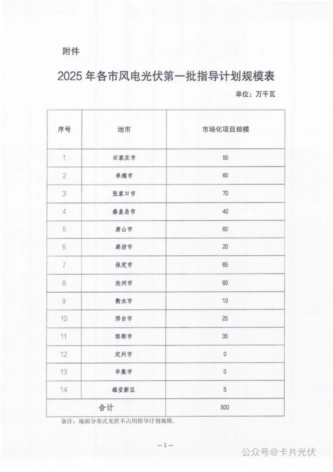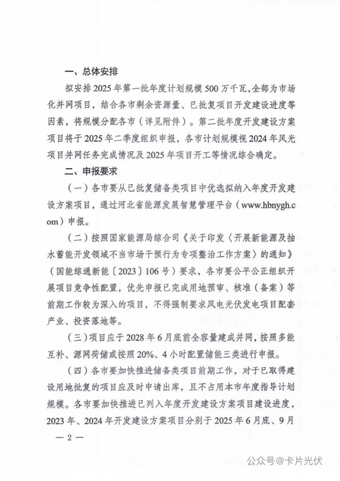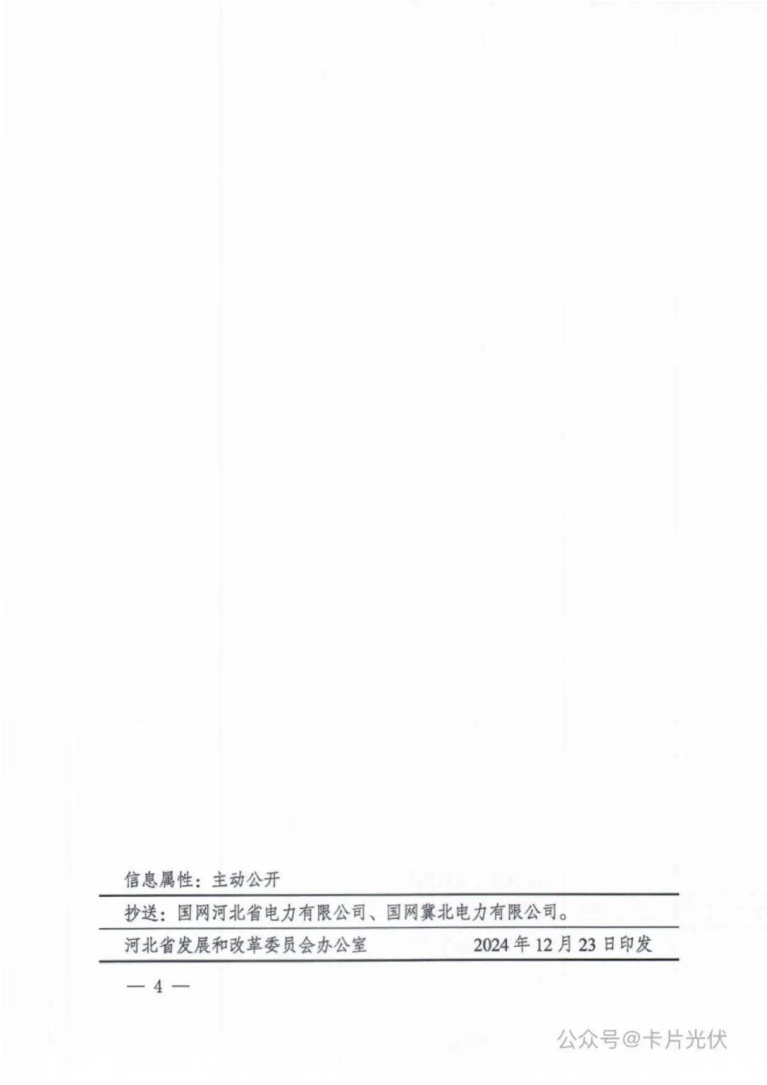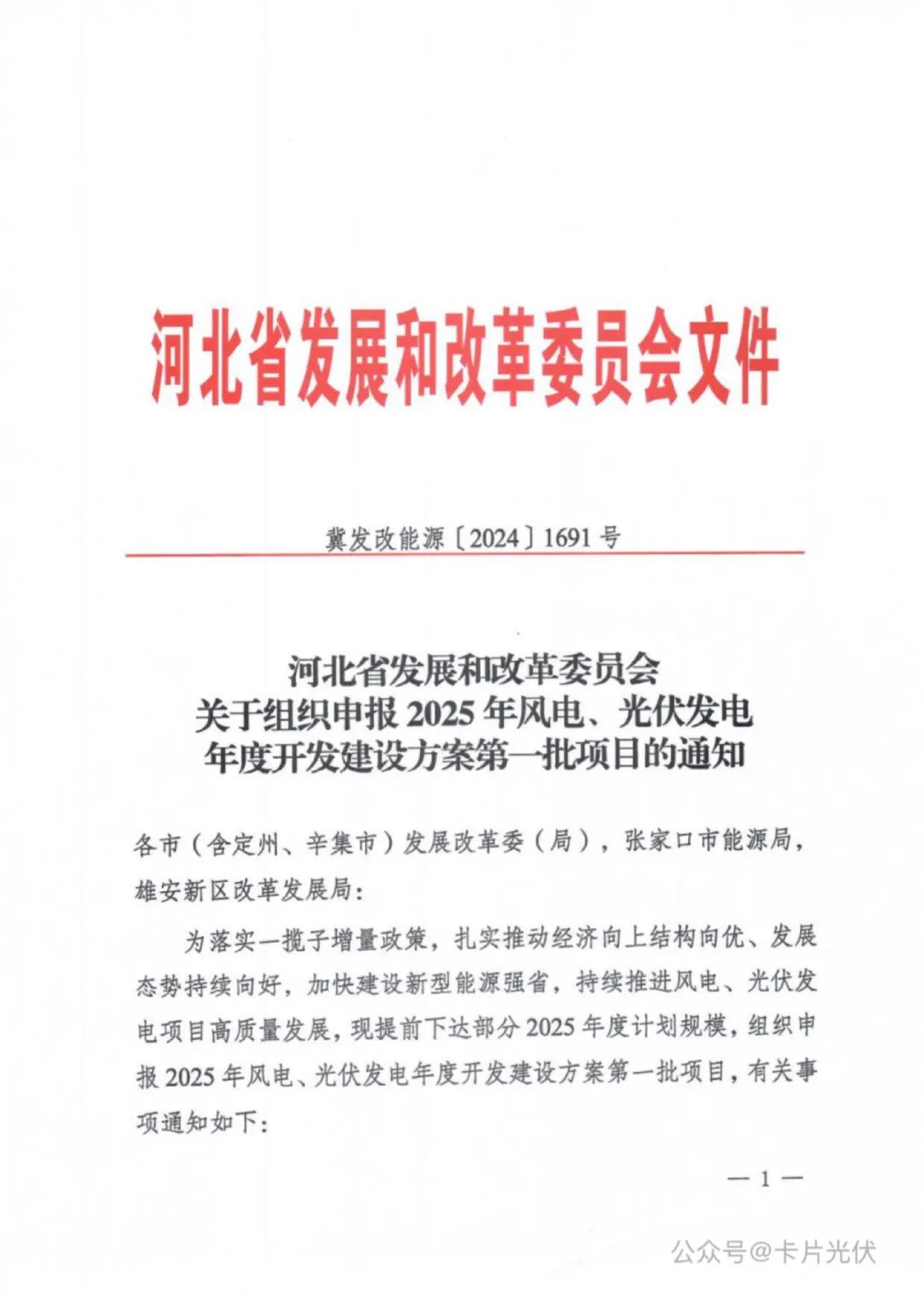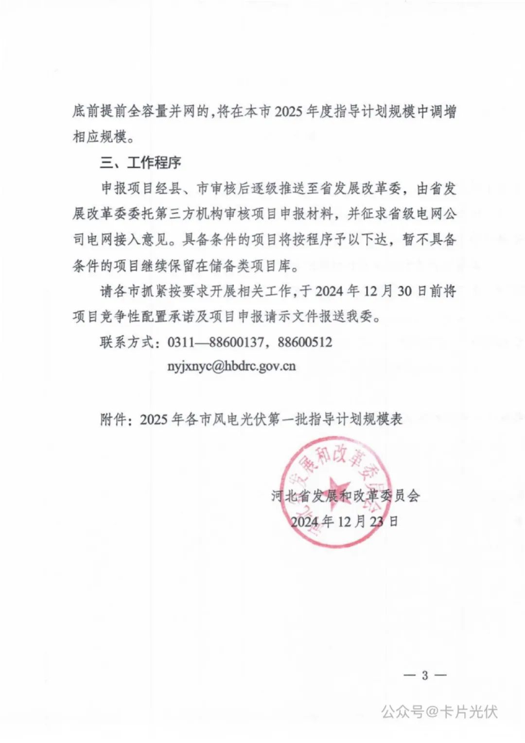 2024年12月23日(ri),河北省(sheng)發(fa)展和改革委員會發(fa)布《關于組(zu)織申報2025年風電、光伏發(fa)電年度開發(fa)建設方案第(di)一批項目的通知》。 通(tong)知提到,擬安(an)排2025年(nian)第(di)一(yi)批年(nian)度計劃規模(mo)500萬千(qian)瓦,全部為(wei)市場化并網項目(mu)。 第(di)二批年(nian)(nian)度開發建設方(fang)案項(xiang)目(mu)(mu)將于2025年(nian)(nian)二季度組織(zhi)申報,各市計劃規(gui)模視2024年(nian)(nian)風光項(xiang)目(mu)(mu)并網任務完成情(qing)況及 2025年(nian)(nian)項(xiang)目(mu)(mu)開工等情(qing)況綜(zong)合確定。 項目應于2028年6月底前全容量(liang)建成并網(wang),按(an)照多能(neng)(neng)互補、源網(wang)荷儲或按(an)照20%、4小時配置儲能(neng)(neng)三類(lei)進行(xing)申(shen)報。 各市要加快推進(jin)(jin)已列入年(nian)度開發(fa)建設方案項目建設進(jin)(jin)度,2023年(nian)、2024年(nian)開發(fa)建設方案項目分別于2025年(nian)6月底、9月底前(qian)提前(qian)全(quan)容量(liang)并網的,將在本(ben)市2025年(nian)度指(zhi)導計劃規模中調增相應(ying)規模。 文件原文如下: