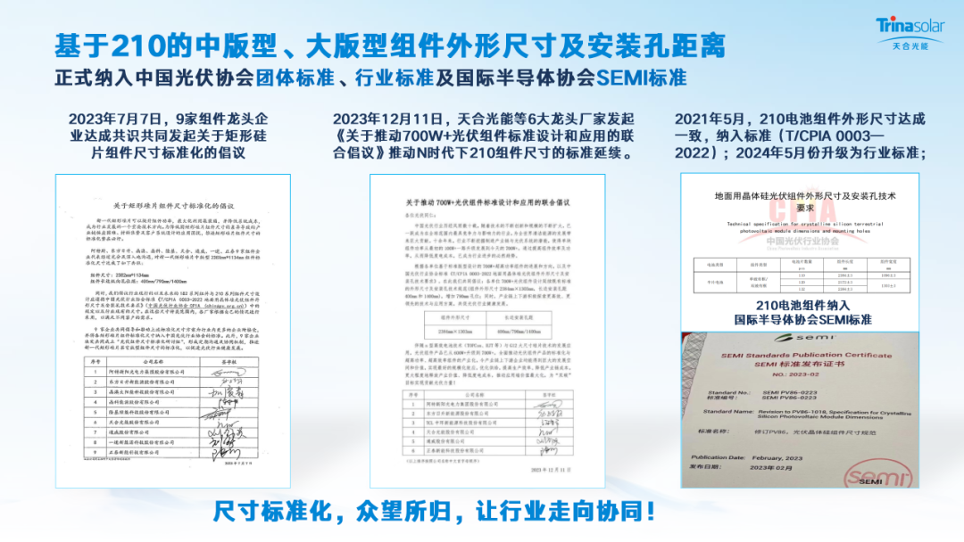 12月25日,由中國(guo)光(guang)伏(fu)行(xing)業(ye)(ye)協會(hui)(hui)(hui)指導,天合光(guang)能(neng)主辦(ban)的“精準把脈,創(chuang)(chuang)新(xin)(xin)引(yin)領(ling),210五周(zhou)年生態創(chuang)(chuang)新(xin)(xin)分享大會(hui)(hui)(hui)”圓滿舉辦(ban)。中國(guo)光(guang)伏(fu)行(xing)業(ye)(ye)協會(hui)(hui)(hui)名譽(yu)理事長王勃華、長三角太(tai)陽能(neng)光(guang)伏(fu)技術創(chuang)(chuang)新(xin)(xin)中心主任沈(shen)輝教授、天合光(guang)能(neng)副董事長、聯席總裁高紀(ji)慶(qing)發(fa)(fa)表致辭。210產業(ye)(ye)生態企業(ye)(ye)及機構代表齊聚(ju)蘇州,共同回顧(gu)行(xing)業(ye)(ye)為210產業(ye)(ye)生態的奮(fen)斗(dou)過(guo)程(cheng),探(tan)討光(guang)伏(fu)行(xing)業(ye)(ye)協同創(chuang)(chuang)新(xin)(xin)模式。與(yu)會(hui)(hui)(hui)企業(ye)(ye)還發(fa)(fa)出(chu)產業(ye)(ye)高質(zhi)量發(fa)(fa)展(zhan)倡議,推動友好(hao)型光(guang)伏(fu)生態,實現產業(ye)(ye)高質(zhi)量發(fa)(fa)展(zhan)。 從0到380GW,210組件引領功率500W-600W-700W三連跳 從(cong)2020年(nian)天合光(guang)能(neng)發布(bu)行業首款210組件(jian)(jian),到2023年(nian)一季度,行業210組件(jian)(jian)出(chu)貨(huo)(huo)超120GW,到2023年(nian)11月,天合光(guang)能(neng)210組件(jian)(jian)出(chu)貨(huo)(huo)超100GW,再到2024年(nian)12月,預計(ji)行業210組件(jian)(jian)出(chu)貨(huo)(huo)近380GW,其(qi)中天合光(guang)能(neng)210組件(jian)(jian)預計(ji)出(chu)貨(huo)(huo)超170GW,在天合光(guang)能(neng)的引領下,210組件(jian)(jian)出(chu)貨(huo)(huo)量(liang)和增長速度雙雙創下新高。 出貨量增長的背后是光伏(fu)行業的突破性(xing)進(jin)展——組件(jian)功(gong)率(lv)跨(kua)越式提(ti)升和(he)度(du)(du)電成本(ben)大幅(fu)下(xia)降。從210組件(jian)誕生到如今(jin)的5年(nian)時(shi)間,210引領光伏(fu)組件(jian)實現(xian)了500W到600W再到700W的功(gong)率(lv)躍升。而在過去(qu),組件(jian)功(gong)率(lv)提(ti)升100W需要(yao)8-9年(nian)時(shi)間。210系(xi)列(lie)組件(jian)集高(gao)功(gong)率(lv)、高(gao)效率(lv)、高(gao)可靠(kao)性(xing)、高(gao)發(fa)電量及低(di)(di)度(du)(du)電成本(ben)等“四高(gao)一低(di)(di)”核心要(yao)素(su)于一身,為(wei)光伏(fu)發(fa)電度(du)(du)電成本(ben)持續降低(di)(di)打開嶄(zhan)新的通(tong)道(dao),助力光伏(fu)行業順利開啟后平價時(shi)代。 從210到210R,從210+PERC到210+N:可持續的210平臺動力澎湃 通過對近40年(nian)硅片(pian)發展史的(de)研究(jiu),天合(he)光能敏銳地洞察到,新一(yi)代硅片(pian)面積(ji)必須(xu)要(yao)比上一(yi)代大50%以上,才能在未來十(shi)年(nian)保持主流(liu)地位,并(bing)前瞻性(xing)錨定210尺寸。此外,天合(he)光能針(zhen)對客戶的(de)應用場景、屋(wu)頂及土地限制、安裝(zhuang)成本(ben)、配套設備成本(ben)、相關法(fa)律法(fa)規、運輸工(gong)具等(deng)展開的(de)深度研究(jiu),突破慣(guan)性(xing)思維,創(chuang)新性(xing)推(tui)出210R矩(ju)形硅片(pian)組件。 作為210的(de)堅(jian)定推動者和引領(ling)者,天合(he)光(guang)能積極倡導組件尺寸(cun)(cun)標(biao)準化(hua),減少(shao)組件尺寸(cun)(cun)頻繁迭代(dai)帶來行業(ye)困擾(rao)。基于(yu)210的(de)中版型(xing)、大版型(xing)組件外(wai)形(xing)尺寸(cun)(cun)及(ji)安裝(zhuang)孔距離,正(zheng)式納入中國光(guang)伏(fu)協會團體(ti)標(biao)準、行業(ye)標(biao)準及(ji)國際半導體(ti)協會SEMI標(biao)準。 在開(kai)放、兼容(rong)、創新的210產品技術(shu)平臺(tai)上,光伏行業和天合光能(neng)不(bu)斷創新突破。在p型時代(dai),210組件實(shi)現了(le)功率500W、600W的突破。在n型時代(dai),天合光能(neng)成為行業首家實(shi)現700W+TOPCon組件量產的企業。 210的(de)可持續成(cheng)長(chang)性(xing)不止(zhi)于此。今年10月、11月,基(ji)(ji)于210R和(he)自主(zhu)研(yan)發的(de)n型TOPCon技術(shu)(shu),天合光(guang)能1個月內2次打破TOPCon世界紀(ji)錄,突(tu)破TOPCon發明機構的(de)效率“天花板(ban)”。值得(de)一提的(de)是,該技術(shu)(shu)可直接進(jin)入產(chan)業化,i-TOPCon Ultra技術(shu)(shu)最高效率達26.58%。未來,基(ji)(ji)于210產(chan)品技術(shu)(shu)平臺和(he)自主(zhu)研(yan)發的(de)i-TOPCon技術(shu)(shu),i-TOPCon電池(chi)效率將突(tu)破27%+。基(ji)(ji)于210產(chan)品技術(shu)(shu)平臺、n型TOPCon技術(shu)(shu)和(he)鈣(gai)鈦礦疊層(ceng),TOPCon+鈣(gai)鈦礦疊層(ceng)有望(wang)突(tu)破電池(chi)效率30%+,繼(ji)續引(yin)領(ling)800W+時代。 從39到近100:協同創新、利他共贏,打造光伏高質量發展新生態 從600W+光伏開(kai)放創(chuang)新(xin)生態聯盟(meng)成立之(zhi)初的(de)(de)39家企(qi)(qi)業到(dao)近100家成員企(qi)(qi)業,600W+聯盟(meng)企(qi)(qi)業共同(tong)構建了210完整的(de)(de)產業生態,開(kai)創(chuang)了光伏行(xing)(xing)業產業鏈(lian)協(xie)同(tong)創(chuang)新(xin)之(zhi)先河。聯盟(meng)秉持開(kai)放創(chuang)新(xin),協(xie)同(tong)發(fa)展的(de)(de)理念(nian),聯合產業鏈(lian)伙伴的(de)(de)力量,打通從研發(fa)、制造(zao)及應(ying)用環節(jie),加速600W+的(de)(de)產業化,為600W+全(quan)球(qiu)應(ying)用掃清障(zhang)礙。隨著行(xing)(xing)業邁入n型時代,聯盟(meng)于2023年底實現(xian)700W+領航升(sheng)級。 從(cong)210產(chan)(chan)業(ye)生(sheng)(sheng)態的(de)(de)構建到600W+、700W+光伏開放創(chuang)(chuang)新(xin)生(sheng)(sheng)態聯盟(meng)的(de)(de)成(cheng)立,天(tian)合(he)光能(neng)一直秉承“利他”精神,與行業(ye)分享研究(jiu)成(chen