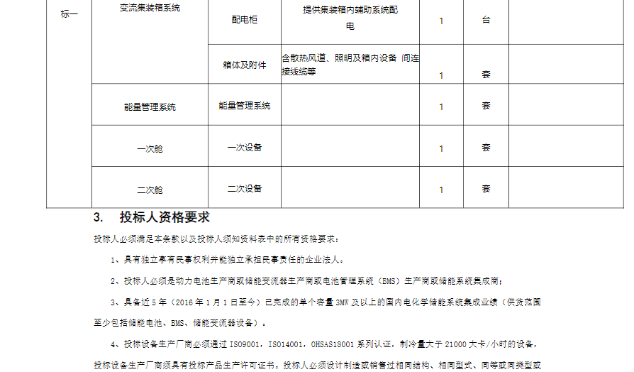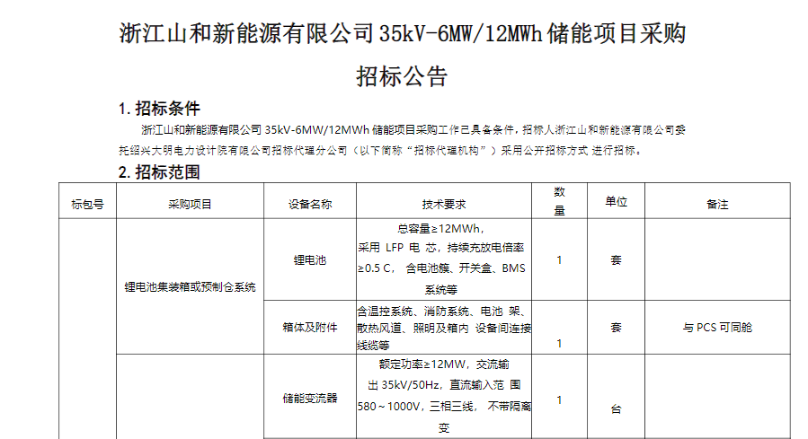 浙(zhe)江(jiang)山(shan)和新能源儲(chu)能項目采購正在進行招標,要求(qiu)投標人具(ju)備近5年(2016年1月1日至今)已完成的(de)單(dan)個容量3MW及(ji)以上(shang)的(de)國內電化學儲(chu)能系(xi)統集成業績(供(gong)貨(huo)范圍(wei)至少包(bao)括儲(chu)能電池(chi)、BMS、儲(chu)能變流器設備)。