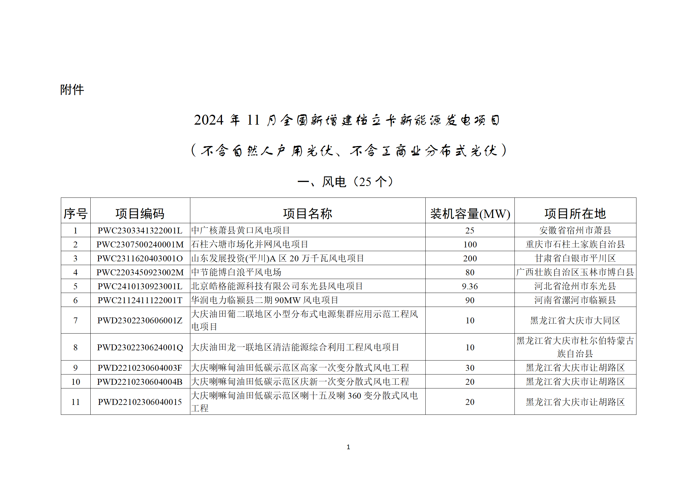12月25日,國(guo)(guo)家(jia)能(neng)源(yuan)局(ju)發(fa)(fa)(fa)(fa)布《關于(yu)2024年11月全國(guo)(guo)新(xin)增(zeng)建(jian)(jian)檔(dang)立卡新(xin)能(neng)源(yuan)發(fa)(fa)(fa)(fa)電(dian)(不含自(zi)然(ran)人戶用(yong)光伏(fu))項(xiang)(xiang)(xiang)目(mu)情(qing)況的(de)公告》。 2024年11月,全國(guo)(guo)新(xin)增(zeng)建(jian)(jian)檔(dang)立卡新(xin)能(neng)源(yuan)發(fa)(fa)(fa)(fa)電(dian)(不含自(zi)然(ran)人戶用(yong)光伏(fu))項(xiang)(xiang)(xiang)目(mu)共16488個(ge)(ge),其中風電(dian)項(xiang)(xiang)(xiang)目(mu)25個(ge)(ge),光伏(fu)發(fa)(fa)(fa)(fa)電(dian)項(xiang)(xiang)(xiang)目(mu)16448個(ge)(ge)(集(ji)中式光伏(fu)發(fa)(fa)(fa)(fa)電(dian)項(xiang)(xiang)(xiang)目(mu)35個(ge)(ge),工商(shang)業分布式光伏(fu)發(fa)(fa)(fa)(fa)電(dian)項(xiang)(xiang)(xiang)目(mu)16413個(ge)(ge)),生物質(zhi)發(fa)(fa)(fa)(fa)電(dian)項(xiang)(xiang)(xiang)目(mu)15個(ge)(ge)。 原文見下: 關于2024年11月全國新增建檔立卡新能源發電(不含自然人戶用光伏)項目情況的公告 2024年11月,全(quan)國(guo)(guo)新增建檔立卡新能(neng)源發(fa)電(dian)(不含自然人(ren)戶(hu)用光(guang)(guang)(guang)伏(fu)(fu))項(xiang)目(mu)共16488個(ge)(ge),其(qi)中風電(dian)項(xiang)目(mu)25個(ge)(ge),光(guang)(guang)(guang)伏(fu)(fu)發(fa)電(dian)項(xiang)目(mu)16448個(ge)(ge)(集中式光(guang)(guang)(guang)伏(fu)(fu)發(fa)電(dian)項(xiang)目(mu)35個(ge)(ge),工(gong)商業分布式光(guang)(guang)(guang)伏(fu)(fu)發(fa)電(dian)項(xiang)目(mu)16413個(ge)(ge)),生物(wu)質發(fa)電(dian)項(xiang)目(mu)15個(ge)(ge)。風電(dian)、集中式光(guang)(guang)(guang)伏(fu)(fu)發(fa)電(dian)、生物(wu)質發(fa)電(dian)項(xiang)目(mu)清(qing)單見附件,工(gong)商業分布式光(guang)(guang)(guang)伏(fu)(fu)發(fa)電(dian)項(xiang)目(mu)清(qing)單詳見國(guo)(guo)家可再生能(neng)源發(fa)電(dian)項(xiang)目(mu)信息管理平臺網站(網址//djfj.renewable.org.cn/default/pub/tz/jdlknotice202411.html)。 下一篇: 山西電力中長期交易實施細則公布