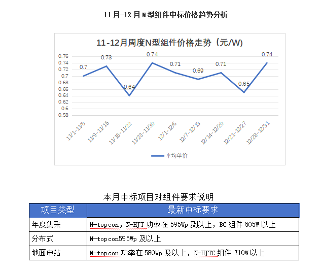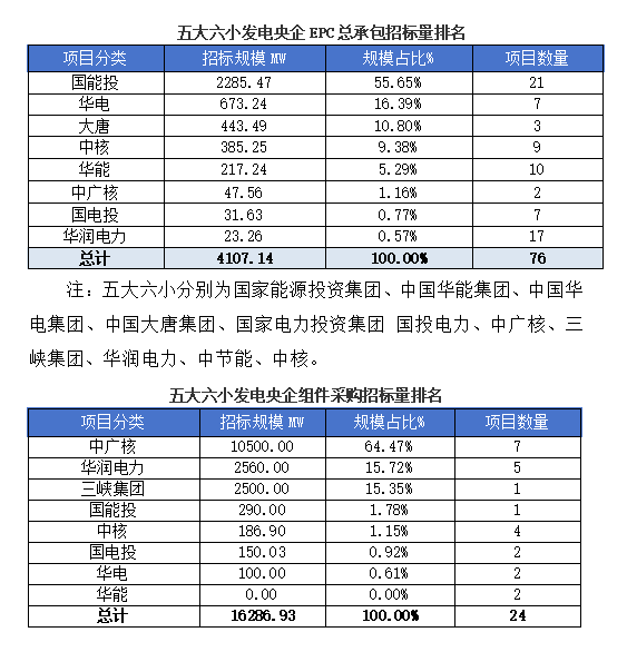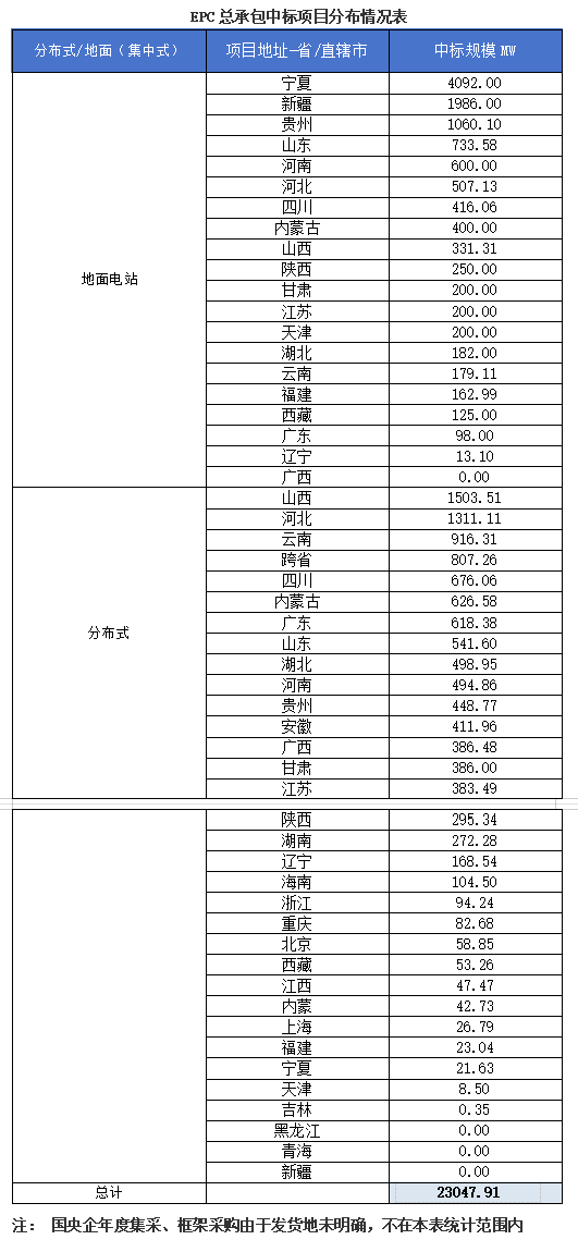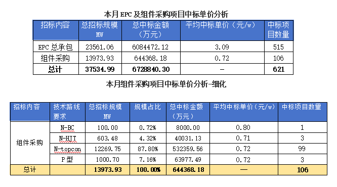 一、光伏項目招標情況匯總: 根據Gessey蓋錫咨詢統計,12月(yue)1日-12月(yue)31日累計光伏招標(biao)(biao)項(xiang)(xiang)目為(wei)629個(ge)(ge),項(xiang)(xiang)目規模(mo)合計為(wei)44924.07 MW。光伏組件采購招標(biao)(biao)項(xiang)(xiang)目為(wei)113個(ge)(ge),招標(biao)(biao)規模(mo)為(wei)28595.50MW,EPC總承包招標(biao)(biao)項(xiang)(xiang)目為(wei)516個(ge)(ge),招標(biao)(biao)規模(mo)為(wei)16328.57MW。 我們統計包含(han)大型央企國企、地(di)方(fang)能源集團、地(di)方(fang)政府機關、兩大電網(wang)、央企總(zong)包企業、知名光伏企業等,其中五(wu)大六小發電央企占(zhan)總(zong)招標規(gui)模(mo)較高,具體各企業排名如下表: 二、中標項目分布類型匯總情況 本月中(zhong)(zhong)標(biao)項(xiang)目需(xu)求按照招(zhao)標(biao)場(chang)景地(di)分布,分布式光伏(fu)主(zhu)要(yao)(yao)集(ji)中(zhong)(zhong)在(zai)(zai)河北、四(si)川、湖北等(deng)地(di)區(qu),即主(zhu)要(yao)(yao)集(ji)中(zhong)(zhong)在(zai)(zai)中(zhong)(zhong)北部(bu)地(di)區(qu);集(ji)中(zhong)(zhong)式光伏(fu)主(zhu)要(yao)(yao)集(ji)中(zhong)(zhong)在(zai)(zai)寧夏、云南、遼寧、新疆(jiang)等(deng)地(di)區(qu),即主(zhu)要(yao)(yao)集(ji)中(zhong)(zhong)在(zai)(zai)西部(bu)地(di)區(qu)。 三、EPC總承包及組件采購情況匯總 本月光伏EPC總承包中(zhong)標(biao)規(gui)模達23561.06MW,總中(zhong)標(biao)金額644368.18萬元(yuan),平均中(zhong)標(biao)單價為3.09元(yuan)/W,中(zhong)標(biao)數量515個(ge)。 本(ben)月(yue)光(guang)伏組件采購中標規模達13973.93 MW,總(zong)中標金額6084472.12萬元,平均(jun)中標單(dan)價為0.72元/W,中標數量(liang)106個(ge)。 下一篇: Gessey:1月3日每日光伏市場行情