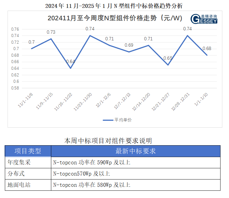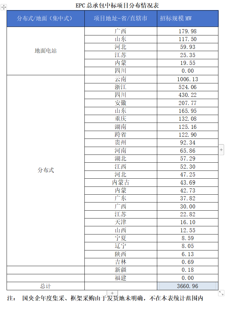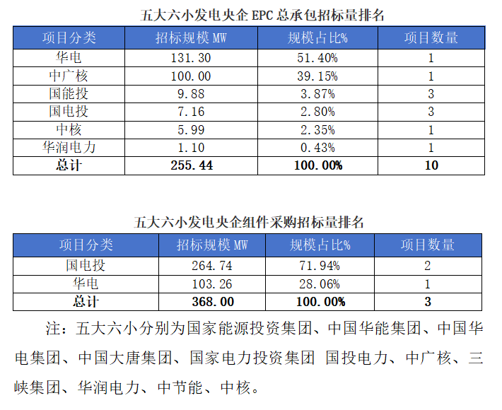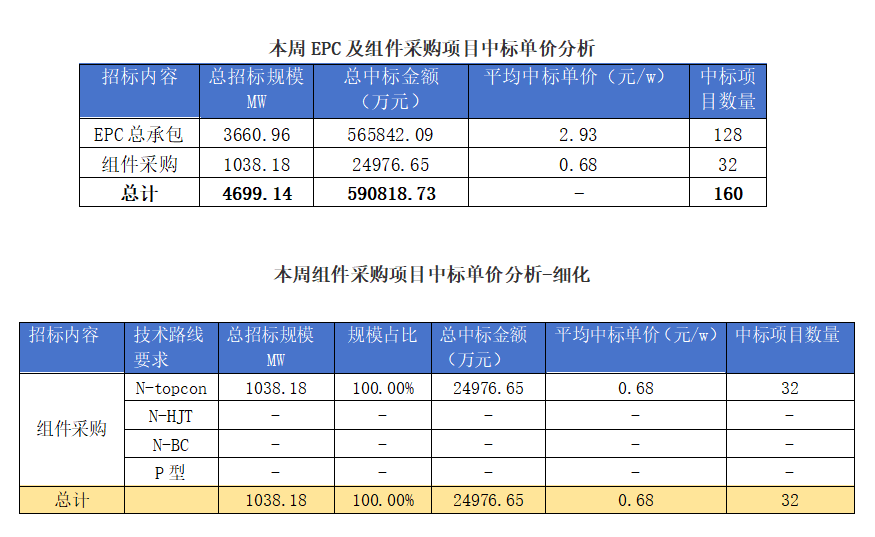 一、光伏項目招標情況匯總: 根據Gessey蓋(gai)錫(xi)咨詢(xun)統計,1月(yue)1日-1月(yue)10日累計光伏招標(biao)項(xiang)(xiang)目(mu)(mu)為(wei)139個(ge),項(xiang)(xiang)目(mu)(mu)規模(mo)合計為(wei)3738.01 MW。光伏組件采購招標(biao)項(xiang)(xiang)目(mu)(mu)為(wei)25個(ge),招標(biao)規模(mo)為(wei)1122.14MW,EPC總承(cheng)包(bao)招標(biao)項(xiang)(xiang)目(mu)(mu)為(wei)114個(ge),招標(biao)規模(mo)為(wei)2615.88MW。 我們統計包(bao)(bao)含大型(xing)央(yang)企(qi)國(guo)企(qi)、地(di)(di)方能源集團、地(di)(di)方政府機關、兩大電網、央(yang)企(qi)總包(bao)(bao)企(qi)業、知名光伏企(qi)業等,其(qi)中五大六(liu)小發電央(yang)企(qi)占總招標規模較高,具體各企(qi)業排(pai)名如下表(biao): 二、中標項目分布類型匯總情況 本周中(zhong)(zhong)標(biao)項目(mu)需求按照招標(biao)場景地(di)(di)分布,分布式(shi)光(guang)伏主(zhu)要(yao)集(ji)中(zhong)(zhong)在(zai)河(he)北(bei)、四川、湖北(bei)等地(di)(di)區(qu),即主(zhu)要(yao)集(ji)中(zhong)(zhong)在(zai)中(zhong)(zhong)北(bei)部(bu)地(di)(di)區(qu);集(ji)中(zhong)(zhong)式(shi)光(guang)伏主(zhu)要(yao)集(ji)中(zhong)(zhong)在(zai)寧夏(xia)、云南(nan)、遼(liao)寧、新疆等地(di)(di)區(qu),即主(zhu)要(yao)集(ji)中(zhong)(zhong)在(zai)西部(bu)地(di)(di)區(qu)。 三、EPC總承包及組件采購情況匯總 本周光伏EPC總(zong)承包中標(biao)規模達3660.96MW,總(zong)中標(biao)金(jin)額565842.09萬元(yuan)(yuan),平均中標(biao)單價為(wei)2.93元(yuan)(yuan)/W,中標(biao)數量128個(ge)。 本周光伏(fu)組(zu)件采購中(zhong)(zhong)標規(gui)模達1038.18 MW,總中(zhong)(zhong)標金額24976.65萬(wan)元,平均(jun)中(zhong)(zhong)標單價為0.68元/W,中(zhong)(zhong)標數(shu)量32個(ge)。 上一篇: Gessey:1月14日每日光伏市場行情
