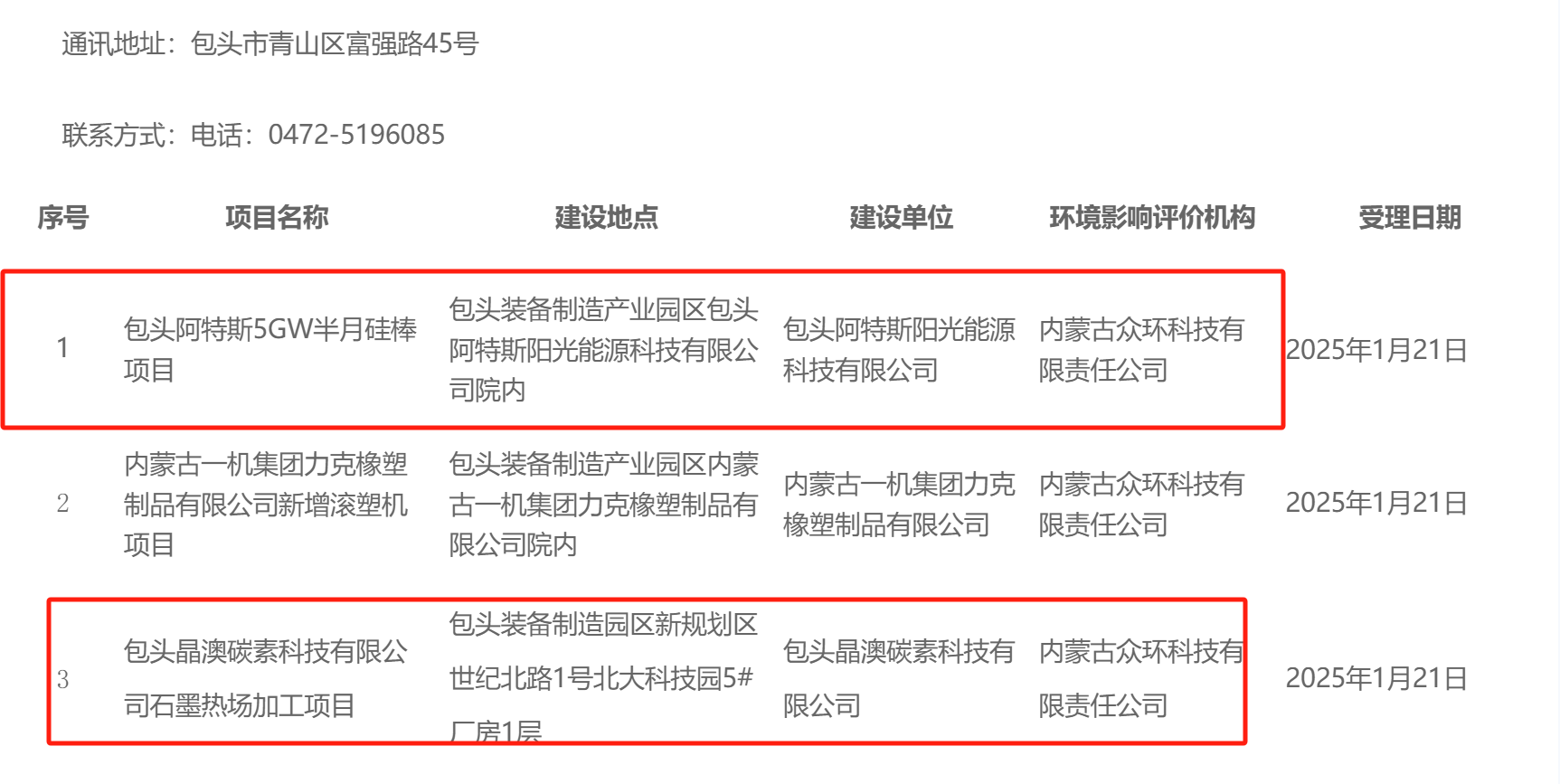 1月21日,內蒙古包頭市生態環境局披露了包頭阿特斯5GW半月硅棒項目和包頭晶澳碳素科技有限公司石墨熱場加工項目的環境影響評價文件。 1、包頭阿特斯5GW半月硅棒項目 根據文件顯示,阿特斯現有工程單晶硅生產的主要工序為拉棒、截斷、開方、磨倒、切片等,目前開方邊皮廢料全部經破碎后作為單晶硅生產原料重新回爐拉棒,這導致單晶硅方棒產量大大降低。為提升廠區整體經濟效益,阿特斯擬投資10,061萬元對現有工程單晶硅棒邊皮廢料進行加工再利用,在現有廠區內建設“包頭阿特斯5GW半月硅棒項目”。 包頭阿特斯5GW半月硅棒項目屬于新建項目,該項目位于內蒙古自治區包頭市青山區包頭裝備制造產業園區包頭阿特斯陽光能源科技有限公司廠區內,項目總投資10,061萬元,占地面積為600m2,施工工期為3個月。 該項目擬對產業園區現有104#車間進行改建,利用104#車間內西側3600m2空地建設半月硅棒生產線,主要建設內容包括:鑄錠方棒車間及其他配套設施;項目購置去弧頂開方機、去耳開方機、修面機、點膠機、清洗機、粘截一體機、磨倒機、方棒返切機等生產設備。項目建成后,可達年產5GW半月硅棒的生產規模。本項目勞動人員從現有工程人員中調配,不新增人員。 2、包頭晶澳碳素科技有限公司石墨熱場加工項目 包頭晶澳碳素科技有限公司石墨熱場加工項目位于內蒙古自治區包頭市青山區裝備制造園區新規劃區世紀北路1號北大科技園內,項目總投資1,000萬元,用地面積為1,615.86m2,施工工期為2個月。 該項目購置安裝數控車床、加工中心、數控銑床鋸床以及配套除塵裝置等設備設施41臺(套),年生產高純石墨熱場2000套。本項目勞動定員約50人,年運行300天,實行3班8小時工作制。 資料顯示,包頭晶澳碳素科技有限公司成立于2022年4月,法人代表為王沖普,經營范圍包括石墨及碳素制品制造;石墨及碳素制品銷售。該公司是晶澳集團旗下河北晶龍陽光設備有限公司全資投資的企業,主要產品以高純石墨為主。