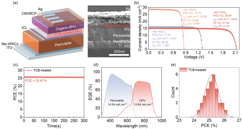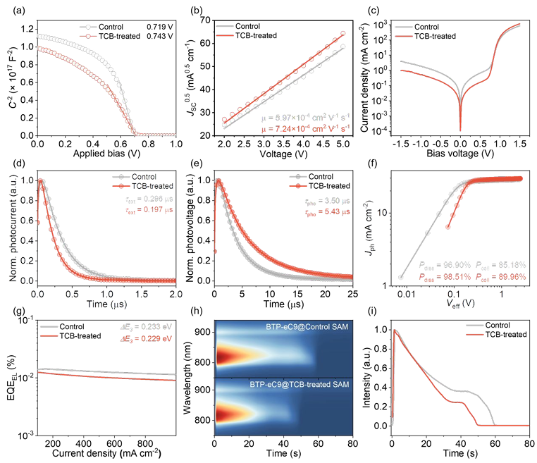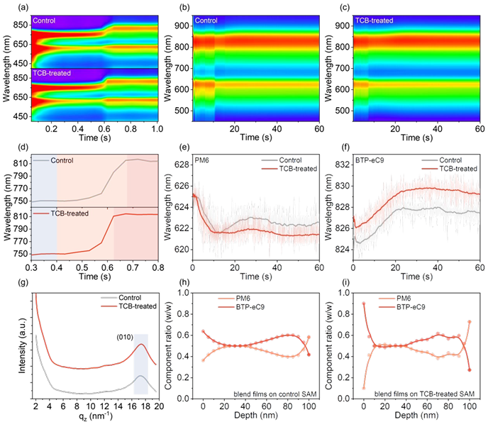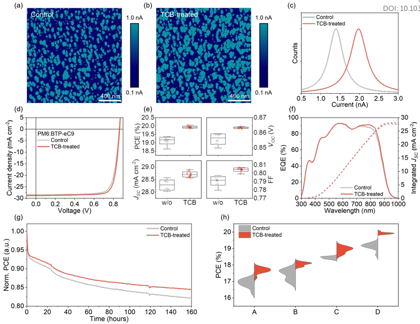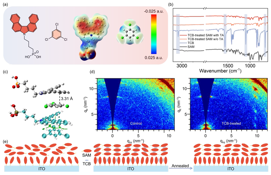 實現(xian)單(dan)(dan)結(jie)有(you)(you)機(ji)(ji)太陽能(neng)(neng)(neng)電(dian)池(chi)(chi)(OSC)和串聯(lian)太陽能(neng)(neng)(neng)電(dian)池(chi)(chi)(TSC)的(de)(de)高效(xiao)率(lv)在很(hen)大程度(du)上(shang)(shang)依賴于由具(ju)有(you)(you)有(you)(you)序(xu)正面排列的(de)(de)自(zi)組裝分子(SAM)構(gou)成的(de)(de)空(kong)穴傳(chuan)輸層(ceng)。鑒于此,2025年1月(yue)23日深圳職業(ye)技(ji)術(shu)大學(xue)胡漢林(lin)等于EES刊發從(cong)20%單(dan)(dan)結(jie)有(you)(you)機(ji)(ji)光伏到26%鈣鈦(tai)礦(kuang)/有(you)(you)機(ji)(ji)串聯(lian)疊(die)(die)層(ceng)太陽能(neng)(neng)(neng)電(dian)池(chi)(chi):自(zi)組裝空(kong)穴傳(chuan)輸分子至關重(zhong)要(yao)的(de)(de)研究成果(guo),利用SAM的(de)(de)π共軛骨架與具(ju)有(you)(you)相反電(dian)勢(shi)的(de)(de)揮發性(xing)固體(ti)添(tian)加(jia)(jia)劑之(zhi)間(jian)的(de)(de)相互作用,增(zeng)強了(le)SAM層(ceng)的(de)(de)有(you)(you)序(xu)堆疊(die)(die)。這(zhe)種方法誘導(dao)了(le)SAM層(ceng)的(de)(de)高度(du)有(you)(you)序(xu)堆疊(die)(die),這(zhe)通過多個X射(she)線散射(she)峰的(de)(de)存(cun)在和固體(ti)添(tian)加(jia)(jia)劑蒸(zheng)發后 Herman取(qu)向因(yin)子從(cong)0.402增(zeng)加(jia)(jia)到0.726得(de)到證實。這(zhe)種優(you)化不僅(jin)增(zeng)強了(le)空(kong)穴傳(chuan)輸性(xing)能(neng)(neng)(neng),而且還對上(shang)(shang)部活性(xing)層(ceng)的(de)(de)成膜動力學(xue)產生(sheng)了(le)積(ji)極影響,改善了(le)形貌和垂(chui)直相分離。結(jie)果(guo),在PM6:BTP-eC9二元有(you)(you)機(ji)(ji)太陽能(neng)(neng)(neng)電(dian)池(chi)(chi)中實現(xian)了(le)顯著的(de)(de)20.06%的(de)(de)能(neng)(neng)(neng)量轉(zhuan)換效(xiao)率(lv)(認證值(zhi)為19.24%),并(bing)在鈣鈦(tai)礦(kuang)-有(you)(you)機(ji)(ji)串聯(lian)太陽能(neng)(neng)(neng)電(dian)池(chi)(chi)(TSC)中進一步突破了(le)26.09%的(de)(de)效(xiao)率(lv)。