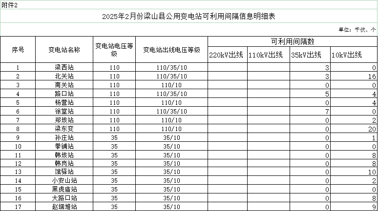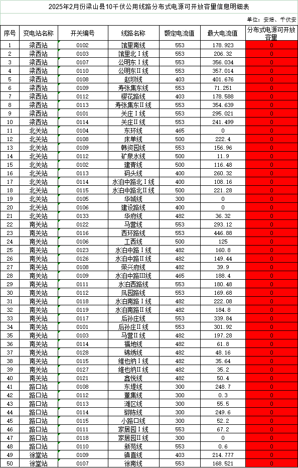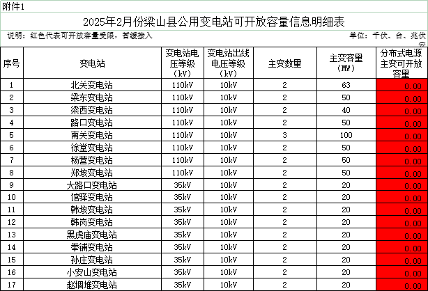2月6日,山東省濟寧市梁山縣發展和改革局發布《關于梁山縣2025年2月份分布式光伏可開放容量信息公開發布的公告》。 原文如下: 關于梁山縣2025年2月份分布式光伏可開放容量信息公開發布的公告 為積極響應國家“碳達峰、碳中和”戰略部署,推動新能源科學有序安全發展,促進分布式光伏就近消納和電力平衡,確保電力系統安全穩定運行和可靠供應,根據國家能源局《電網公平開放監管辦法》(國能發監管規【2021】49號)和國家能源局山東監管辦公室《關于切實做好分布式光伏并網運行工作的通知》(魯監能安全規【2021】94號)、梁山縣發展和改革局《關于進一步加強分布式光伏項目備案、建設及并網管理的意見》(梁發改【2022】1號)有關要求,我局會同縣供電公司對全縣光伏電站并網可開放容量進行分析,并建立月度定期對外公示制度,現將梁山縣2025年2月份變電站、公用線路、配電臺區分布式光伏可開放容量、變電站可利用間隔信息予以公布。以上數據截止到2025年1月31日,實時可開放容量以供電公司查詢為準。 特此公告。