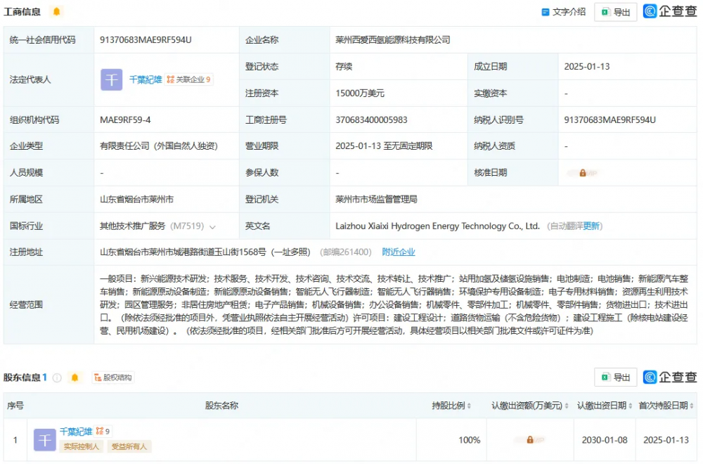 近日,萊州西愛西氫能源(yuan)科技有限公司成(cheng)立(li),法(fa)定代(dai)表人為(wei)(wei)千(qian)葉(xie)紀(ji)雄,注冊資(zi)本(ben)為(wei)(wei)15000萬美元(yuan)。 包括(kuo)萊州(zhou)西愛西氫能(neng)源科技有限公(gong)司在內(nei),國內(nei)已(yi)有四(si)家西愛西氫能(neng)源科技有限公(gong)司。 其他(ta)三家分別為(wei)山東西愛西氫(qing)能源科技(ji)有限(xian)(xian)公(gong)(gong)司(si)、上海西愛西氫(qing)能源科技(ji)有限(xian)(xian)公(gong)(gong)司(si)、江(jiang)蘇西愛西氫(qing)能源科技(ji)有限(xian)(xian)公(gong)(gong)司(si)。 此前(qian),上(shang)海西愛(ai)西氫(qing)(qing)(qing)(qing)(qing)能源(yuan)(yuan)科(ke)技有限公司(以下簡稱CIC)執行(xing)董事表示,CIC從十年前(qian)開始進入這場能源(yuan)(yuan)革命,從制氫(qing)(qing)(qing)(qing)(qing),儲氫(qing)(qing)(qing)(qing)(qing),到加氫(qing)(qing)(qing)(qing)(qing)一體化70Mpa撬裝式設備、82MPa高(gao)壓儲罐(guan)、150Kw氫(qing)(qing)(qing)(qing)(qing)燃料電池(chi)堆、70Mpa氫(qing)(qing)(qing)(qing)(qing)燃料電池(chi)車汽(qi)(qi)車和氫(qing)(qing)(qing)(qing)(qing)燃料電池(chi)無(wu)人(ren)機,氫(qing)(qing)(qing)(qing)(qing)能產(chan)(chan)業鏈上(shang)中(zhong)下游正在進行(xing)全產(chan)(chan)業組合(he)。同時(shi),建立了西愛(ai)西氫(qing)(qing)(qing)(qing)(qing)燃料電池(chi)汽(qi)(qi)車研(yan)究院(yuan)、西愛(ai)西氫(qing)(qing)(qing)(qing)(qing)能源(yuan)(yuan)技術研(yan)發(fa)中(zhong)心等機構。 上一篇: 惠生工程與海德氫能簽署戰略合作協議